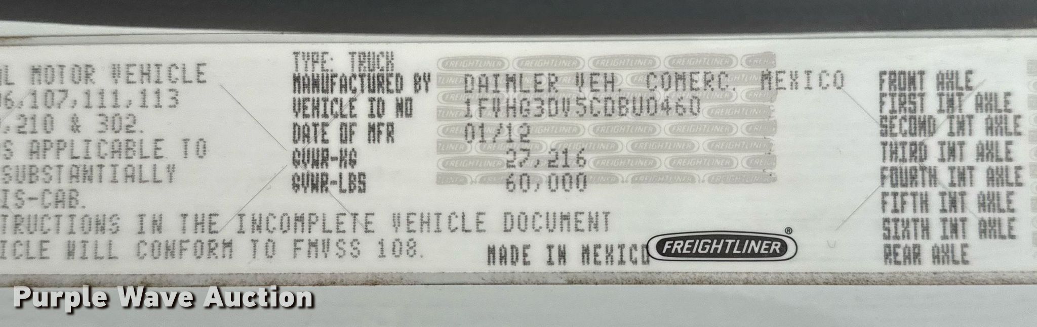 Purple Wave is selling a used Crane Truck in Oklahoma. This item is a 2012 Freightliner 114SD crane truck with the following: Miles: 177,934 on odometer, Engine hours: 8,373 on meter, VIN: 1FVHG3DV5CDBU0460