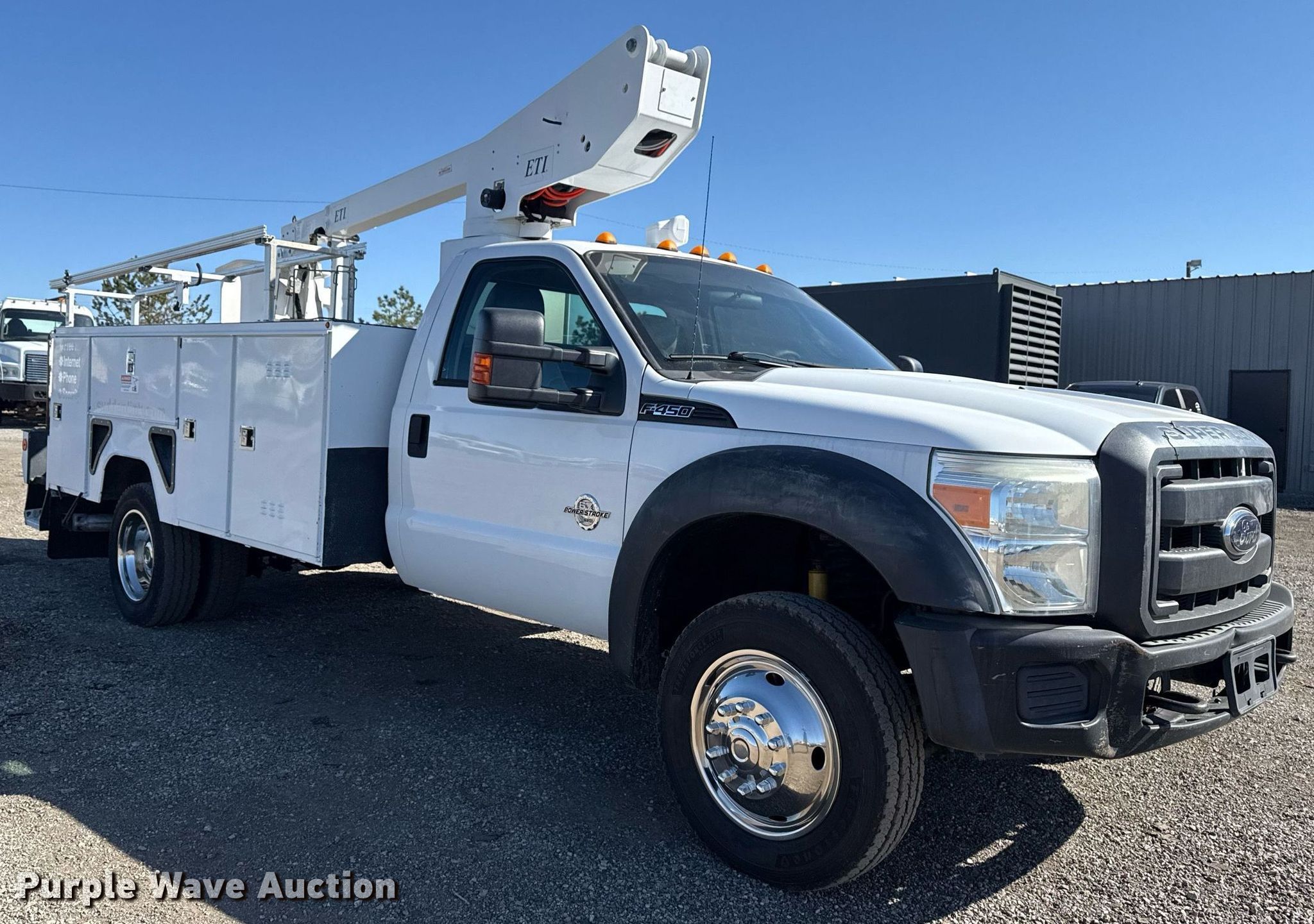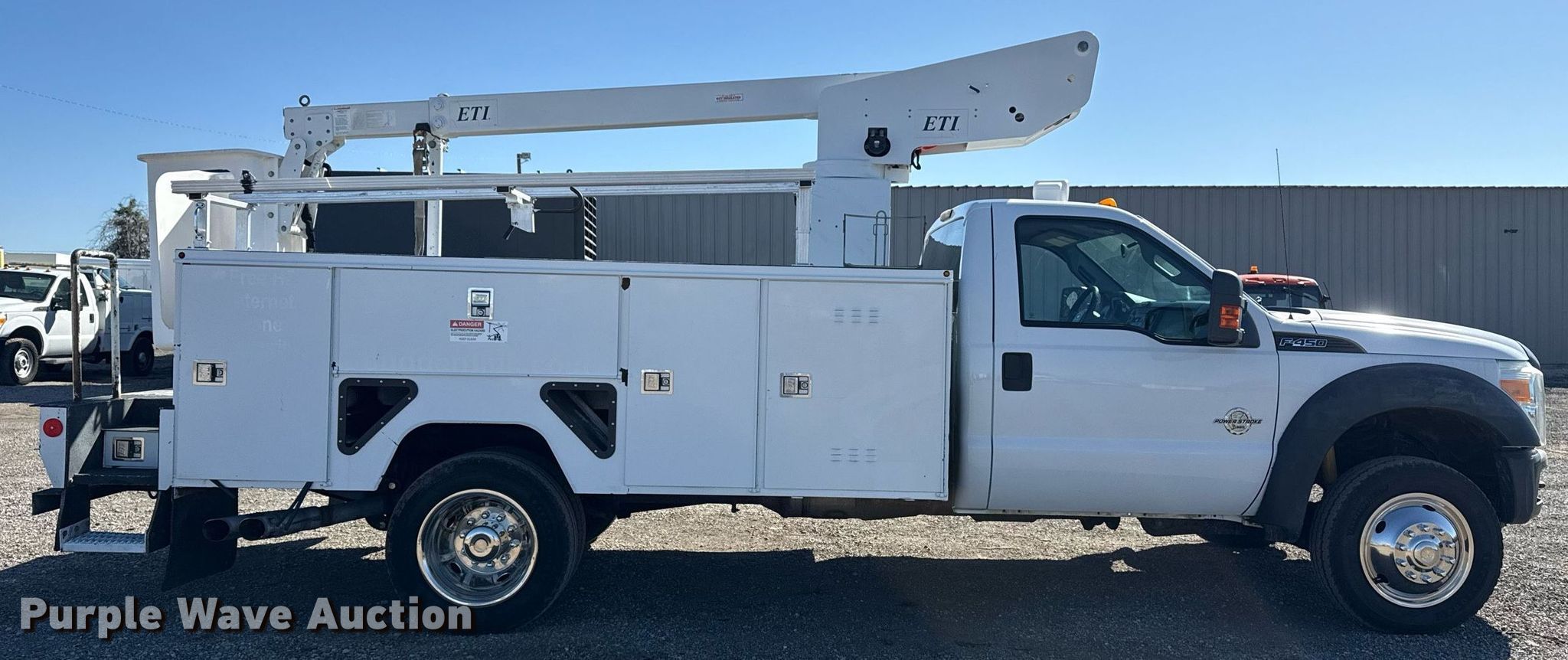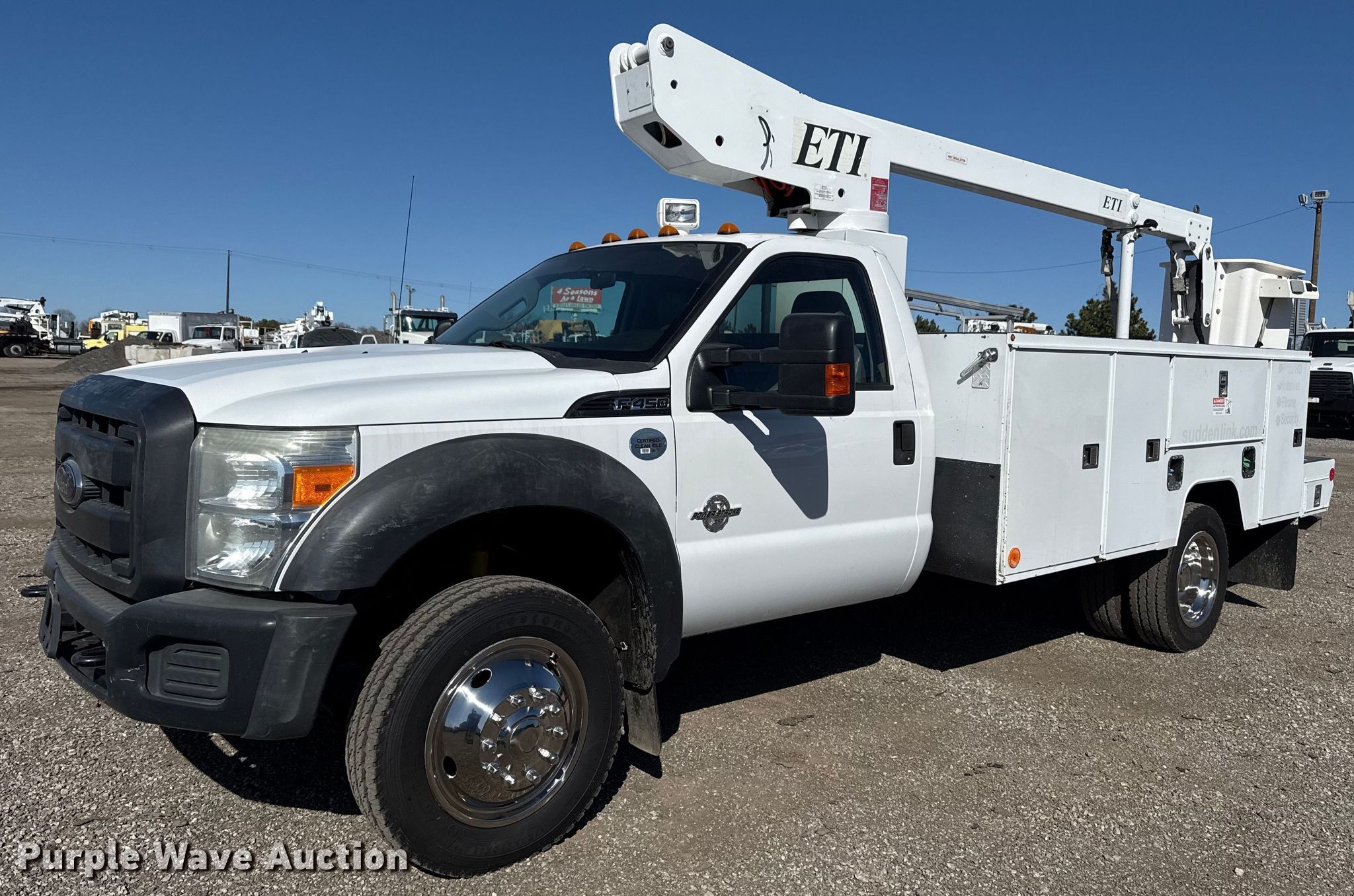 2012 Ford F450 Super Duty bucket truck. Miles: 174,195 on odometer, VIN: 1FDUF4GT0CEB74869. Engine Displacement: 6.7L, Cylinders: 8, Fuel type: Diesel. Transmission Automatic. Chassis Axles: Single, Suspension: Spring, Brakes: Hydraulic, PTO. Interior AC, Heat, Heated mirrors, Power windows, Power locks, Auxiliary controls. Features Bed ETI SB132DD96B24N, Serial: 14834, 11' L x 96" W, Boom 2002 ETI ETT29SNT, Serial: 0612T99375, Maximum lift capacity: 350 lbs, Maximum lift height: 29', Boom type: Telescopic, Man basket, Boom controls Ground, Platform/ basket.. Tires Size: 225/70R19.5. Notes Driver side exterior mirror glass missing. Oklahoma title. Seller is an Oklahoma licensed motor vehicle dealer. Title will be assigned and distributed by the dealer. Please contact the seller for distribution questions. Title distribution may be delayed up to 30 days from verification of funds. 15107 North 137th East Avenue. Collinsville, OK 74021