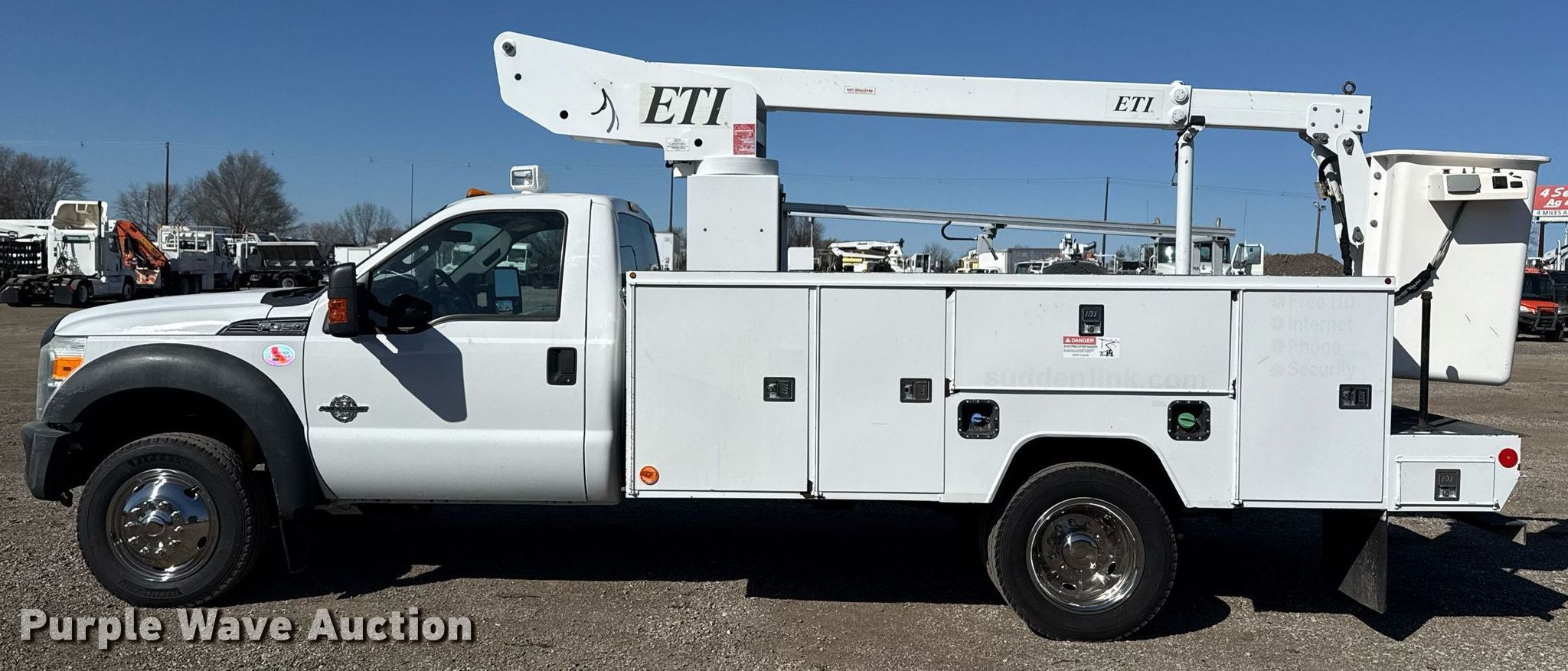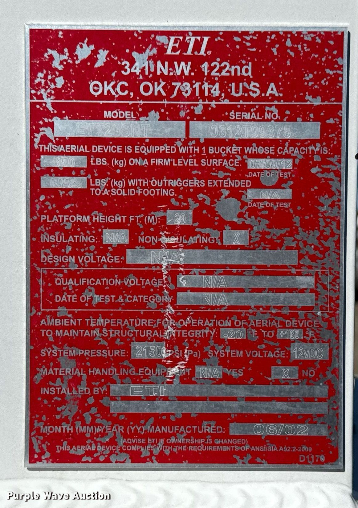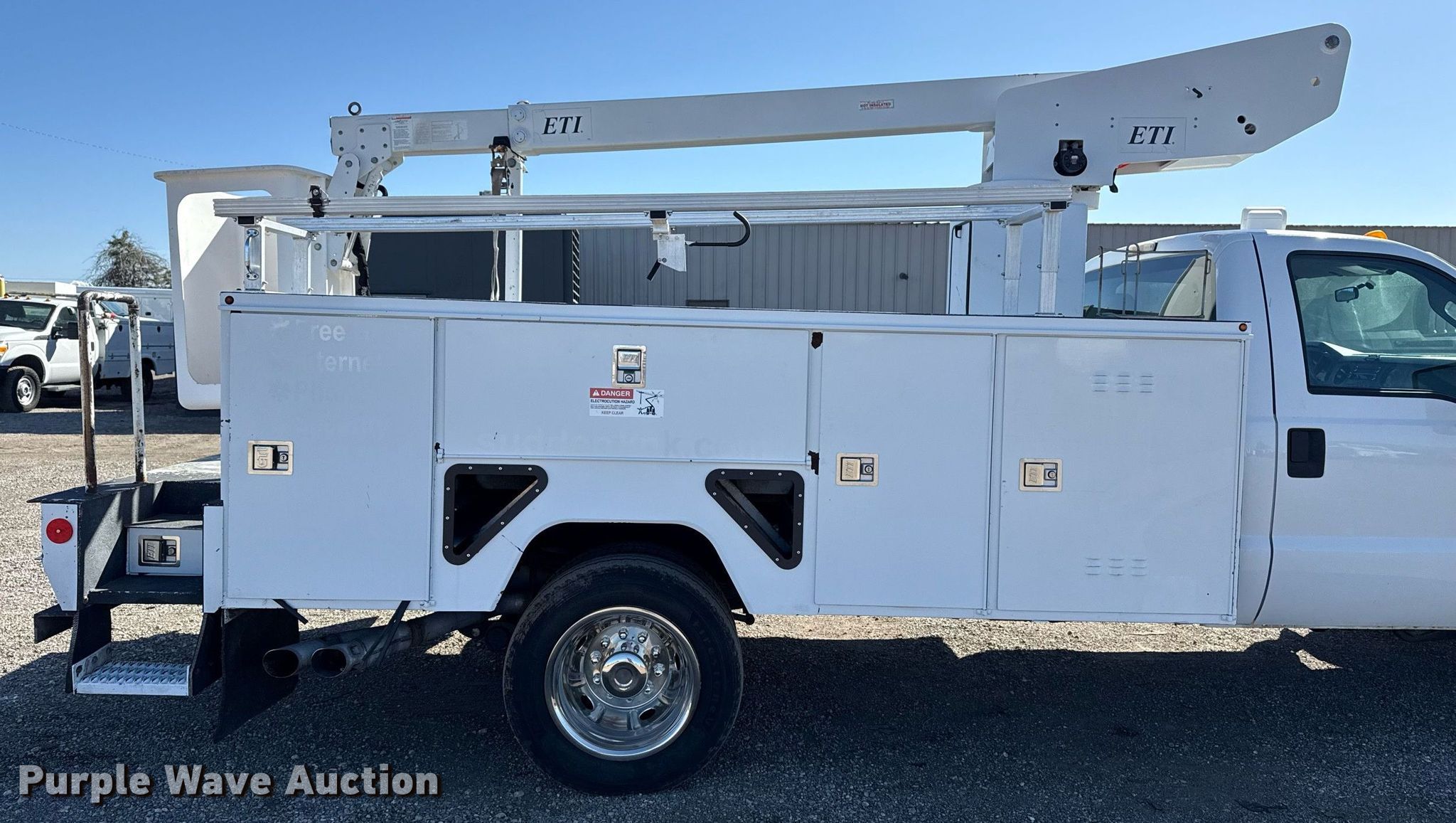 2012 Ford F450 Super Duty bucket truck. Miles: 174,195 on odometer, VIN: 1FDUF4GT0CEB74869. Engine Displacement: 6.7L, Cylinders: 8, Fuel type: Diesel. Transmission Automatic. Chassis Axles: Single, Suspension: Spring, Brakes: Hydraulic, PTO. Interior AC, Heat, Heated mirrors, Power windows, Power locks, Auxiliary controls. Features Bed ETI SB132DD96B24N, Serial: 14834, 11' L x 96" W, Boom 2002 ETI ETT29SNT, Serial: 0612T99375, Maximum lift capacity: 350 lbs, Maximum lift height: 29', Boom type: Telescopic, Man basket, Boom controls Ground, Platform/ basket.. Tires Size: 225/70R19.5. Notes Driver side exterior mirror glass missing. Oklahoma title. Seller is an Oklahoma licensed motor vehicle dealer. Title will be assigned and distributed by the dealer. Please contact the seller for distribution questions. Title distribution may be delayed up to 30 days from verification of funds. 15107 North 137th East Avenue. Collinsville, OK 74021
