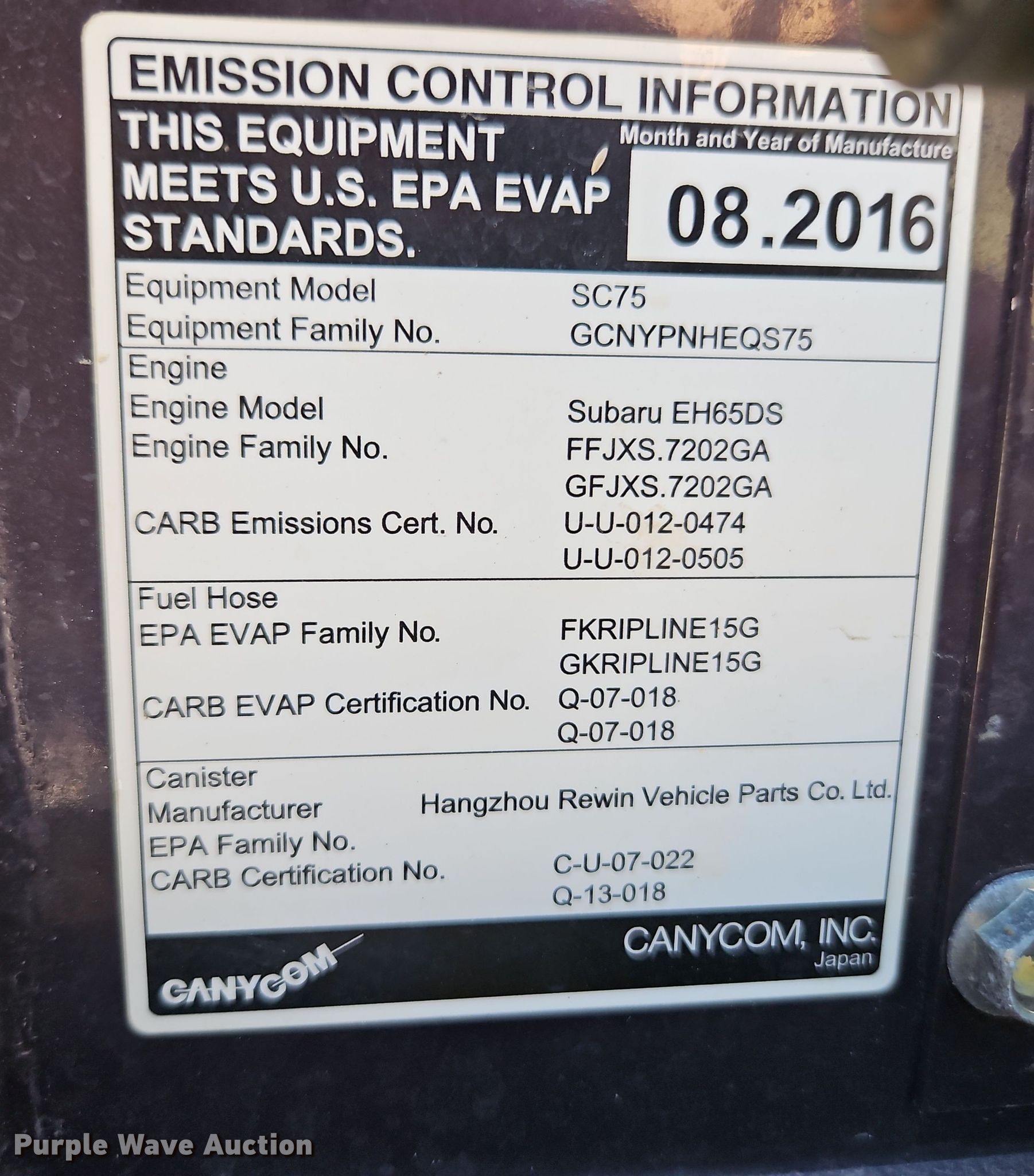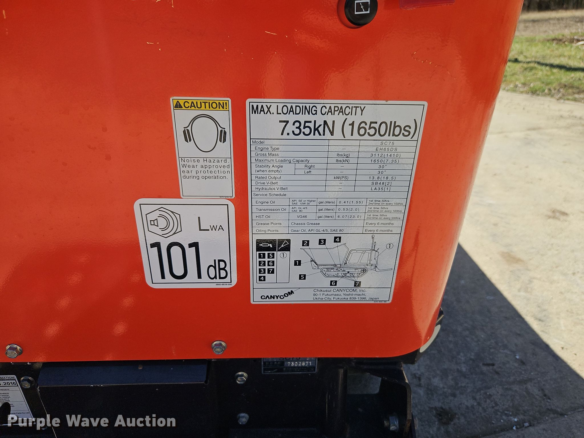 Canycom SC75 concrete buggy. Hours: Unknown. Engine Sabaru EH65DS, Cylinders: 2, Fuel type: Gas, HP: 22. Transmission Hydrostatic. Tracks Width: 8", Rubber. Notes Hour meter illumination issues. DRG Concrete. Pleasant Hill, MO 64080