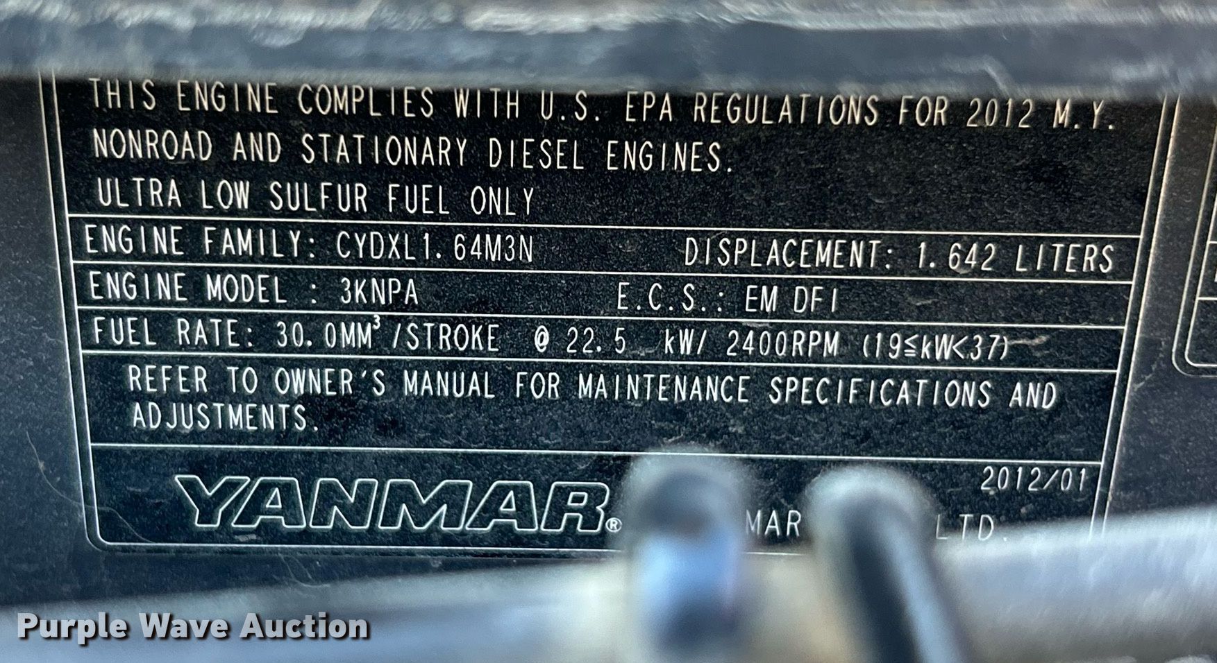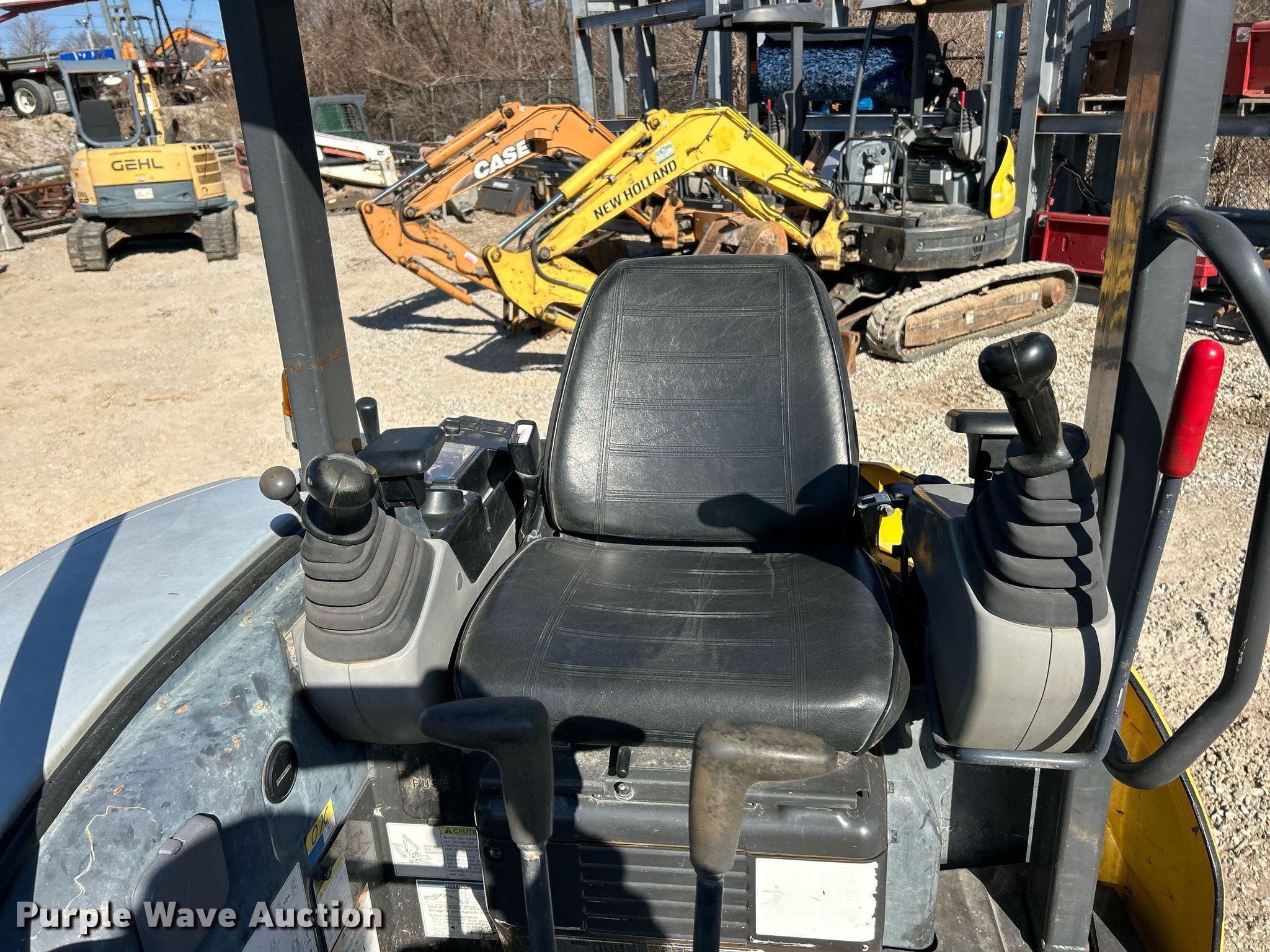 2012 New Holland E35B mini excavator. Hours: 5,028 on meter, Serial: NCTN63414. Engine Yanmar, Displacement: 1.642L, Cylinders: 3, Fuel type: Diesel. Transmission Hydrostatic, Two speed travel. Operators station OROPS, Pattern changer. Features Auxiliary hydraulics, Backfill blade Width: 67", Boom Swing, Stick Stick length: 5' 6", Quick coupler: Mechanical, Bucket WR, Width: 12", Teeth: 3, Bucket Width: 18", Teeth 4, Bucket Width: 24", Teeth: 5. Tracks Width: 12", Rubber. Collins & Hermann Inc.. St. Louis, MO 63138