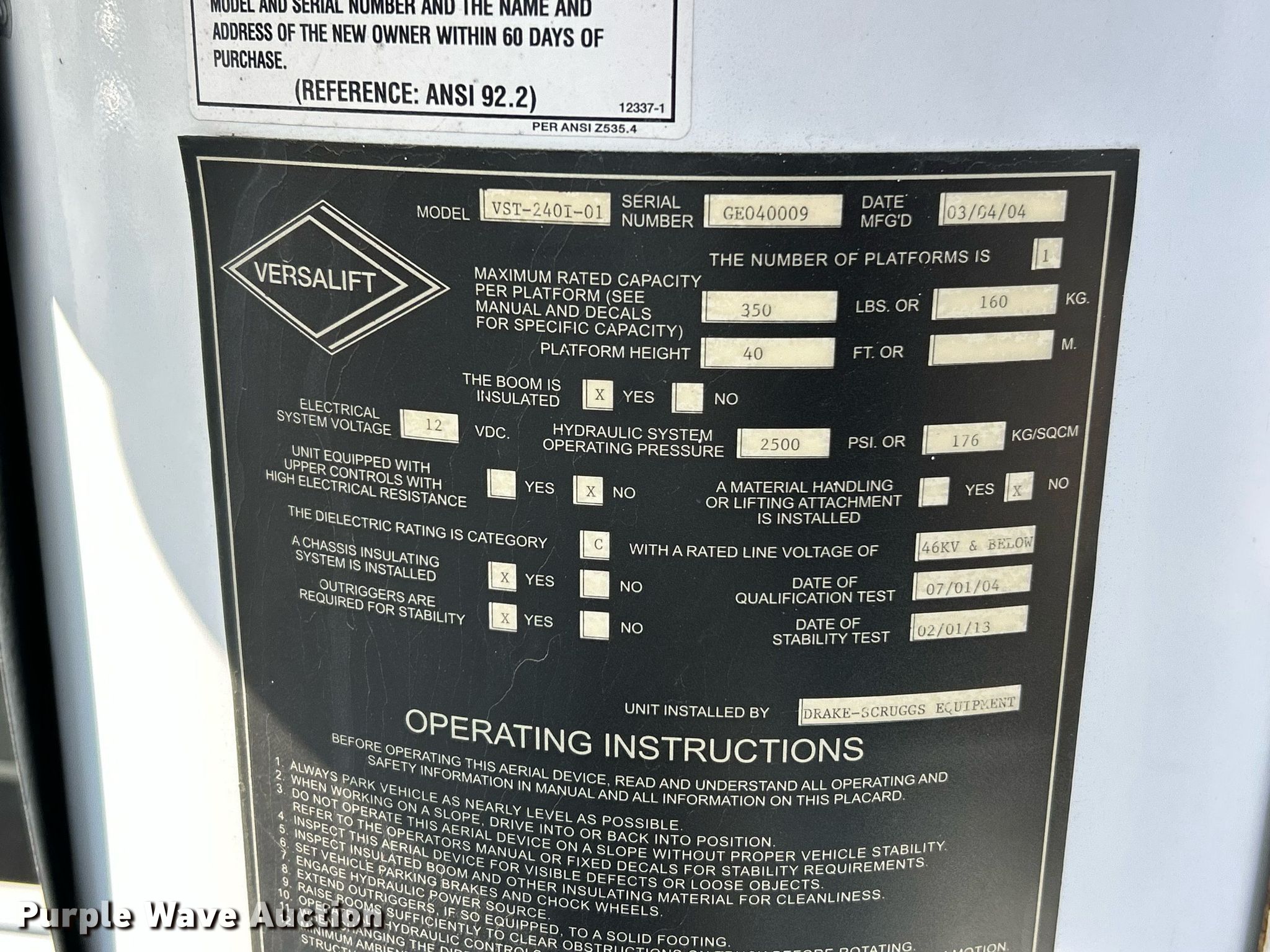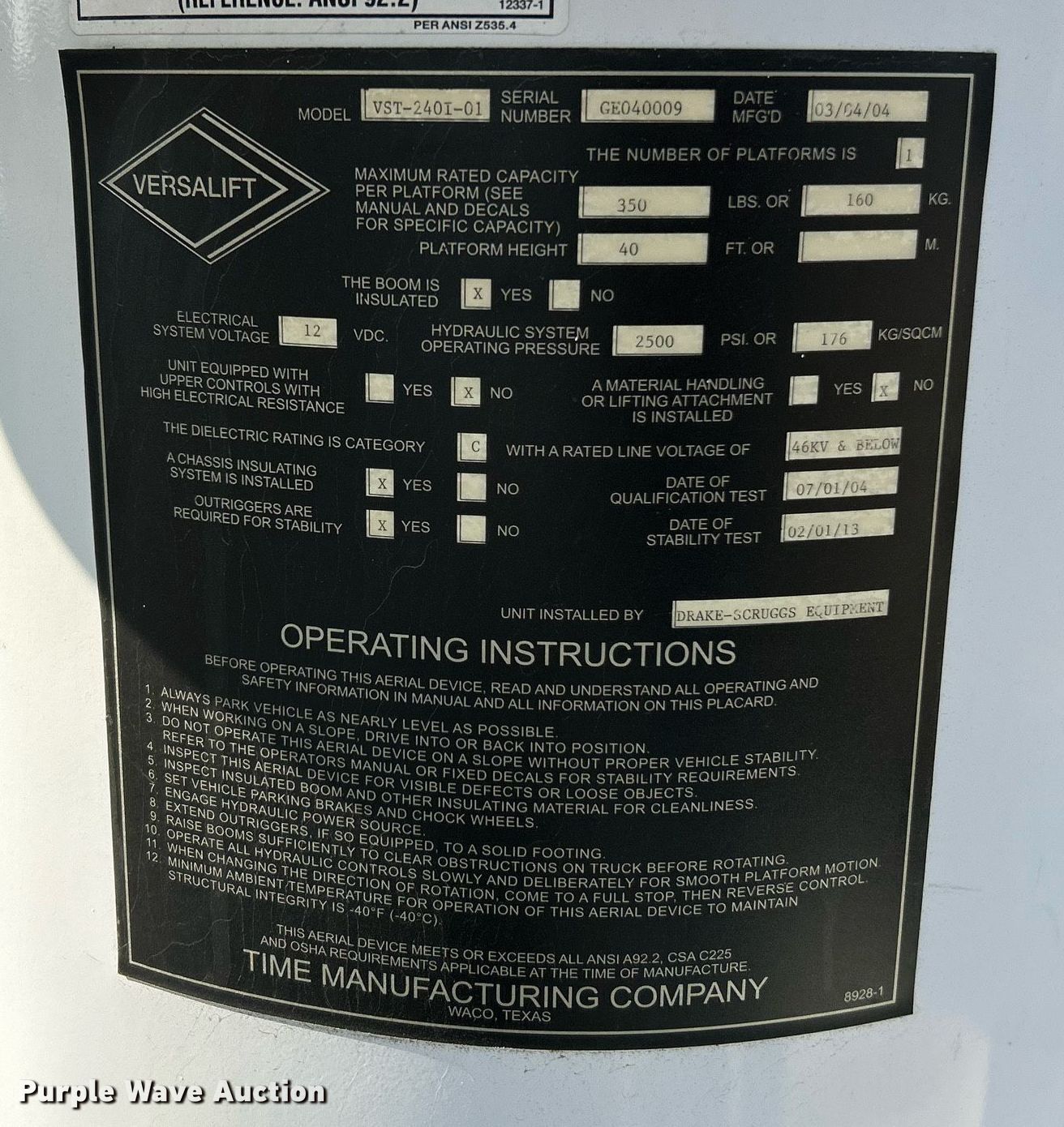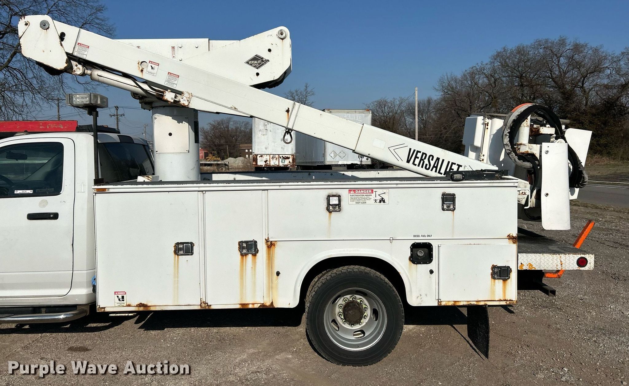 2012 Dodge Ram 5500 bucket truck. Miles: 172,701 on odometer, Hours: 12,078 on meter, VIN: 3C7WDMBL6CG315210. Engine Displacement: 6.7L, Cylinders: 6, Fuel type: Diesel. Transmission Automatic. Chassis Axles: Single, Suspension: Spring, Brakes: Hydraulic, GVWR: 19,500 lbs. Interior AC, Heat, Cruise control, Auxiliary controls. Features Bed 11' L x 94" W, Boom 2004 Versalift VST-240I-01, Serial: GE040009, Maximum lift capacity: 350 lbs, Maximum lift height: 40', Boom type: Articulating, Insulated, Telescopic, Man basket, Boom controls Ground, Platform/ basket.. Tires Size: 225/70R19.5. Notes Non-operational boom Boom function issues, Man basket cracked, Slide pad in inner-boom broken. Illinois title. Title distribution may be delayed up to 14 days from verification of funds. Big Wheel National Trucking Inc. East St. Louis, IL 62205