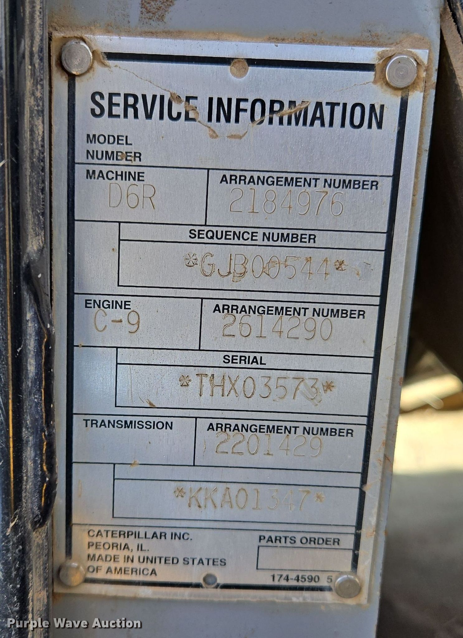 2006 Caterpillar D6R XL Series III dozer. Hours: 9,035 on meter, Serial: GJB00544, Insurance salvage unit claim #: 4-818666. Engine Caterpillar C9, Cylinders: 6, Fuel type: Diesel. Transmission Powershift. Operators station Enclosed cab, AC, Heat, Steering: Differential. Features Screen guards, Sweeps, Rear drawbar, Dozer blade Blade type: Single-tilt, Blade shape: Semi-U, Width: 124". Tracks Width: 24", Grouser pads: Single, Bottom rollers: 7. Notes Engine damaged, needs replaced , Glass cracked, Non-operational unit. Oklahoma Farm Bureau. Clayton, OK 74536