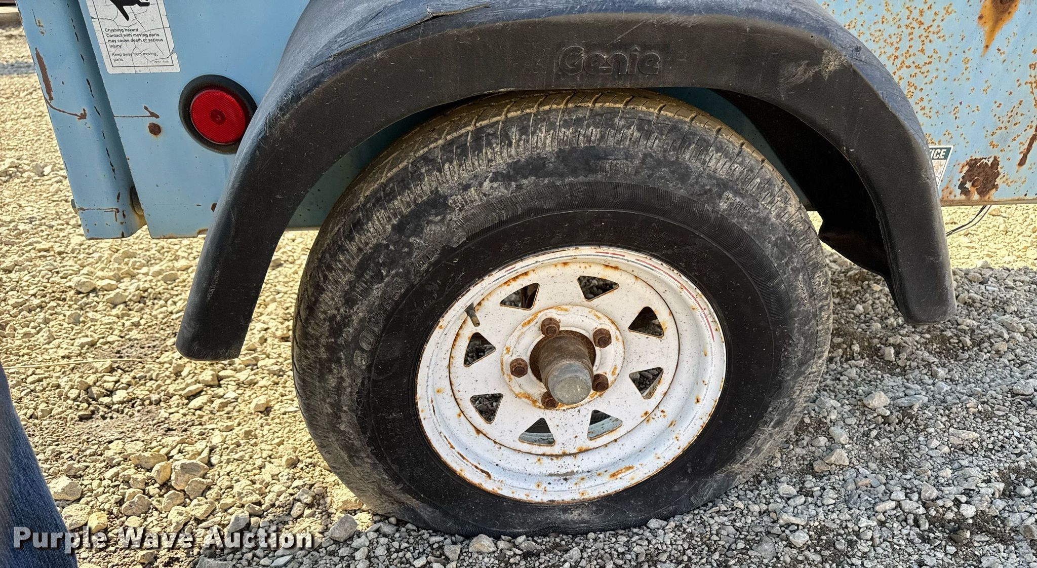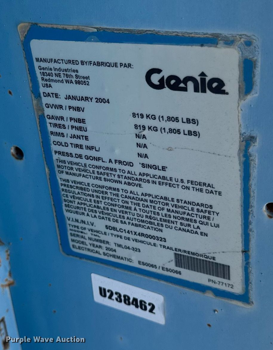 2004 Genie TML-4000N light plant. Hours: 9,142 on meter, VIN: 5D8LC141X4R000323, Serial: TML04-323. Engine Cylinders: 3, Fuel type: Diesel. Features Generator Leroy somer, kVA: 6, kW: 6, Phase: Single, Electric start, Fuel tank, Light plant Bulbs: 4, Hoist: Manual, Stabilizers. Trailer 10' L x 55" W, Ball hitch size: 2 5/16", Suspension: Spring, Axles: Single, Tire size: 185/80R13, GVWR: 1,805 lbs. Notes Unknown operating condition of lights, Unknown operating condition of generator, Dead battery, Unknown operating condition. This is worksite support equipment and will not come with a title. Transfer of ownership documentation will be a bill of sale. Boulder Contracting LLC. Grundy Center, IA 50638