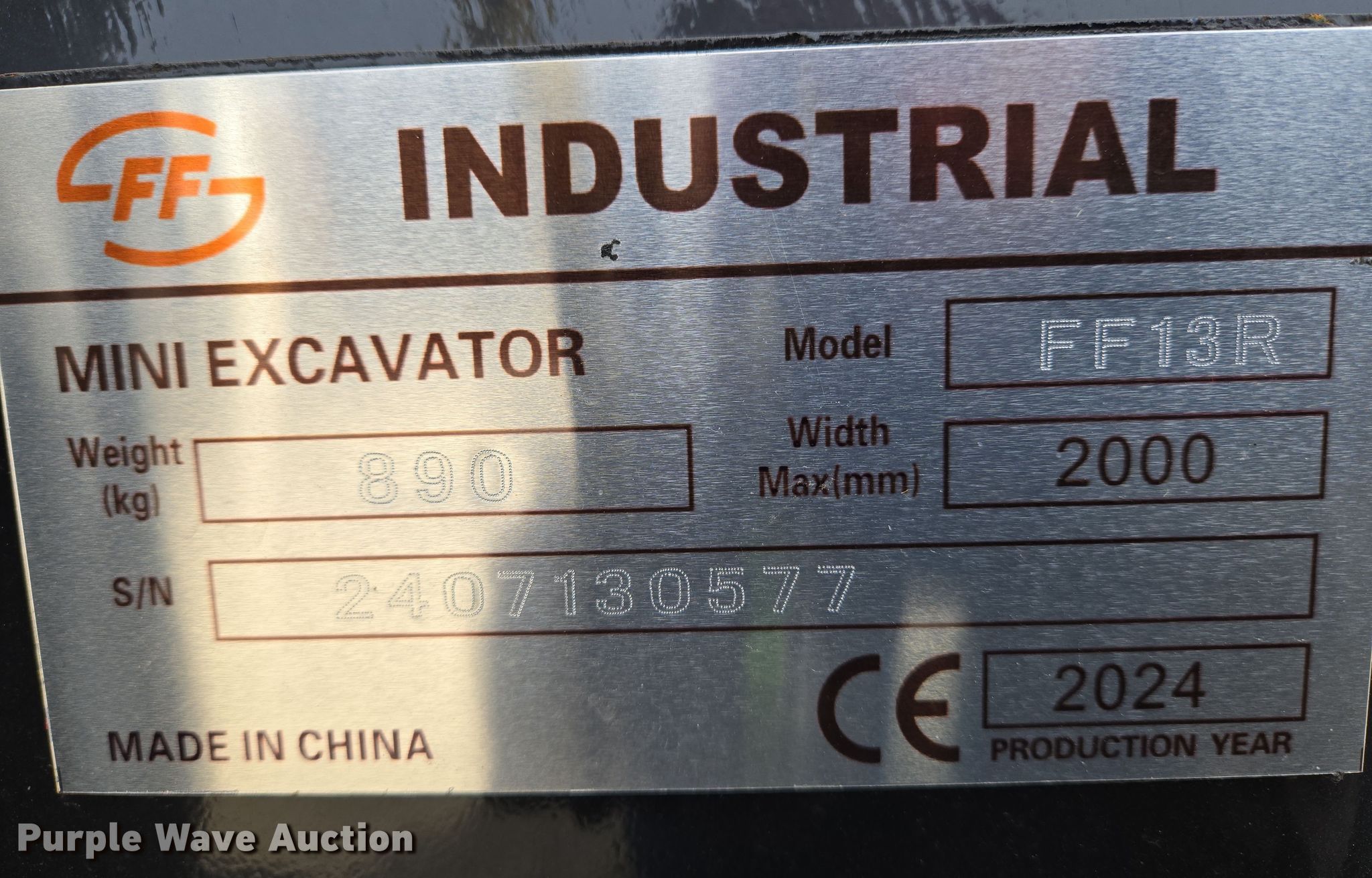 Purple Wave is selling a used Mini Excavator in Kansas. This item is a 2024 Industrial FF13R mini excavator with the following: Hours: 1 on meter, Serial: 2407130577