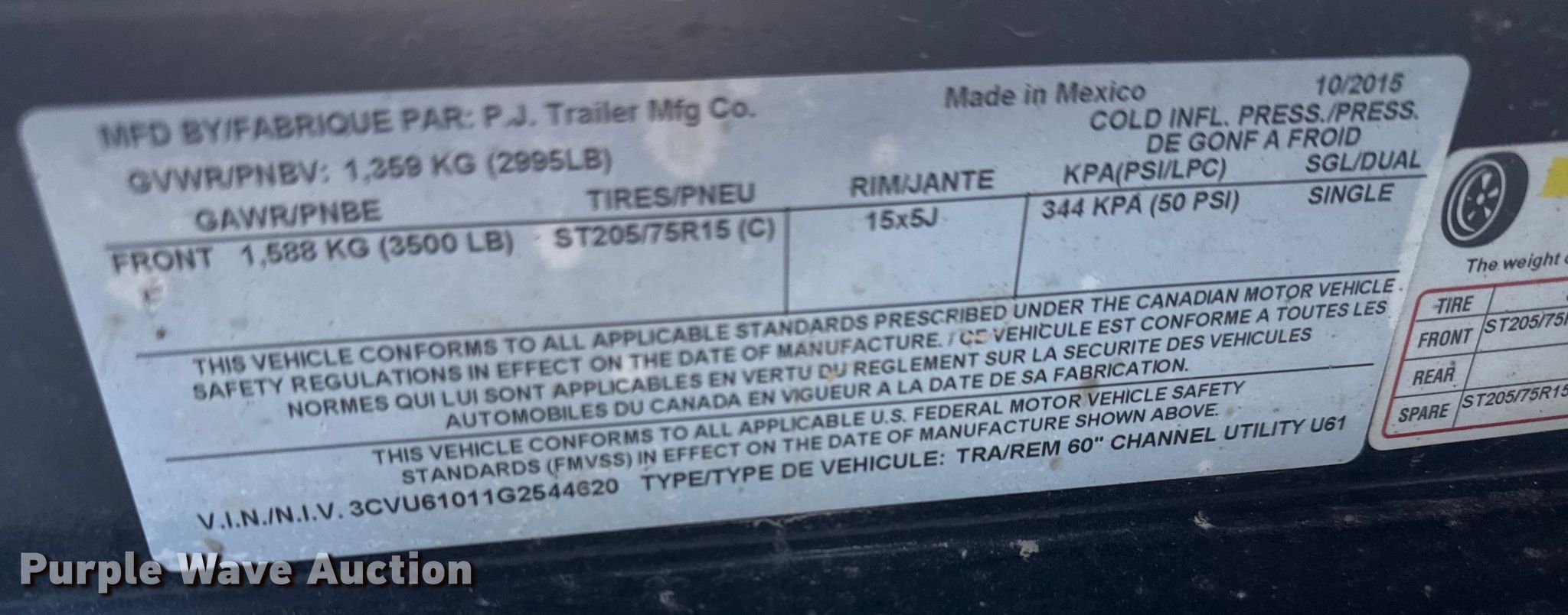 Purple Wave is selling a used Car or Utility Trailer in Kansas. This item is a 2016 PJ 6010 utility trailer with the following: VIN: 3CVU61011G2544620
