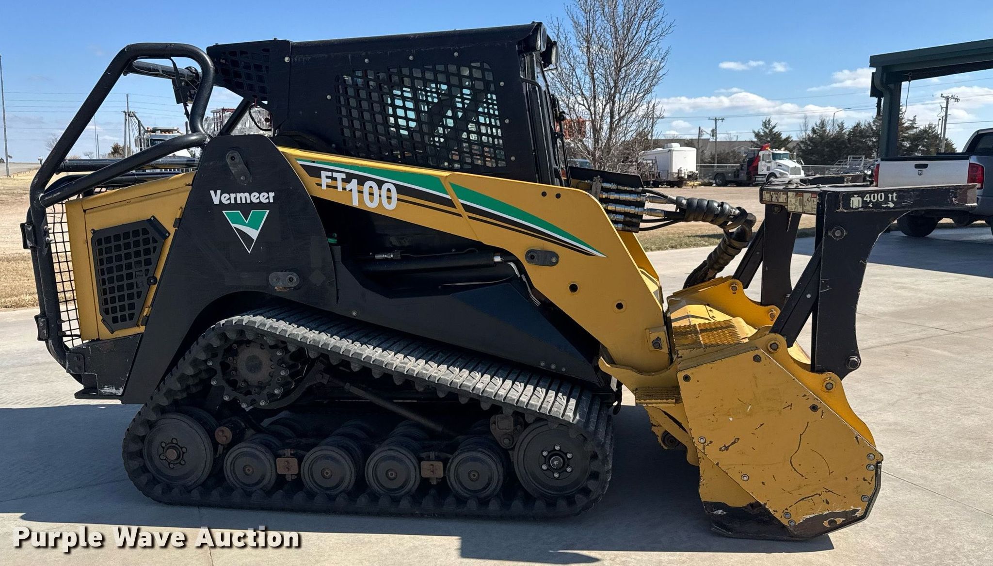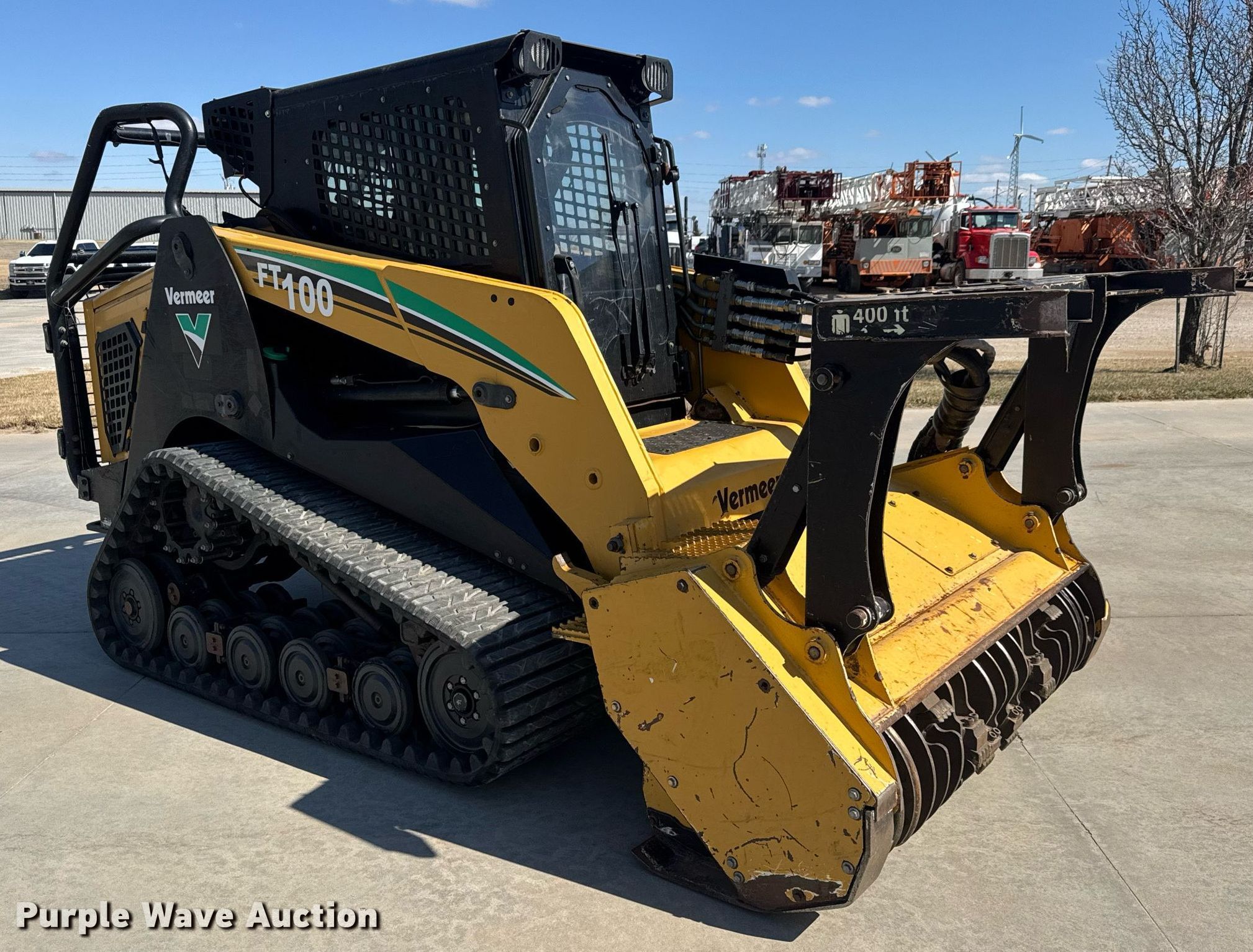2016 Vermeer FT100 forestry mulcher. Hours: 1,206 on meter, Serial: 1VRN10071G1001002. Engine Perkins 854E-E34TA, Cylinders: 4, Fuel type: Diesel, HP: 111. Transmission Hydrostatic, Two speed travel. Operators station Enclosed cab, AC, Heat, Backup camera, Bucket control: Hand, Pattern changer, Electronic Monitoring System panel. Features Auxiliary hydraulics, Auxiliary electrical outlet, Mulcher Width:73" Working width: 63".. Tracks Width: 20". Siroky Oil Management. Pratt, KS 67124