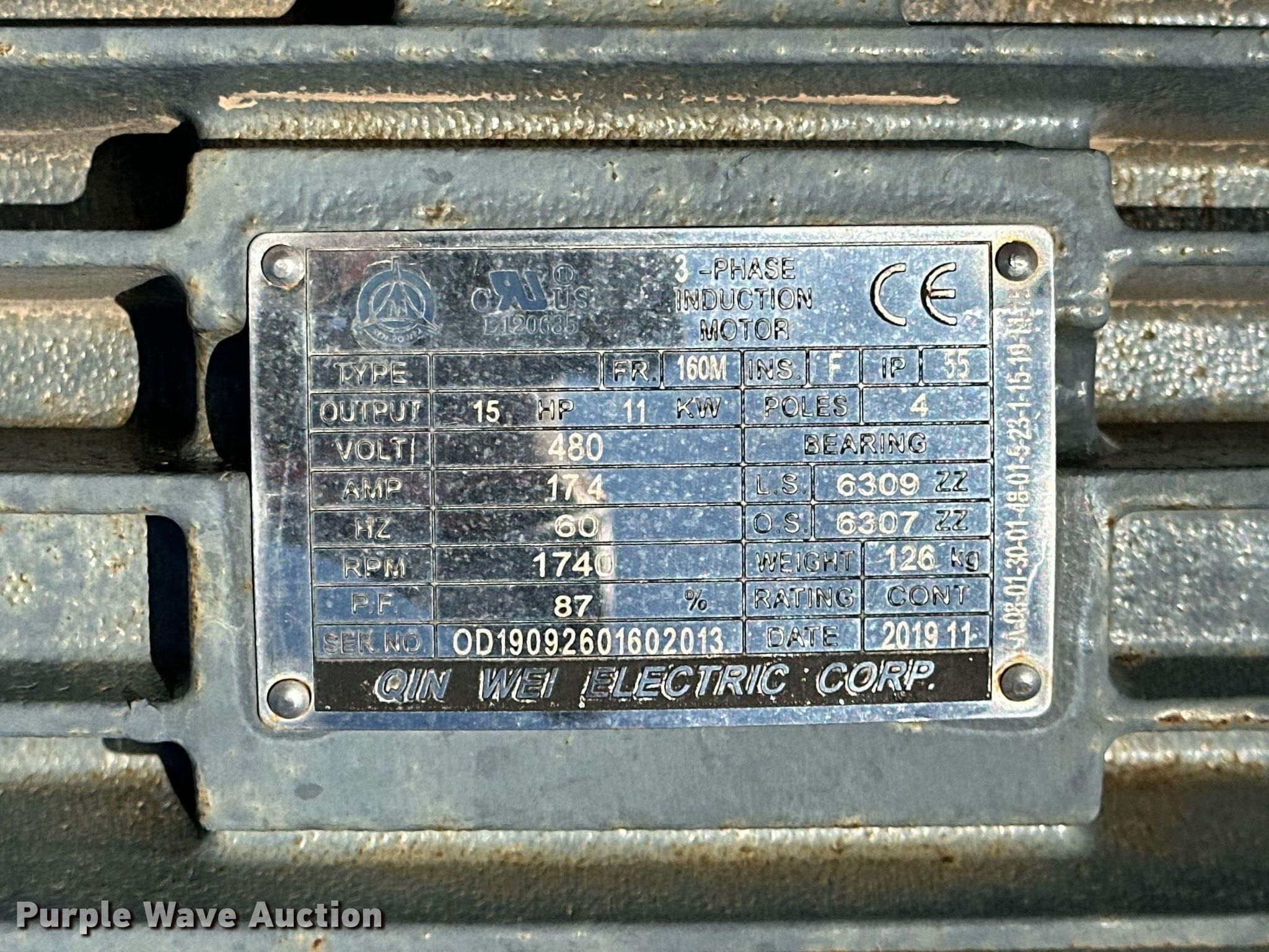 Better BE3660C conveyor. Serial: B-20200045. Electric Motor HP: 15, kW: 11, Volts: 480, Phase: Three. Features Conveyor Length: 60', Width: 36", Input hopper Length: 4', Width: 34". Shults Corp. Booker, TX 79014