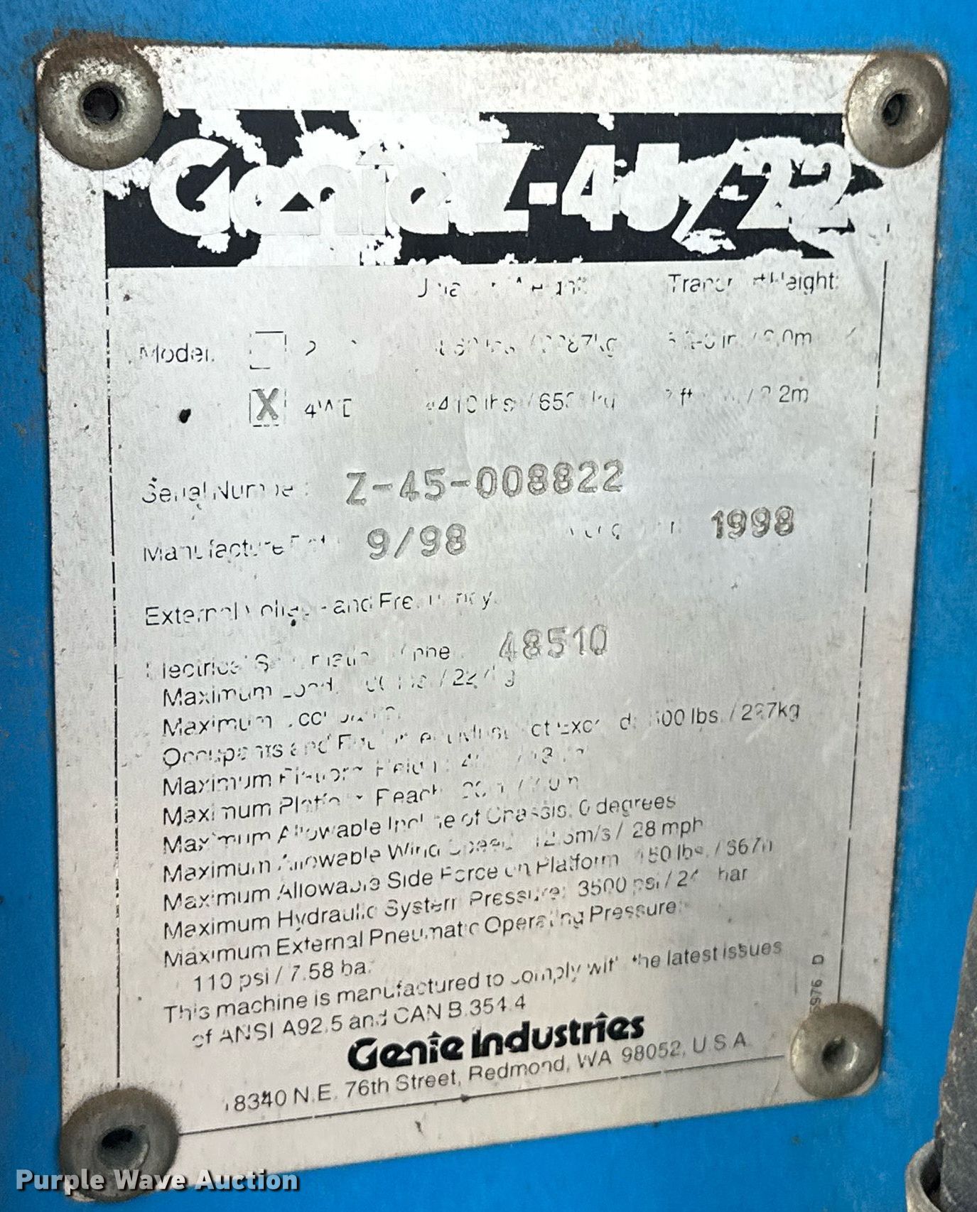 Purple Wave is selling a used Boom Lift in Kansas. This item is a 1999 Genie Z45/22 boom lift with the following: Hours: 4,090 on meter, Serial: Z-45-008822