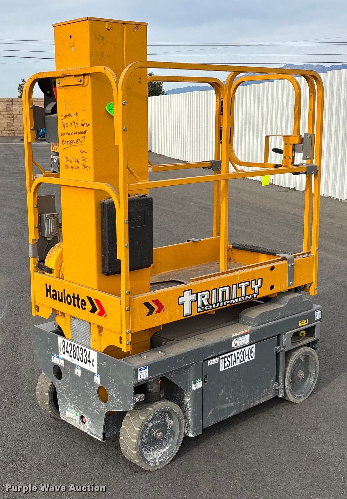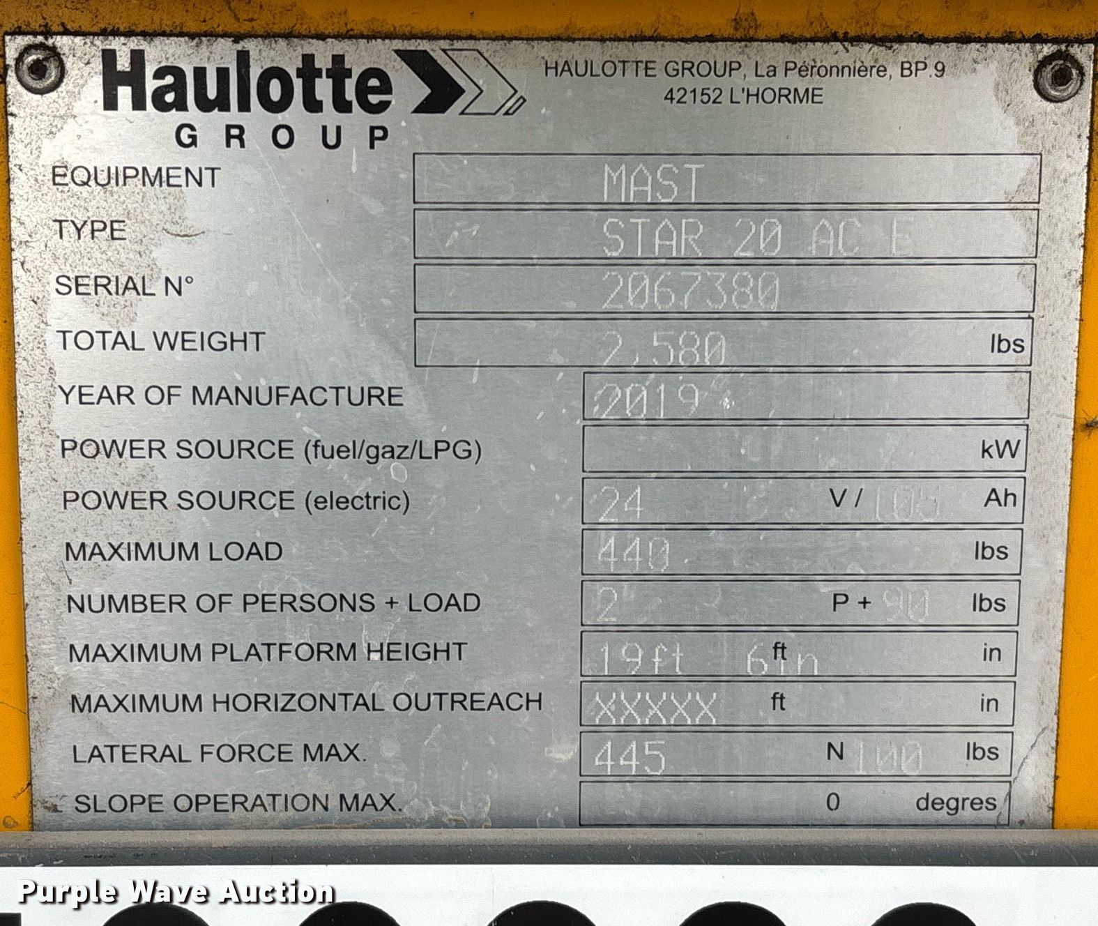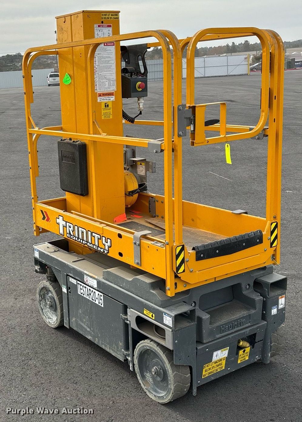 2019 Haulotte Star 20 AC E vertical lift. Hours: 91 on meter, Serial: 2067380, Unit #: TESTSR20-05, Lot #: 84280334. Electric Motor kW: 2.5, Volts: 24. Features Maximum lift capacity: 440 lbs, Maximum lift height: 19' 6", Platform: 54" L x 29" W, AC power outlet, Controls: Remote Control, Ground, Platform extensions: Manual. Tires Tire size: 12.5x4.25, Solid. Notes Dead battery, Battery issues, will not hold charge. Buyer is responsible for all aspects of loadout and removal. Fleet inventory reduction, stored at a secured facility. Please review REQUIRED REMOVAL INSTRUCTIONS. Trinity Equipment Rentals Inc.. Mentone, CA 92359
