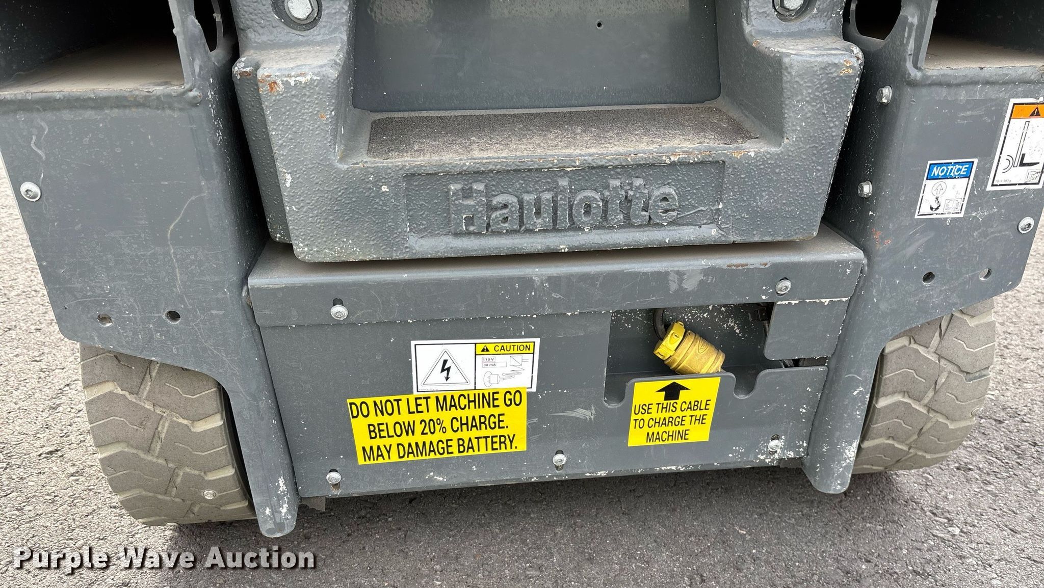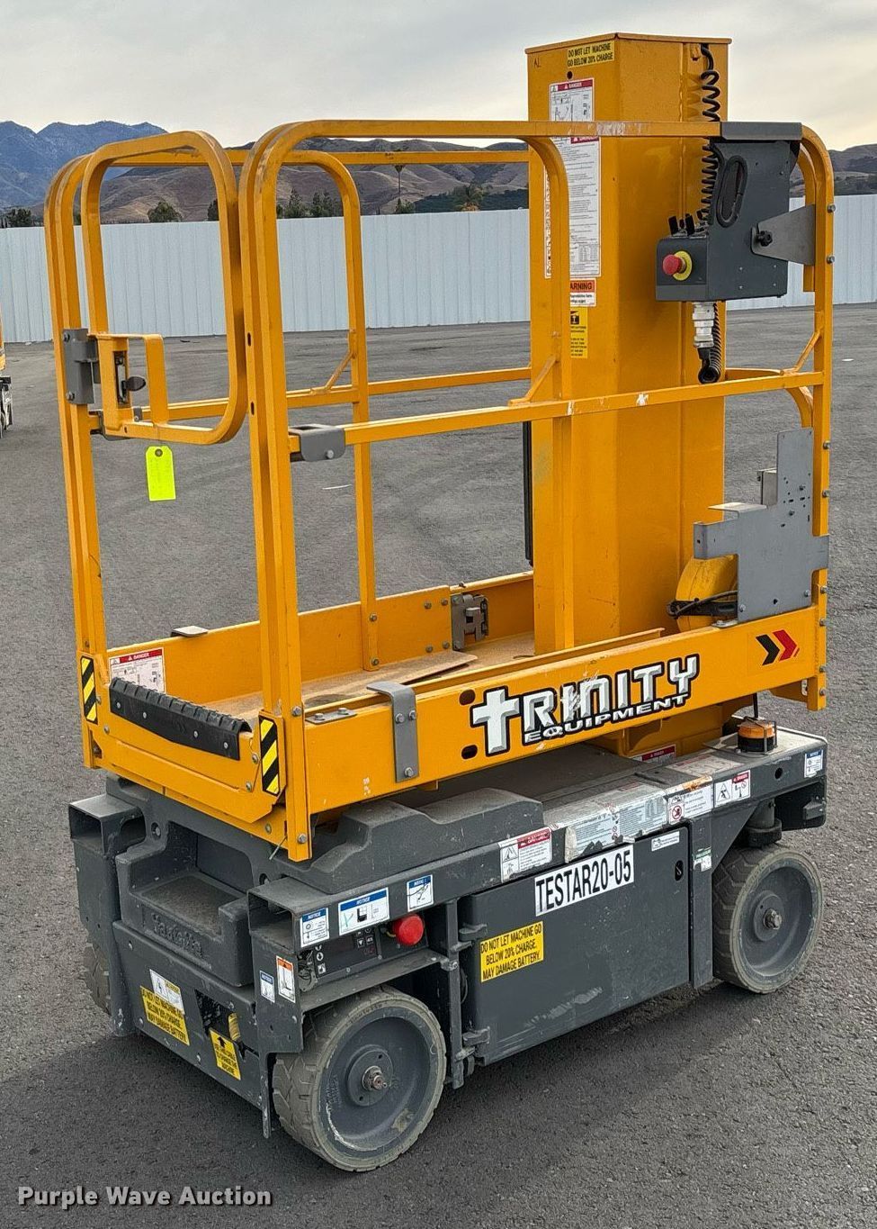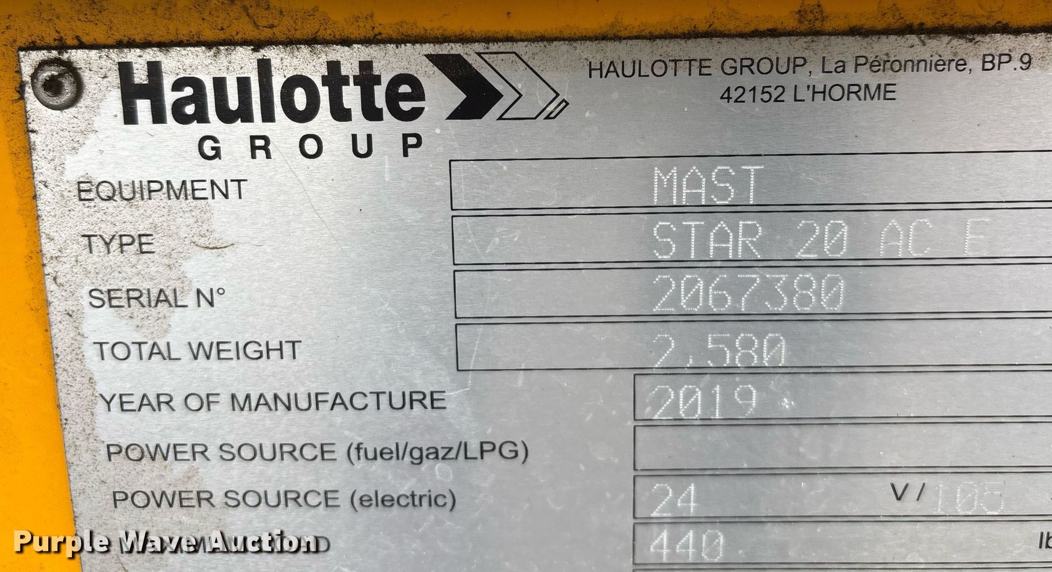2019 Haulotte Star 20 AC E vertical lift. Hours: 91 on meter, Serial: 2067380, Unit #: TESTSR20-05, Lot #: 84280334. Electric Motor kW: 2.5, Volts: 24. Features Maximum lift capacity: 440 lbs, Maximum lift height: 19' 6", Platform: 54" L x 29" W, AC power outlet, Controls: Remote Control, Ground, Platform extensions: Manual. Tires Tire size: 12.5x4.25, Solid. Notes Dead battery, Battery issues, will not hold charge. Buyer is responsible for all aspects of loadout and removal. Fleet inventory reduction, stored at a secured facility. Please review REQUIRED REMOVAL INSTRUCTIONS. Trinity Equipment Rentals Inc.. Mentone, CA 92359