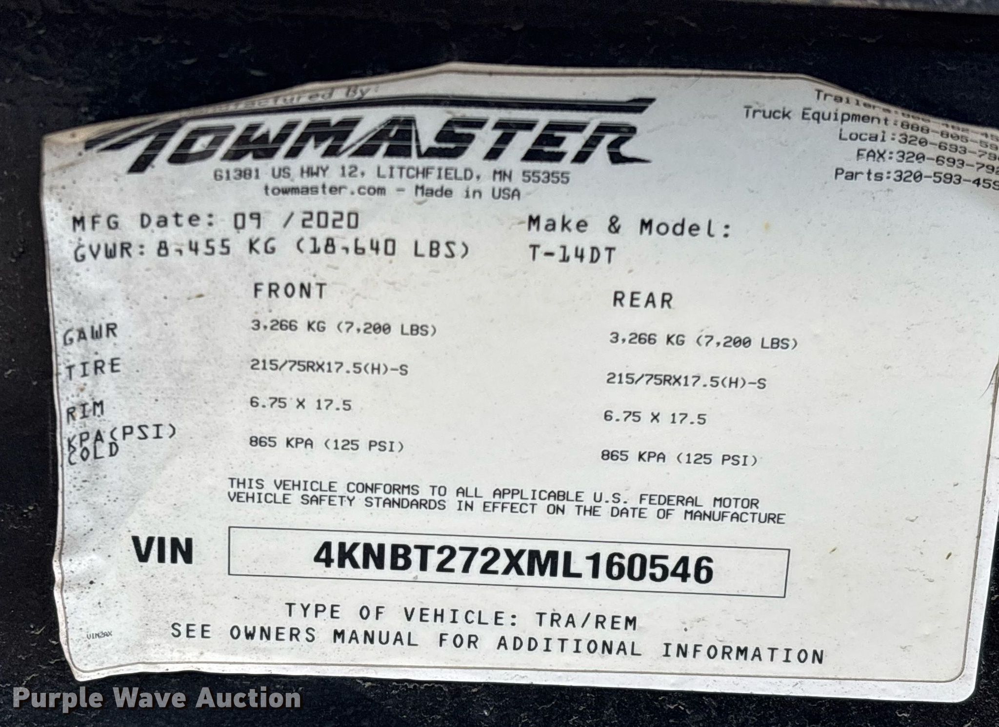2021 Monroe Towmaster T-14DT tilt deck equipment trailer. VIN: 4KNBT272XML160546, Unit #: TTER-60, Lot #: 84281404. Dimensions Deck: 22' L x 78" W. Features Deck type: Wood. Chassis Hitch: Pintle, Landing gear: Single, Brakes: Electric, Axles: Tandem, GVWR: 18,640 lbs, GAWR: 7,200 lbs. Tires Aluminum wheels, Size: 215/75R17.5. Fleet inventory reduction, stored at a secured facility. Please review REQUIRED REMOVAL INSTRUCTIONS. Titles will be distributed after confirmation of payment and removal. California title. Title distribution may be delayed up to 30 days from verification of funds. Trinity Equipment Rentals Inc.. Mentone, CA 92359