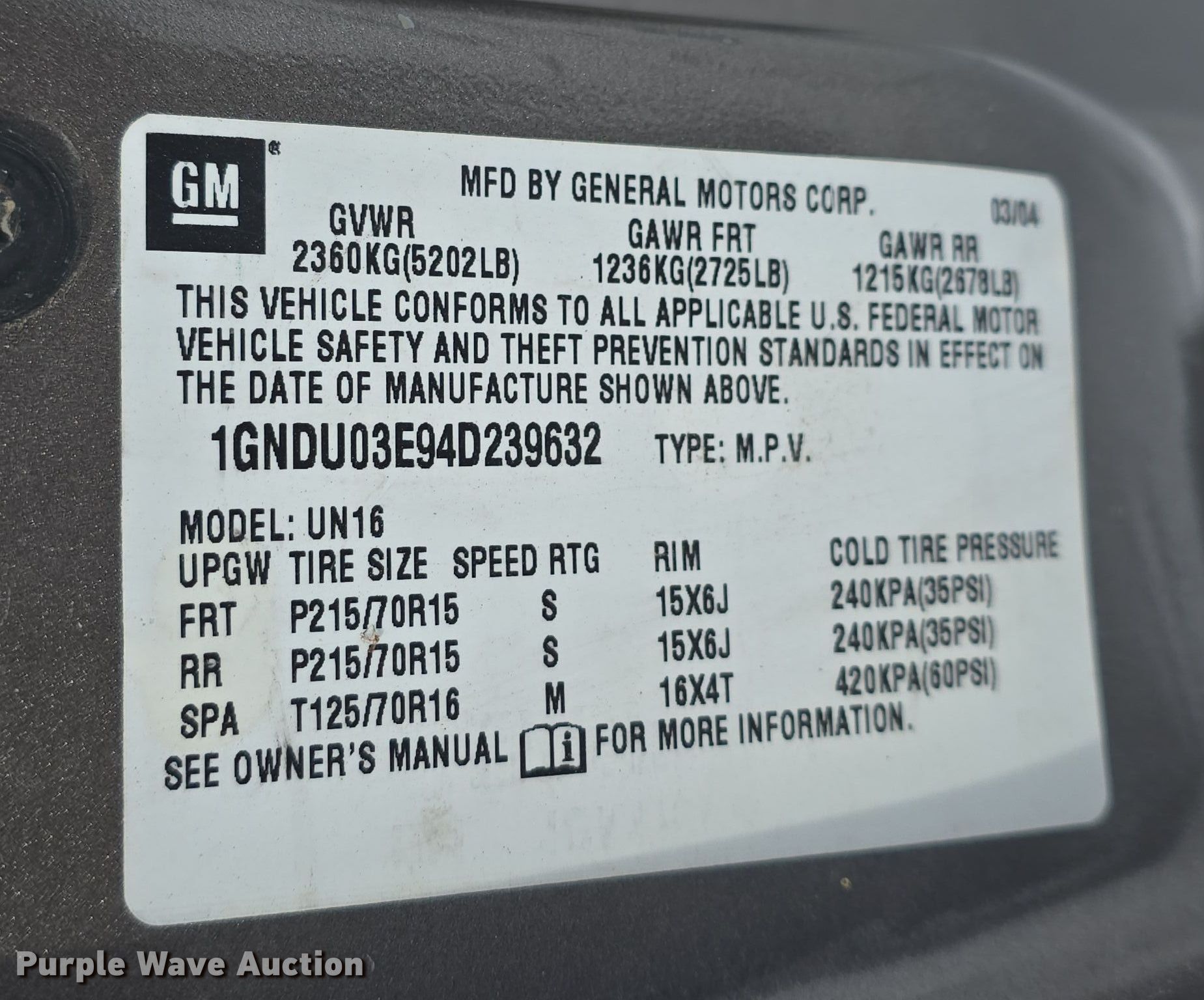 Purple Wave is selling a used Passenger Vehicle in Kansas. This item is a 2004 Chevrolet Venture van with the following: Miles: 63,624 on odometer, VIN: 1GNDU03E94D239632