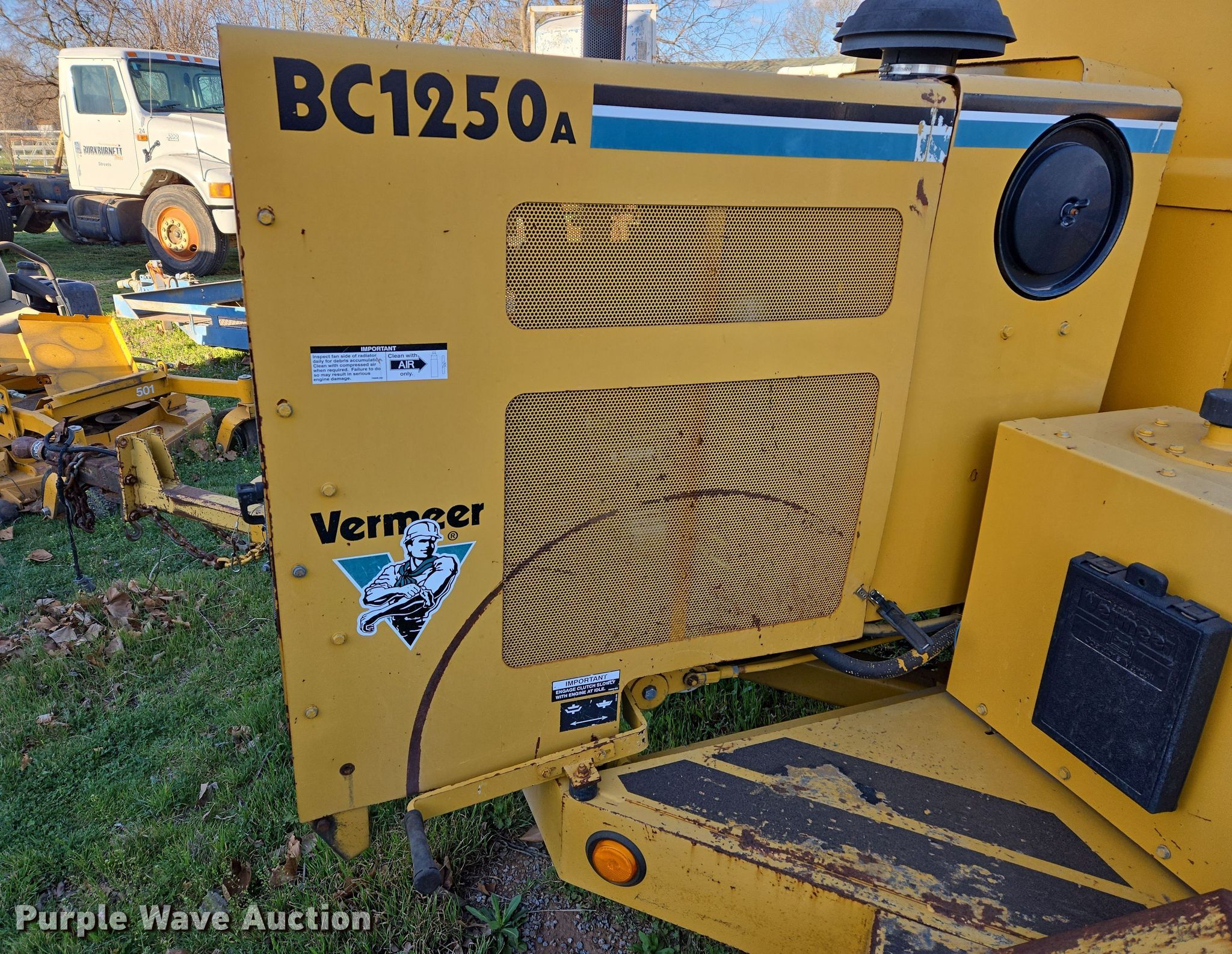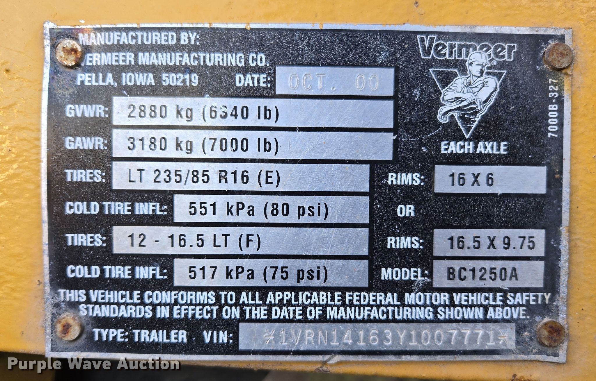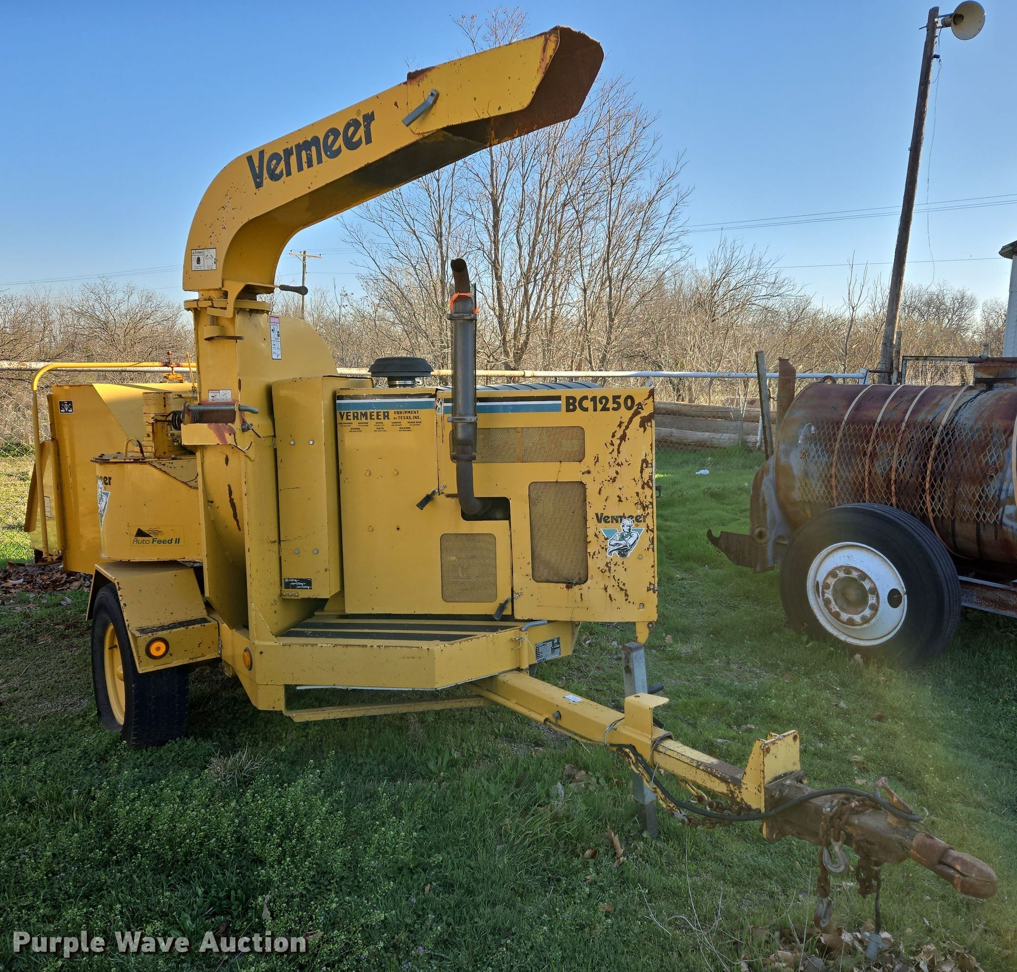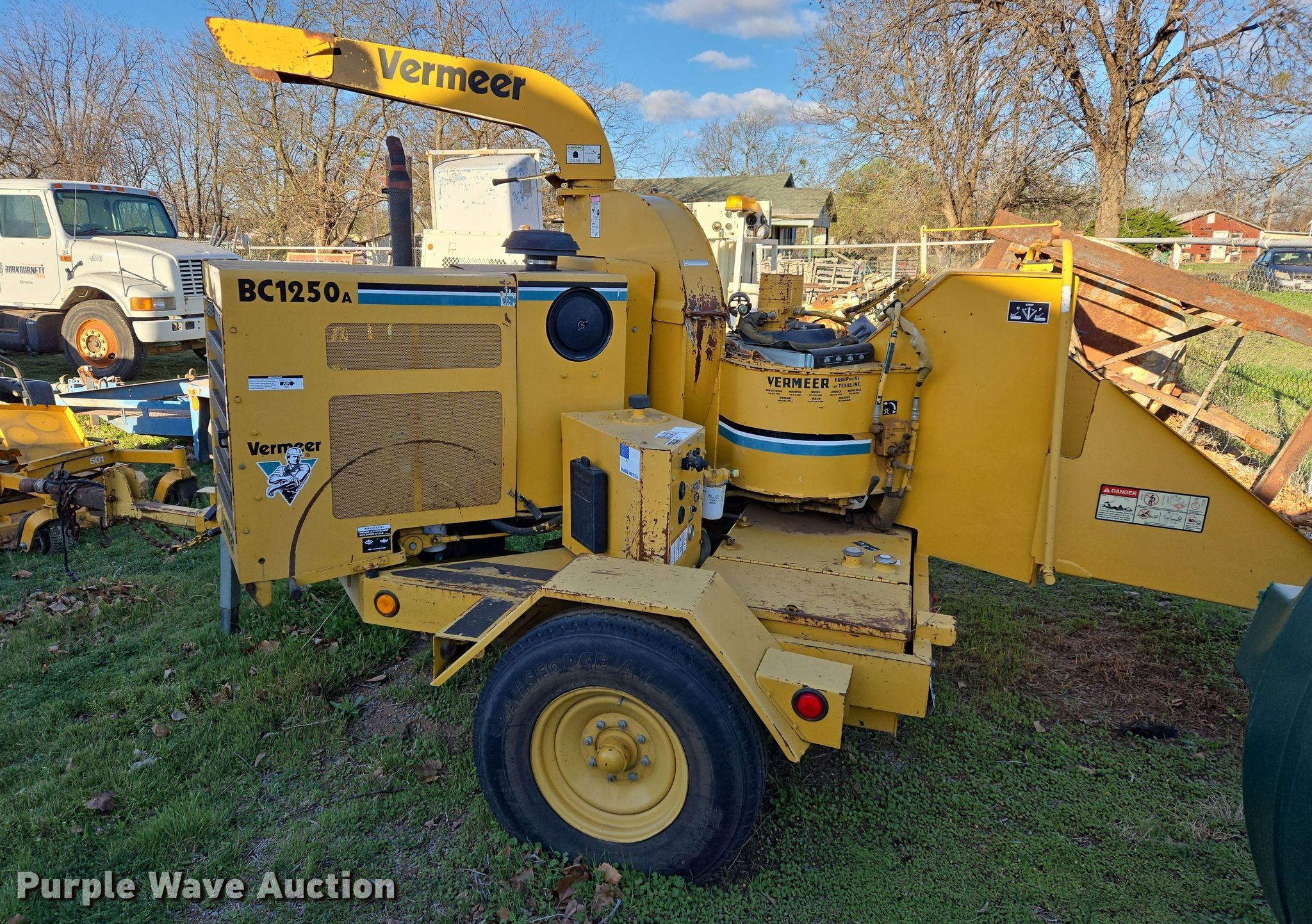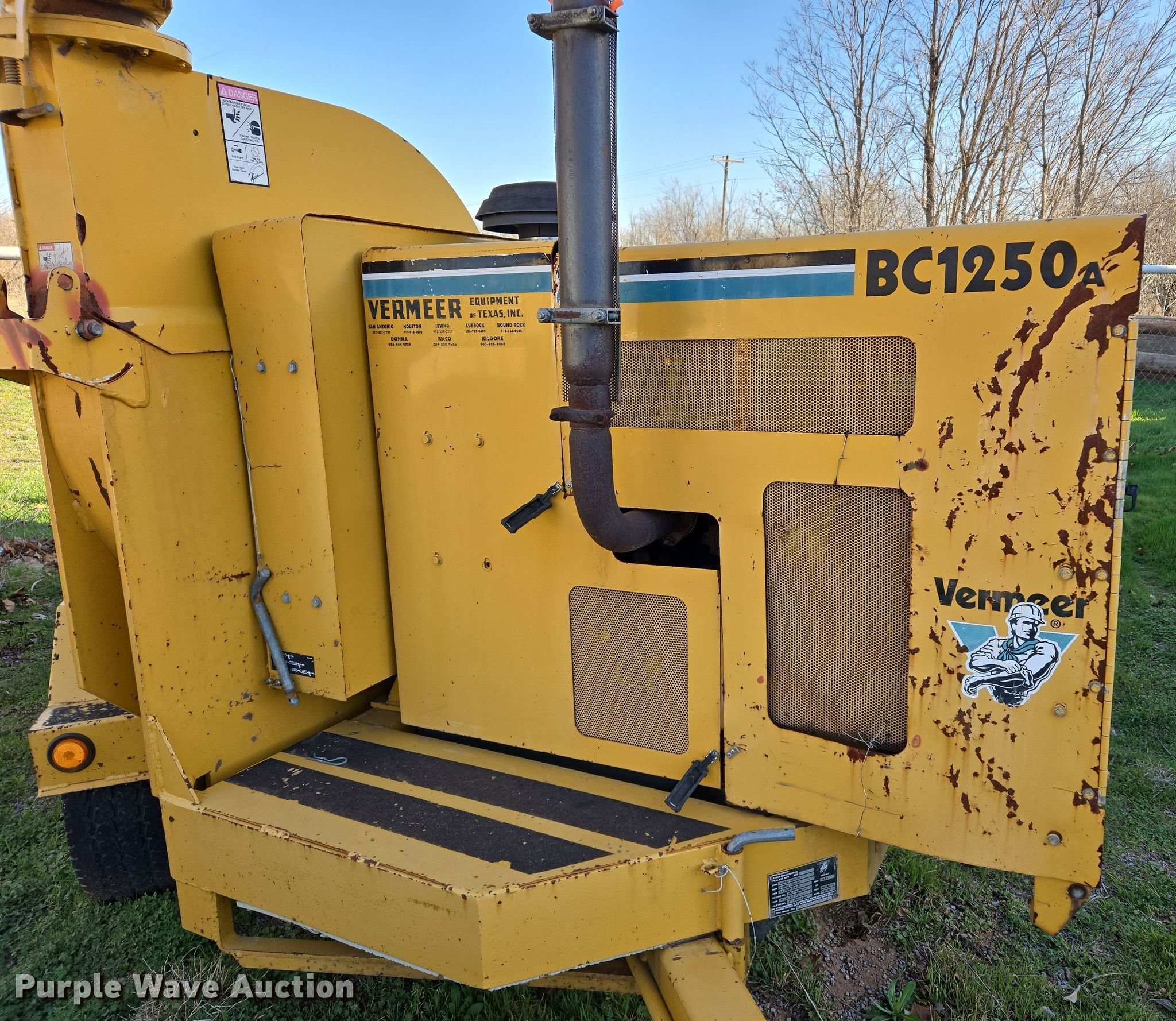 2000 Vermeer BC1250A wood chipper. Hours: 2,087 on meter, VIN: 1VRN14163Y1007771. Engine Perkins YPKXL04.2AR1, Displacement: 4.2L, Cylinders: 4, Fuel type: Diesel. Features Capacity: 12", Throat opening: 29" x 16", Auto feed. Trailer Ball hitch size: 2", Suspension: Torsion, Brakes: Electric, Axles: Single, Tire size: 235/85R16, GVWR: 6,340 lbs, GAWR: 7,000 lbs. This is worksite support equipment and will not come with a title. Transfer of ownership documentation will be a bill of sale. City of Burkburnett. Burkburnett, TX 76354