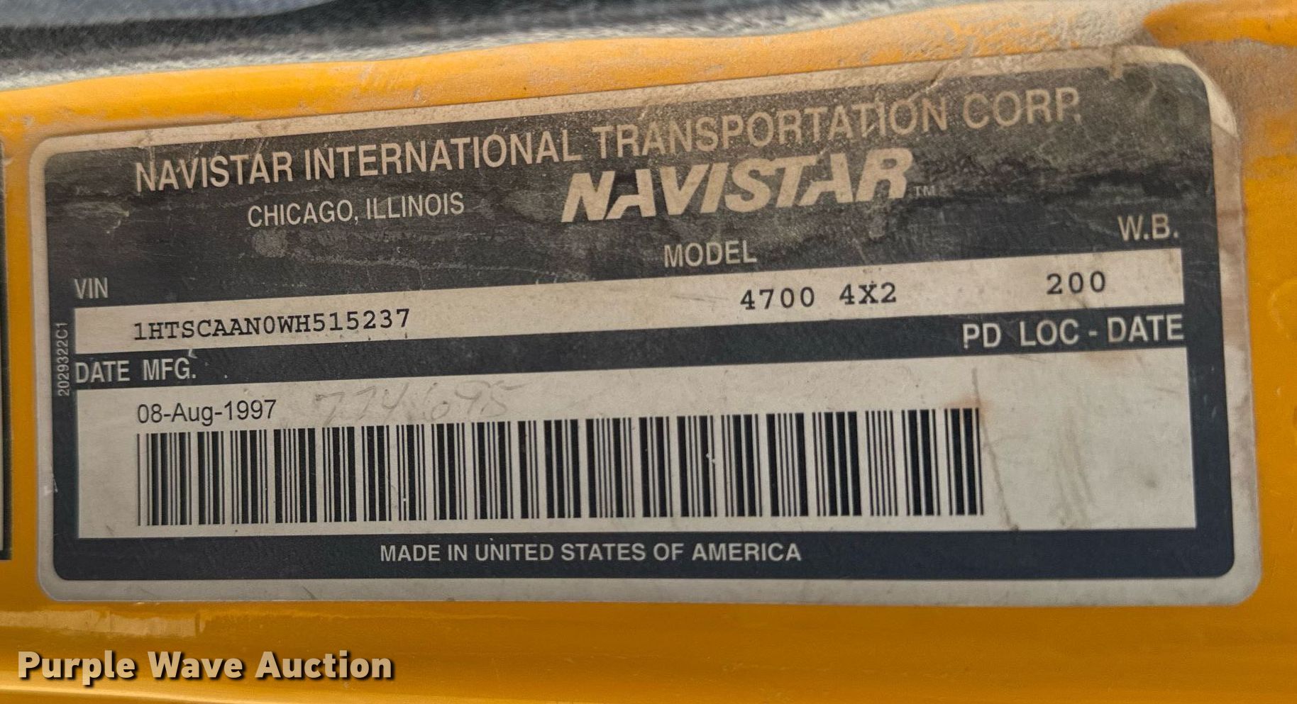 Purple Wave is selling a used Crane Truck in Iowa. This item is a 1998 International 4700 crane truck with the following: Miles: 186,176 on odometer, Hours: 13,842 on meter, VIN: 1HTSCAAN0WH515237
