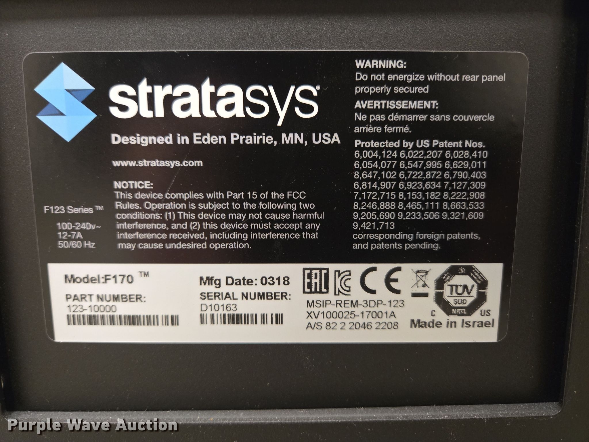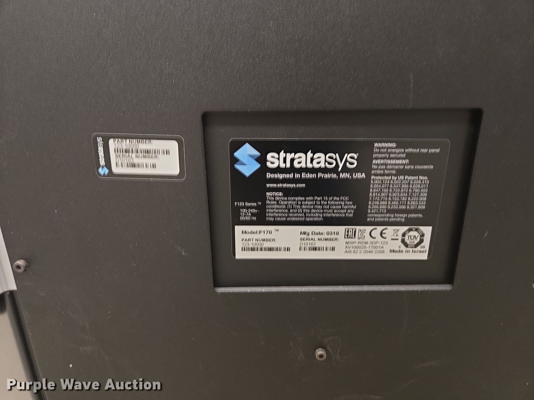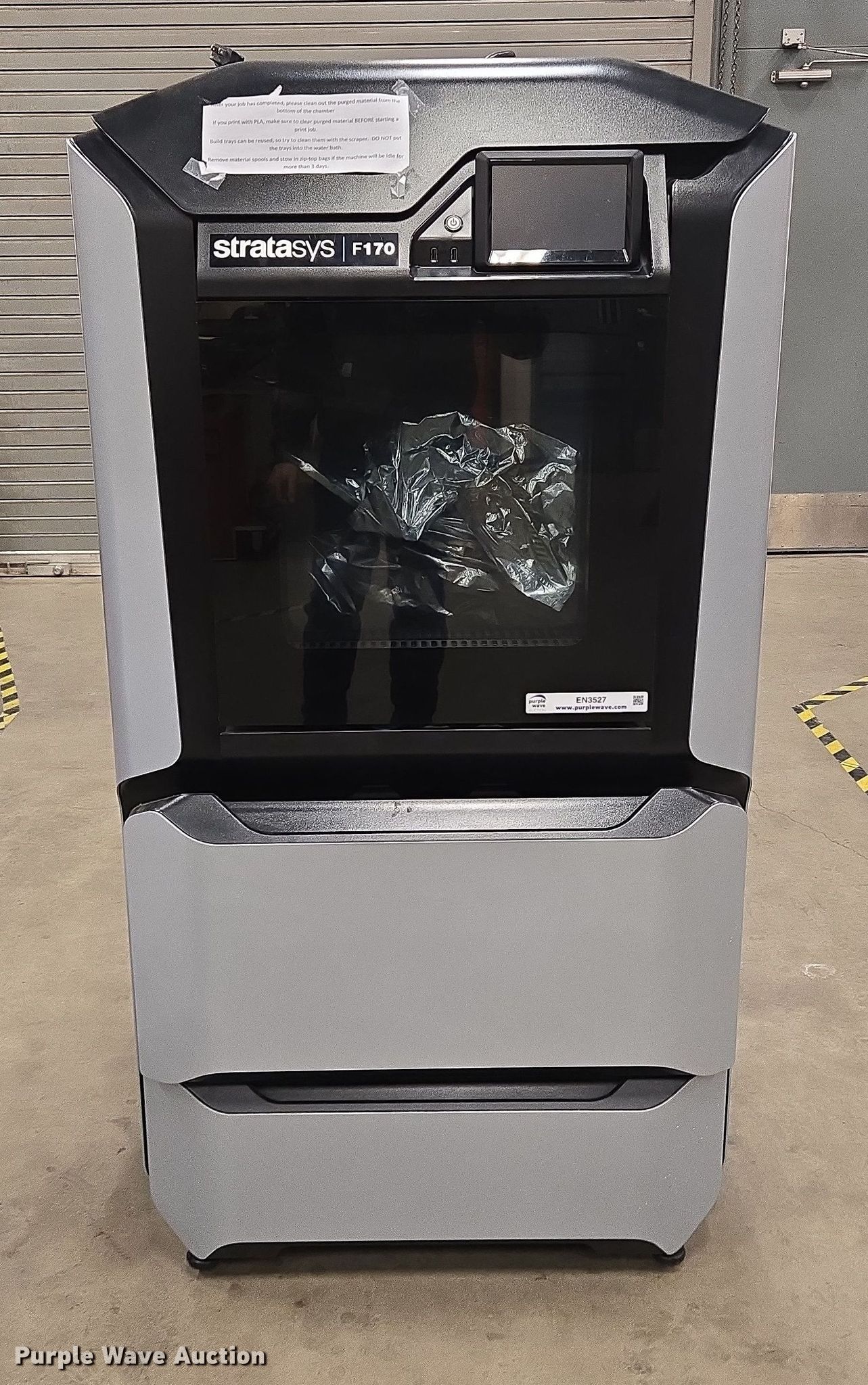 Purple Wave is selling a used Copy or Printing Machine in Kansas. This item is a Stratasys F170 3D printer with the following: Serial: D10163, Dimensions: 64" x 34" x 28", Build volume: 10" x 10" x 10", Supported Materials: PLA, ABS-M30, ASA, FDM TPU 92A, ABS-CF10