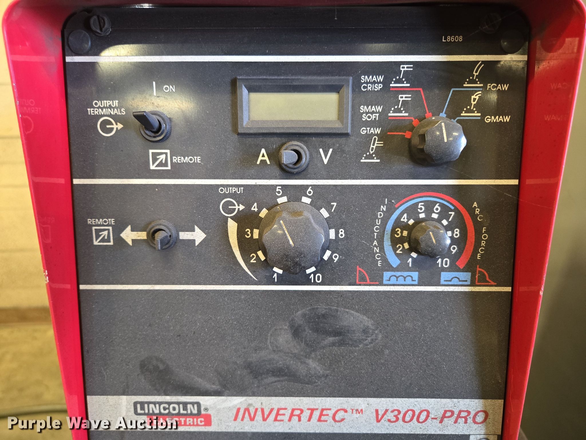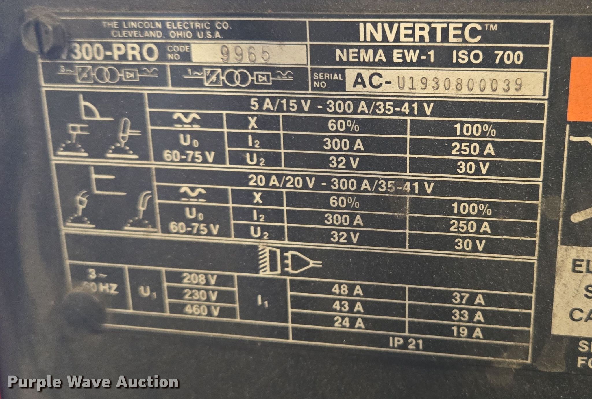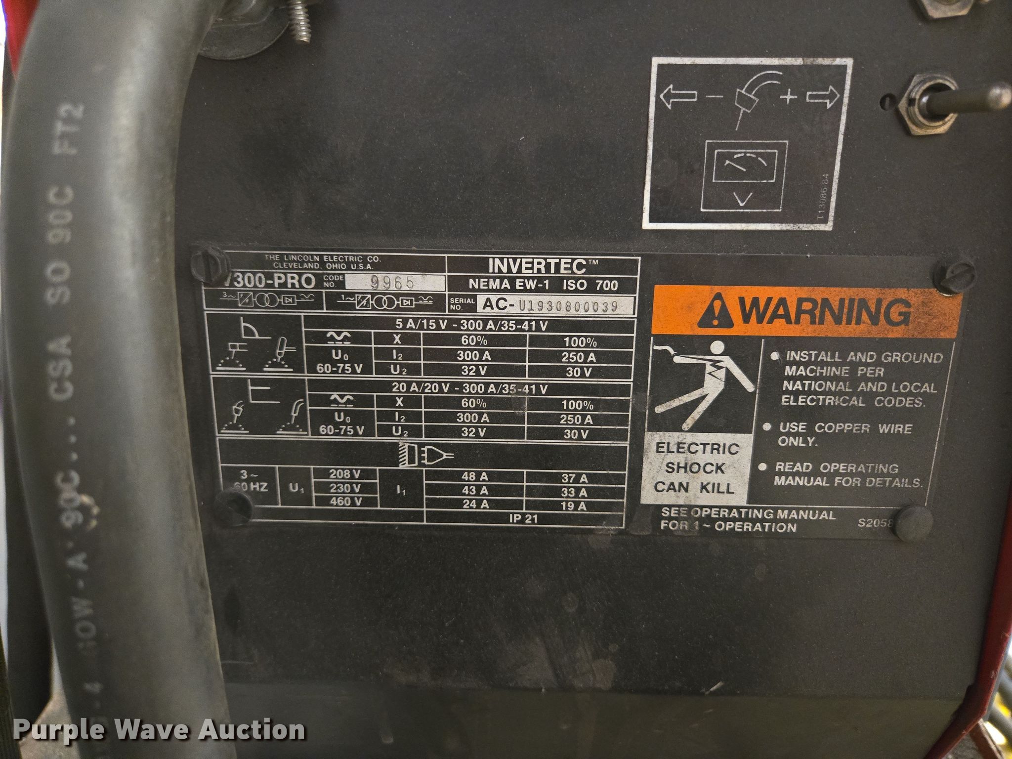 1993 Lincoln Electric Invertec V300-PRO welder. Serial: AC-U1930800039. Electric Motor Volts: 208/230/460, Phase: Three. Features Welder Capabilities: CC, CV, DC, Wire, MIG, TIG, Stick, Leads, Cart. Notes Unknown operating condition. Pittsburg State University. Pittsburg, KS 66762