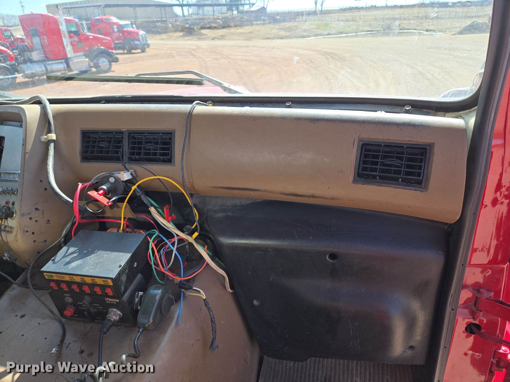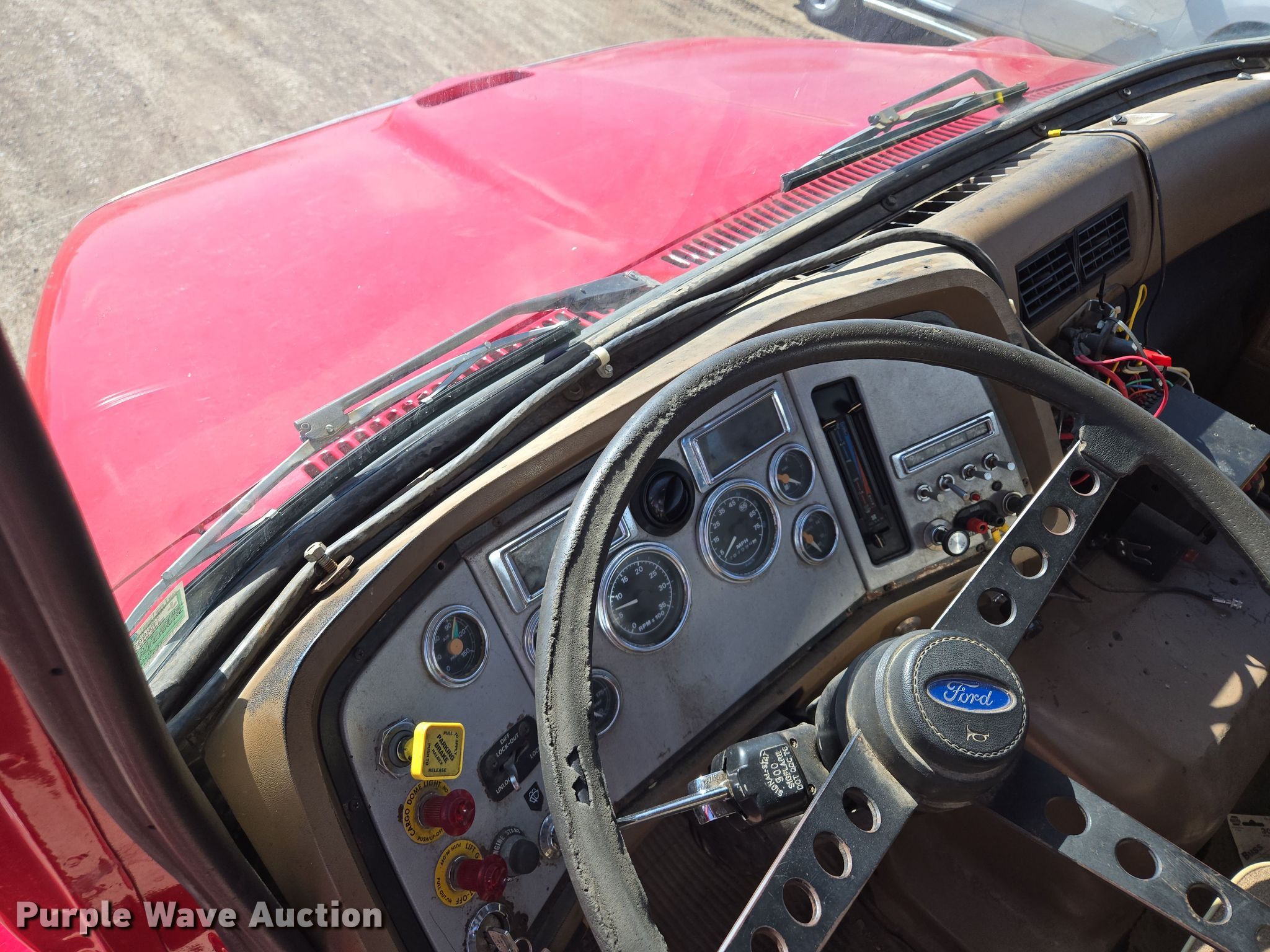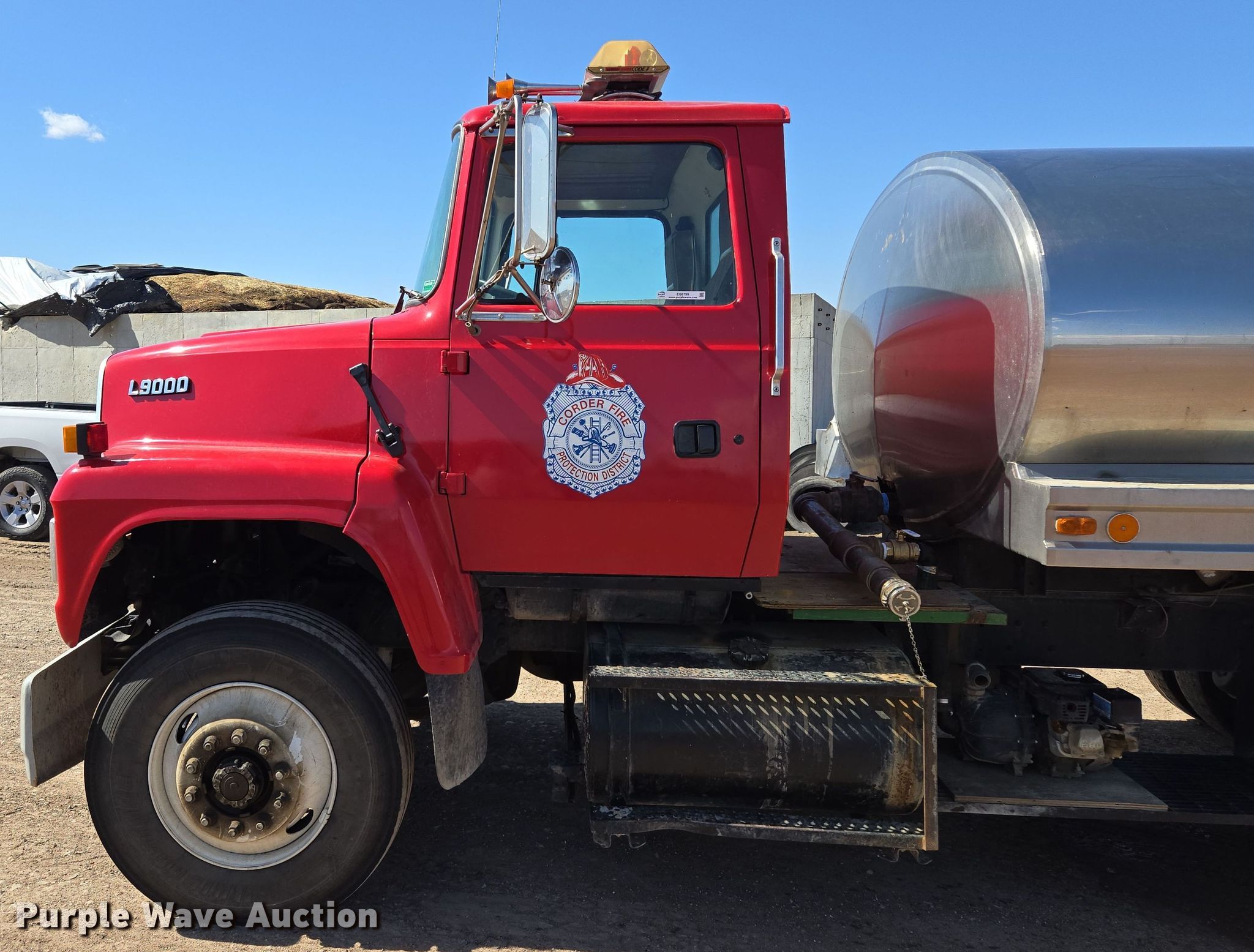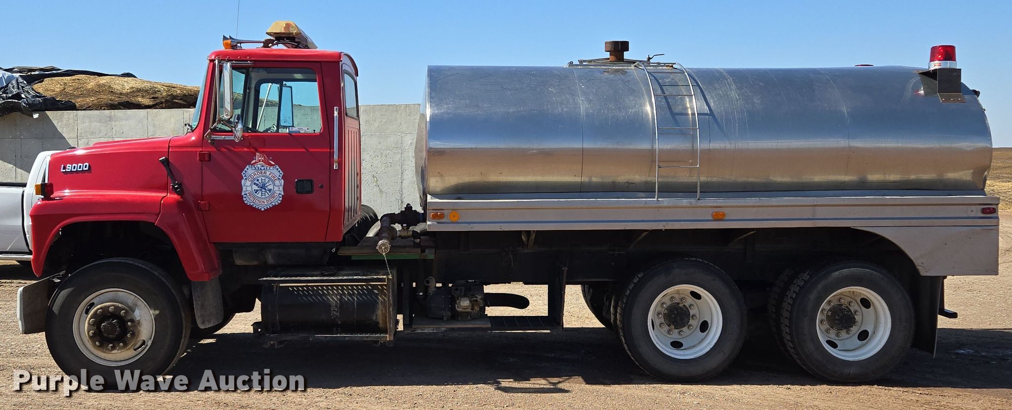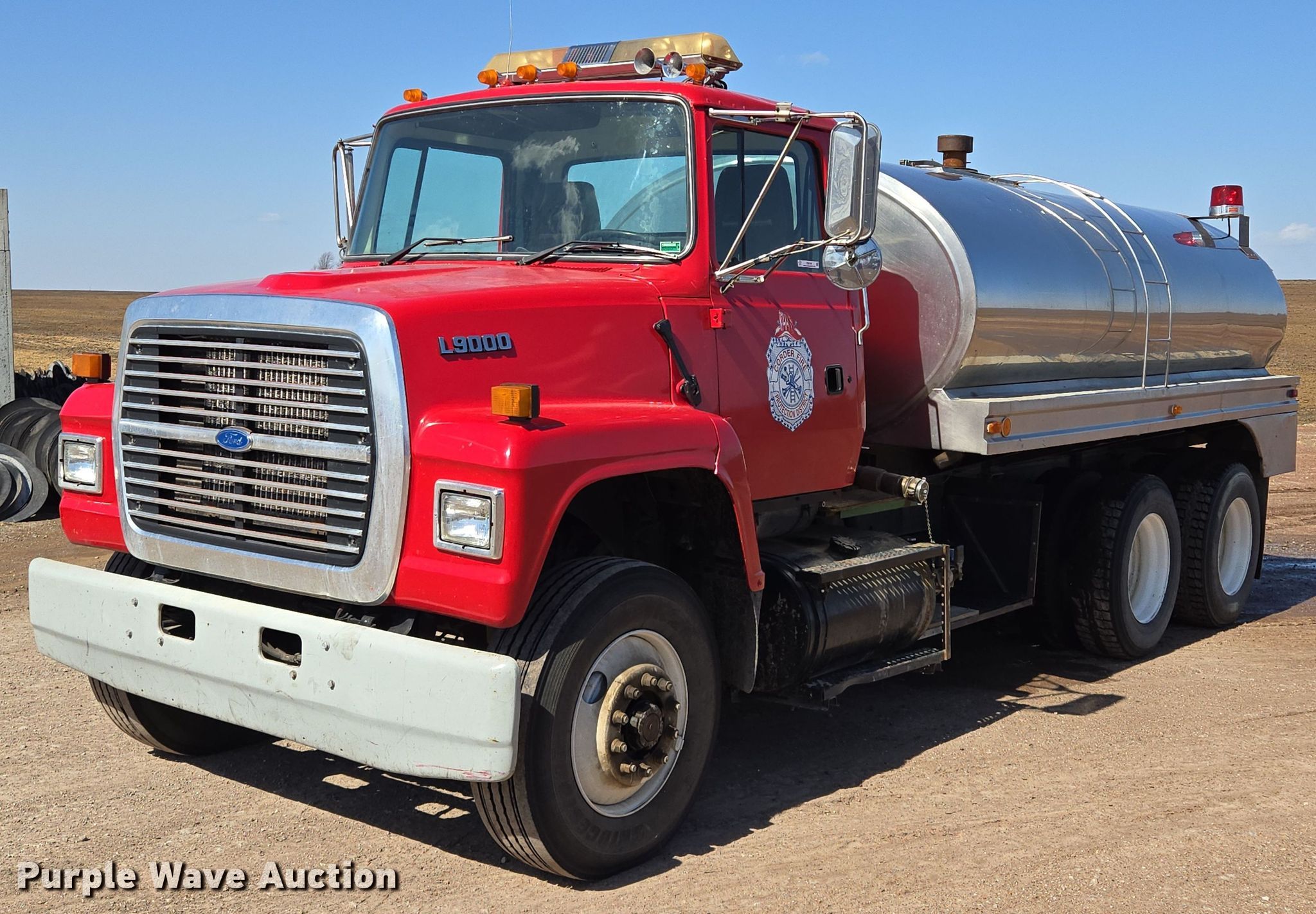 1995 Ford L9000 tanker fire truck. Miles: 287,594 on odometer, VIN: 1FDYW90LXSVA63902. Engine Cummins L10-280, Displacement: 10.0L, Cylinders: 6, Fuel type: Diesel. Transmission Eaton Fuller Roadranger, Manual, Speed: 9. Chassis Axles: Tandem, Differential lock: Inter-axle, Suspension: Spring over walking beam, Brakes: Air, GVWR: 47,880 lbs. Interior AC, Heat. Features Bed / tank 15' L x 93" W, Capacity: 3,000 gallons, Top fill, Rear fill outlet, Side fill outlet, Rear drain: 10", Insulated tank, Light panel control box. Tires Size: 295/75R22.5. Notes Exhaust leak. Missouri title. Title distribution may be delayed up to 14 days from verification of funds. Corder Fire Protection District. Corder, MO 64021