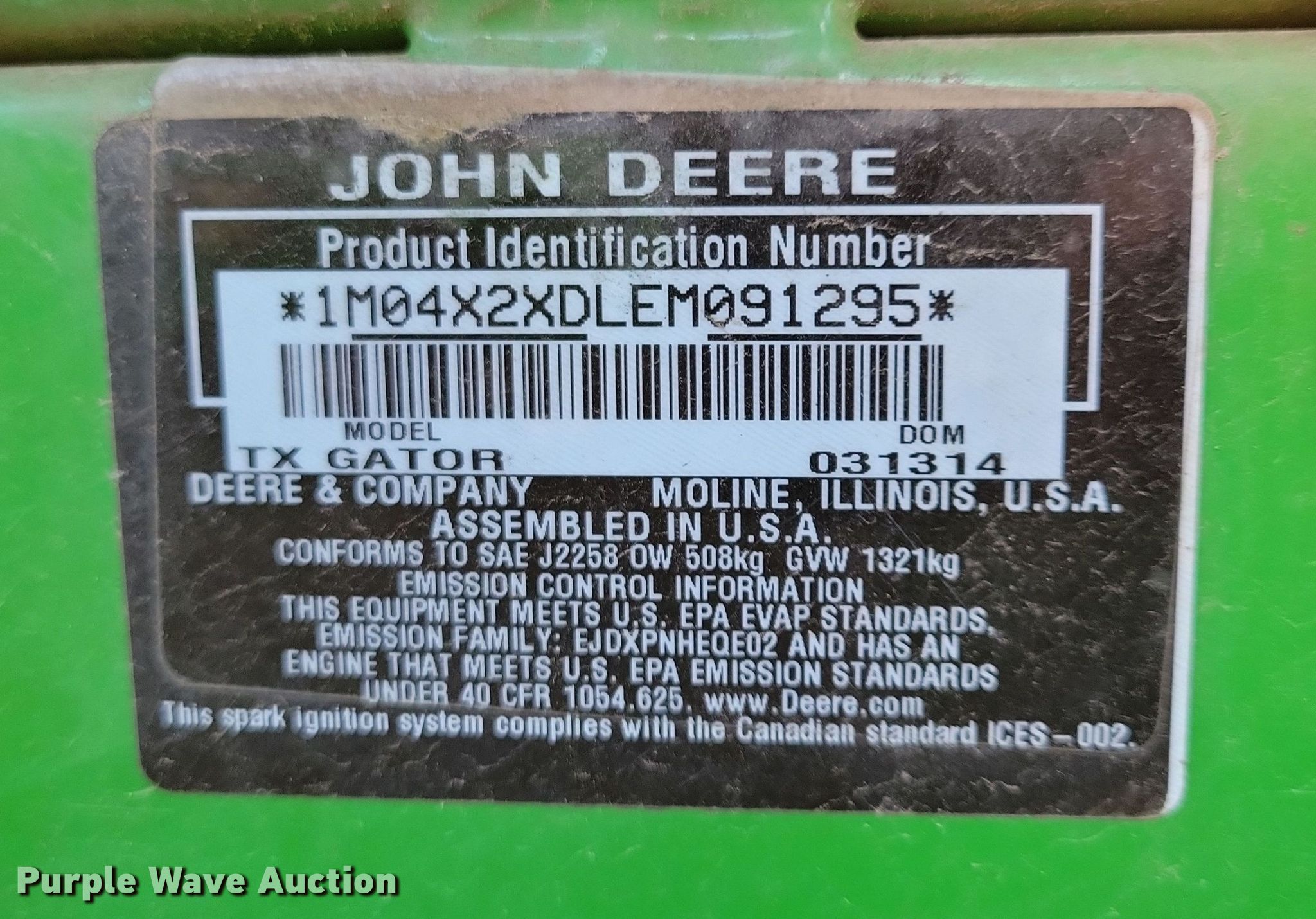 Purple Wave is selling a used Utility Vehicle in South Dakota. This item is a 2014 John Deere Gator TX utility vehicle with the following: Hours: 2,633 on meter, VIN: 1M04X2XDLEM091295, Unit #: 51-38