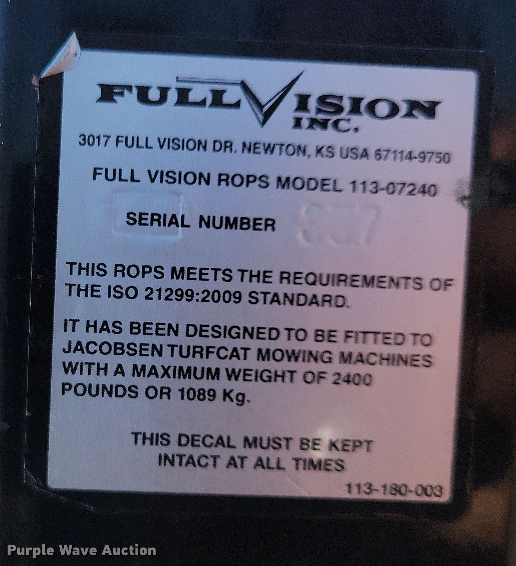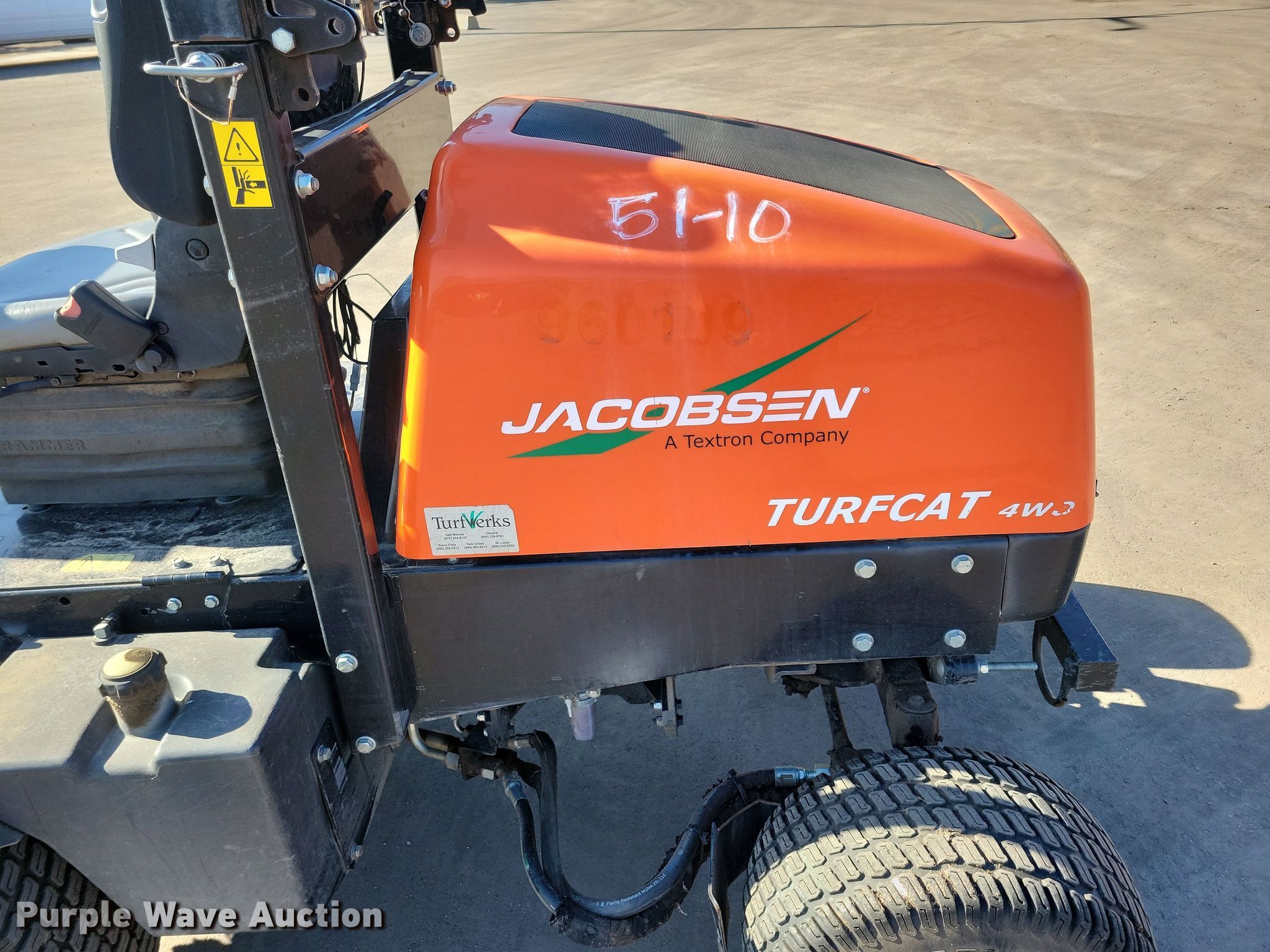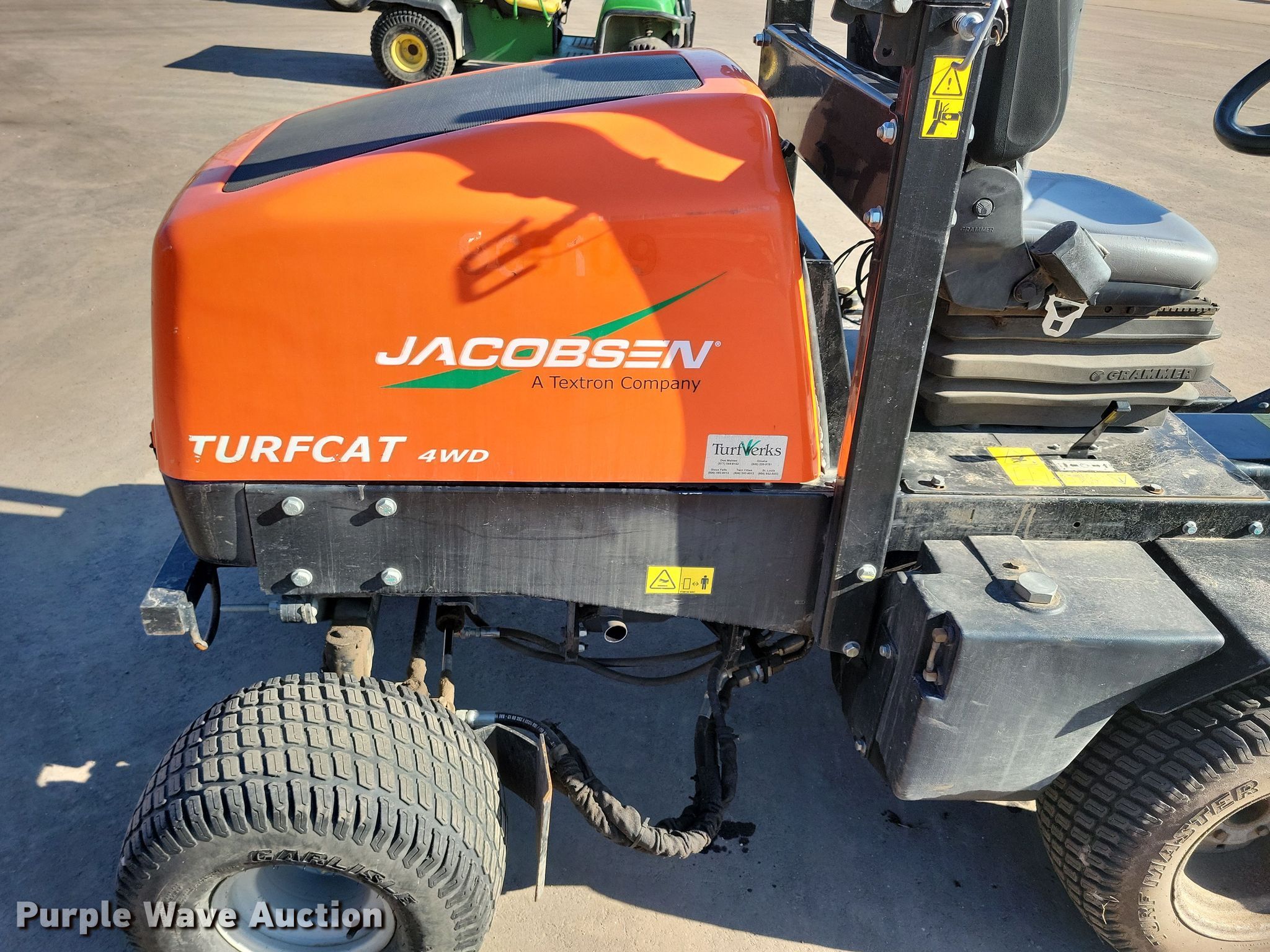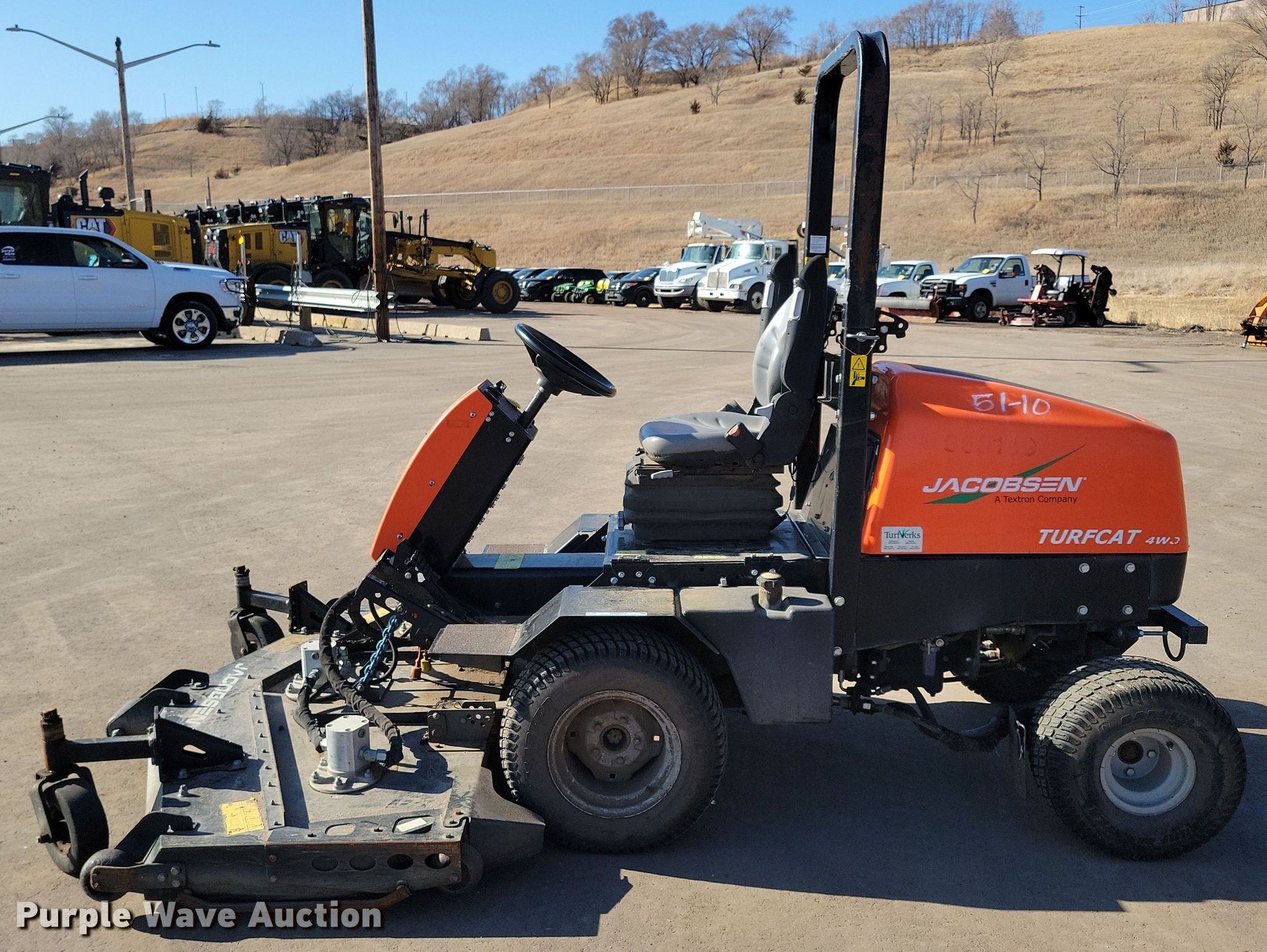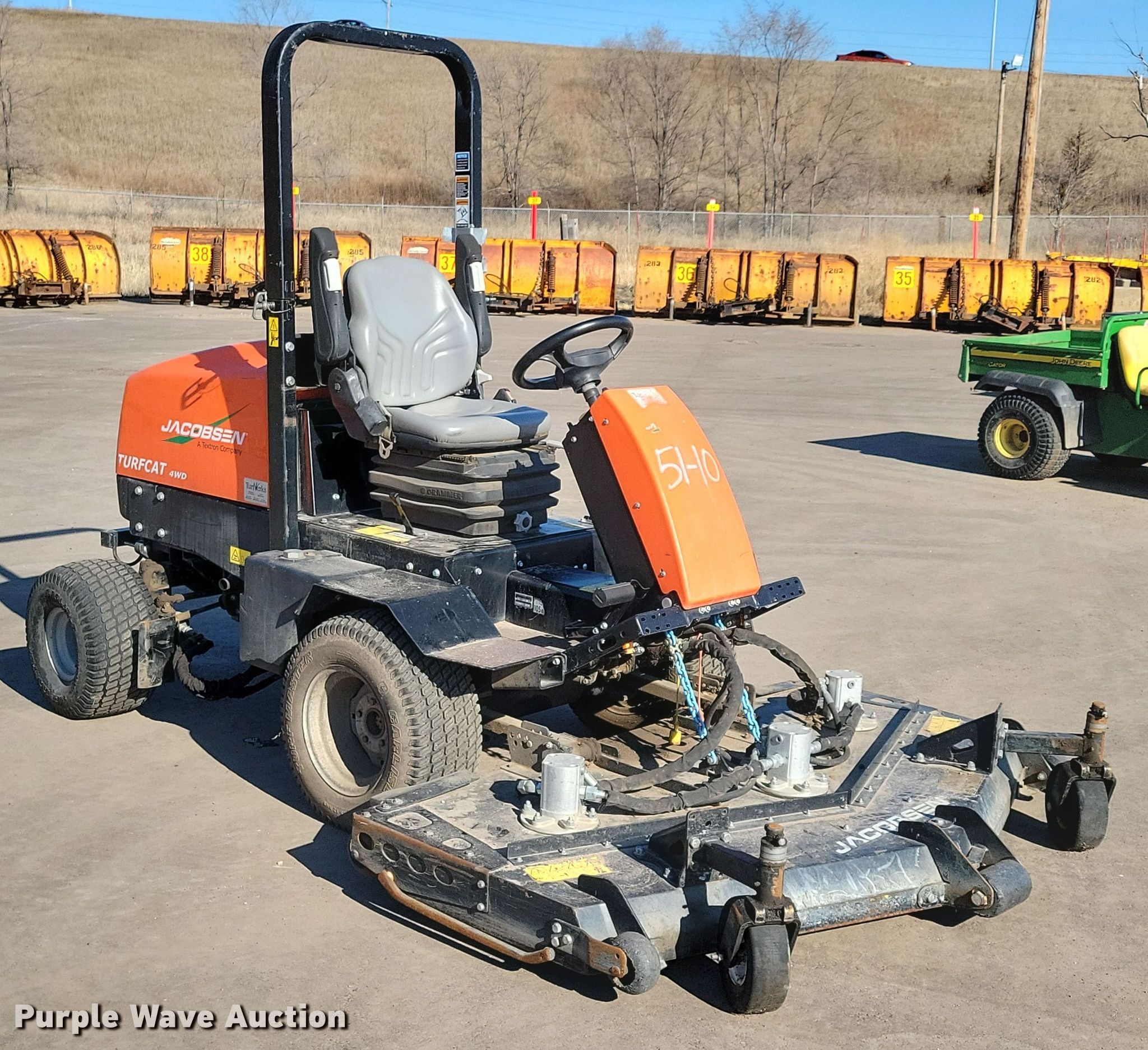 Jacobsen Turfcat lawn mower. Hours: 3,071 on meter, Cutting width: 72", Serial: 691804212-01708, Unit #: 51-10. Engine Kubota D1105, Serial: 1FJ0602, Displacement: 1.1L, Cylinders: 3, Fuel type: Diesel. Transmission Hydrostatic. Chassis Four wheel drive. Operators station OROPS. Features Hydraulic front deck lift. Tires Front: 25x10.5-12, Rear: 20x10-8. Notes Dead battery. City of Sioux Falls - Open Inspection April 11. Sioux Falls, SD 57104