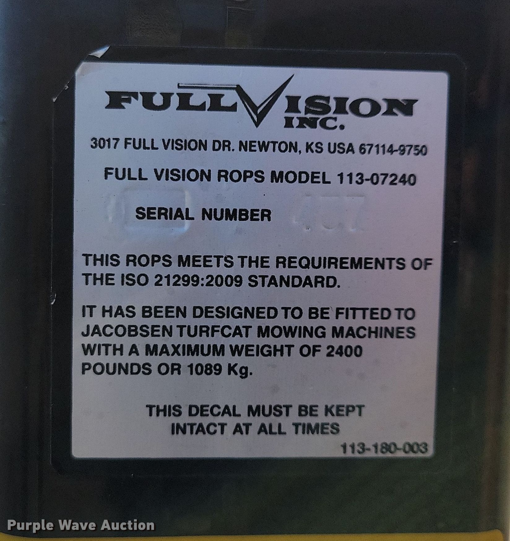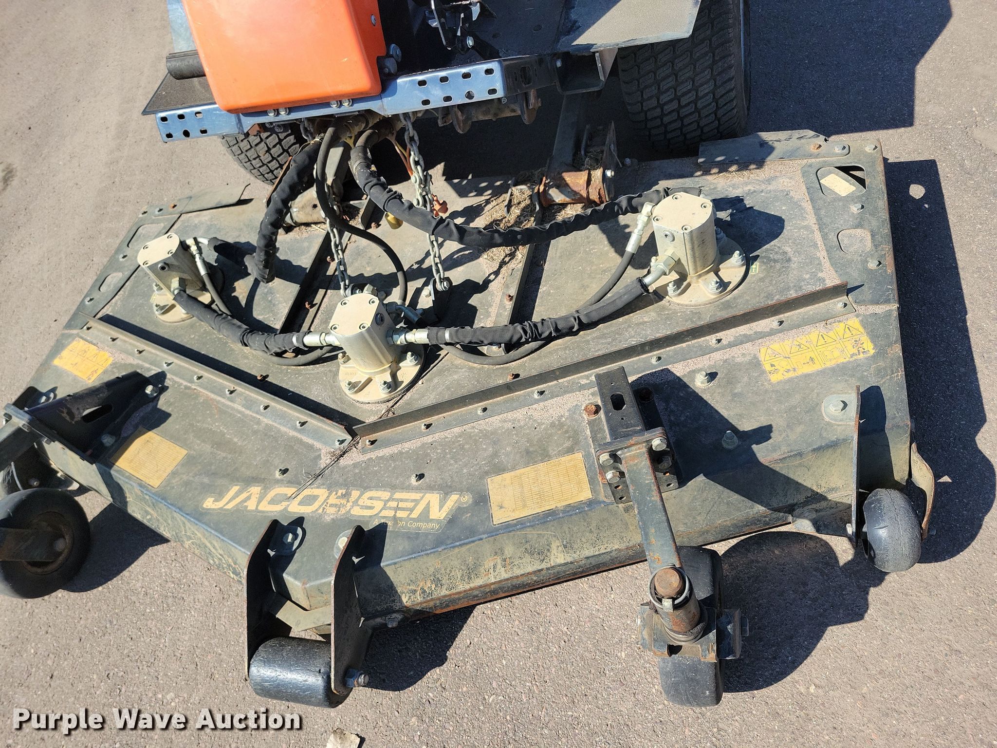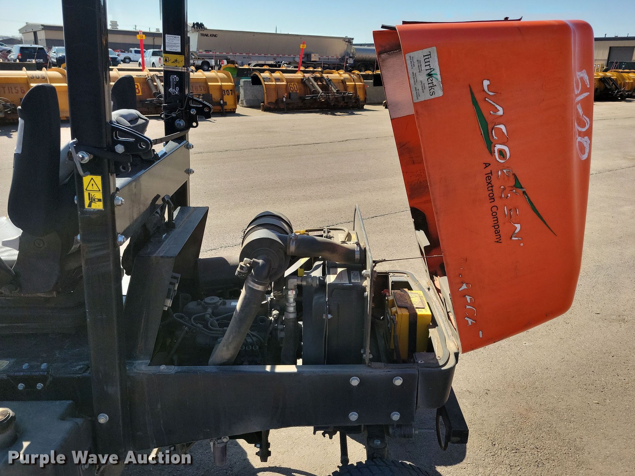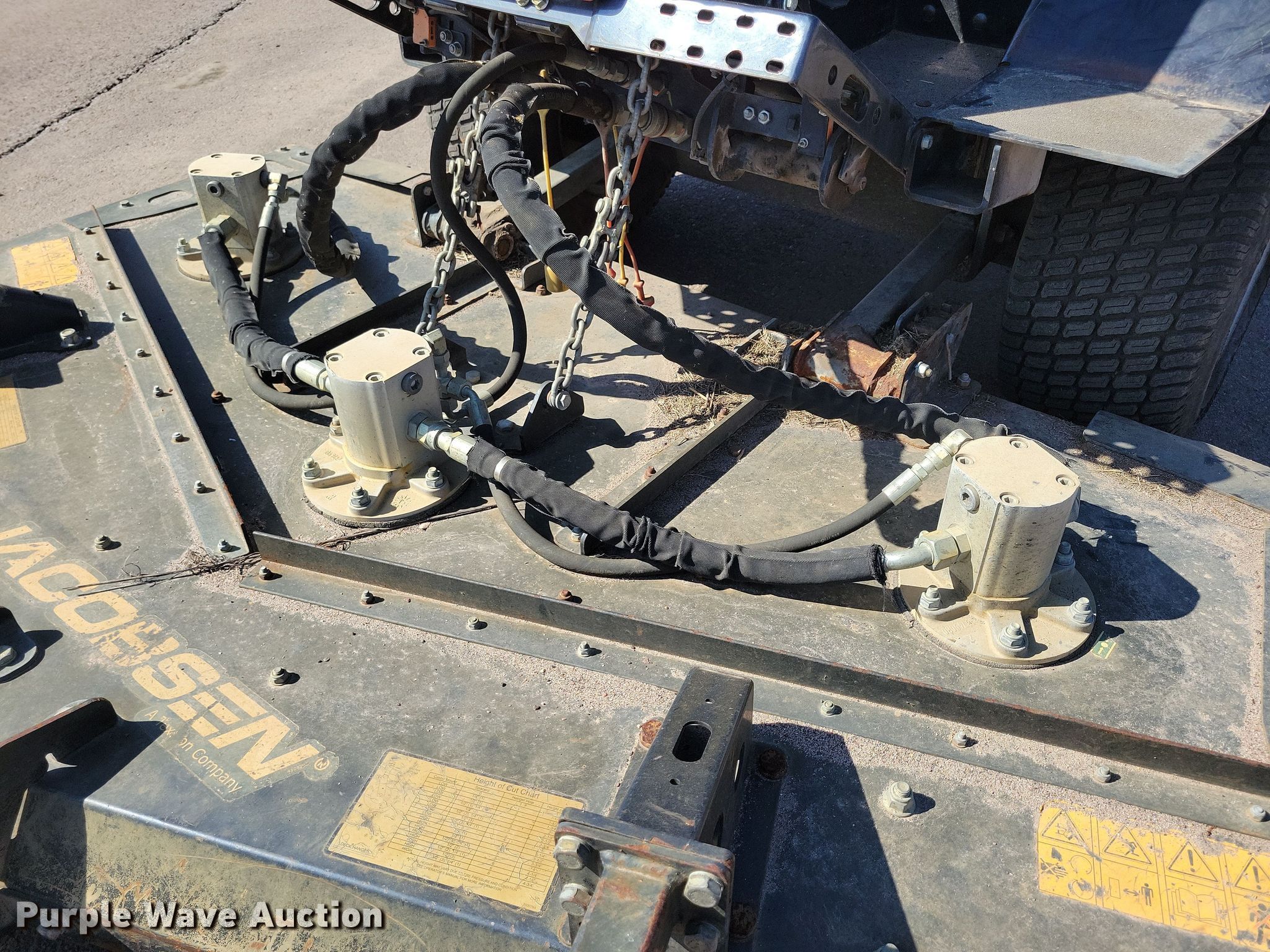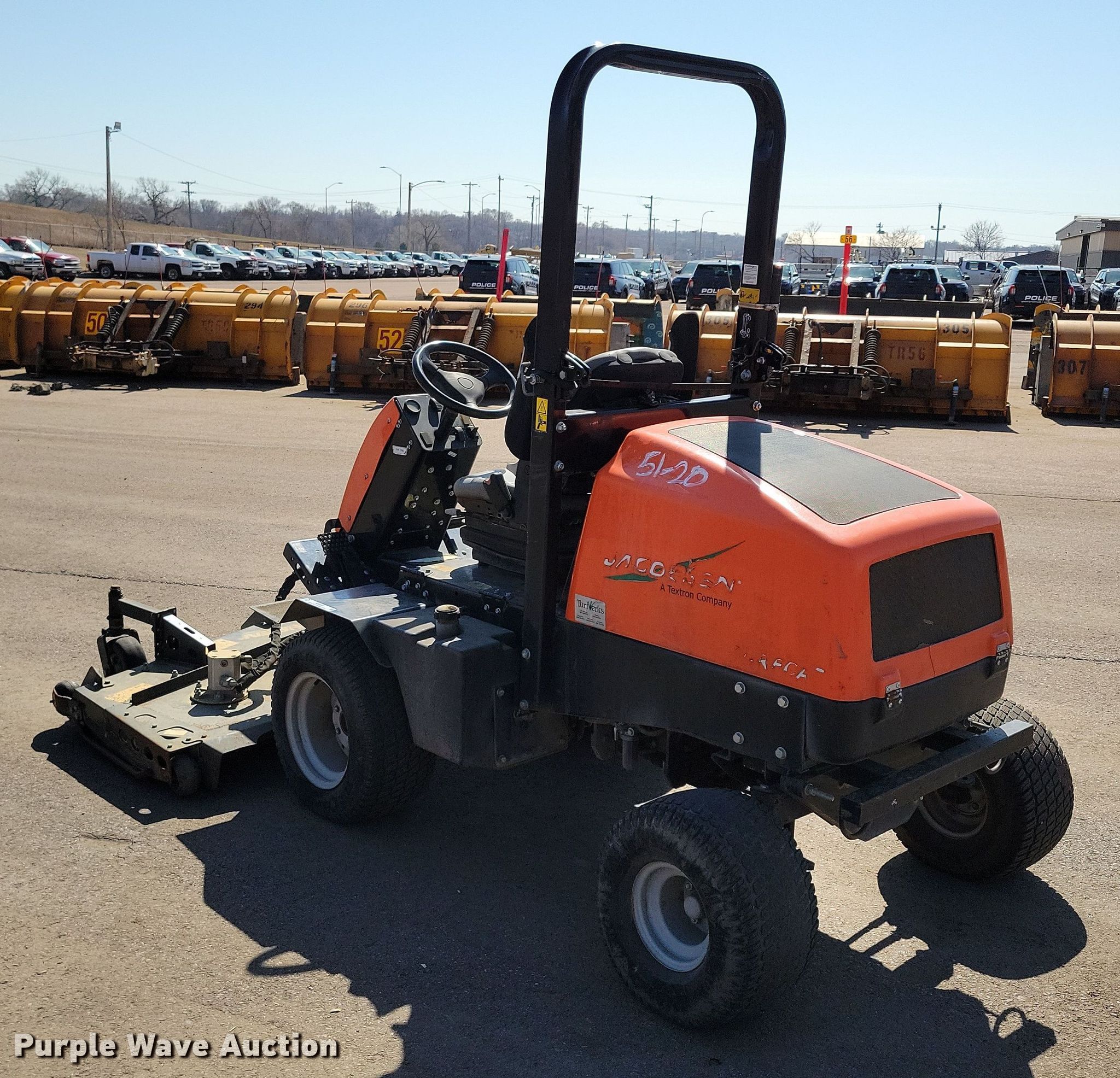 Jacobsen Turfcat lawn mower. Hours: 1,915 on meter, Cutting width: 72", Serial: 691802212-01757, Unit #: 51-20. Engine Kubota D1105, Serial: 1FN1356, Displacement: 1.1L, Cylinders: 3, Fuel type: Diesel, kW: 18.5. Transmission Hydrostatic. Operators station OROPS. Features Hydraulic front deck lift. Tires Front: 23x10.5-12, Rear: 20x10-8. Notes Dead battery. City of Sioux Falls - Open Inspection April 11. Sioux Falls, SD 57104
