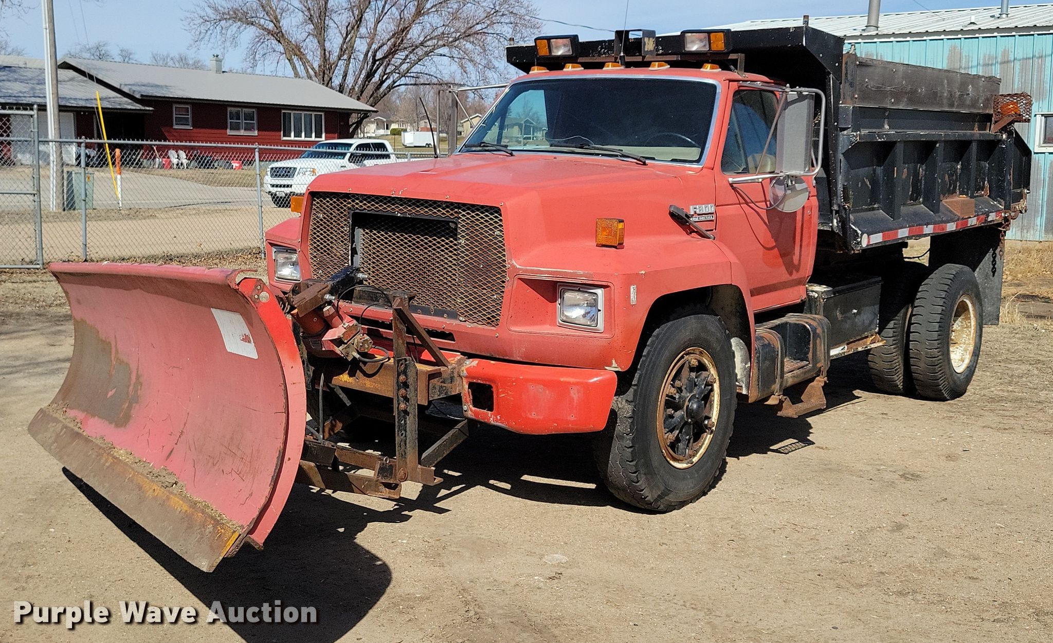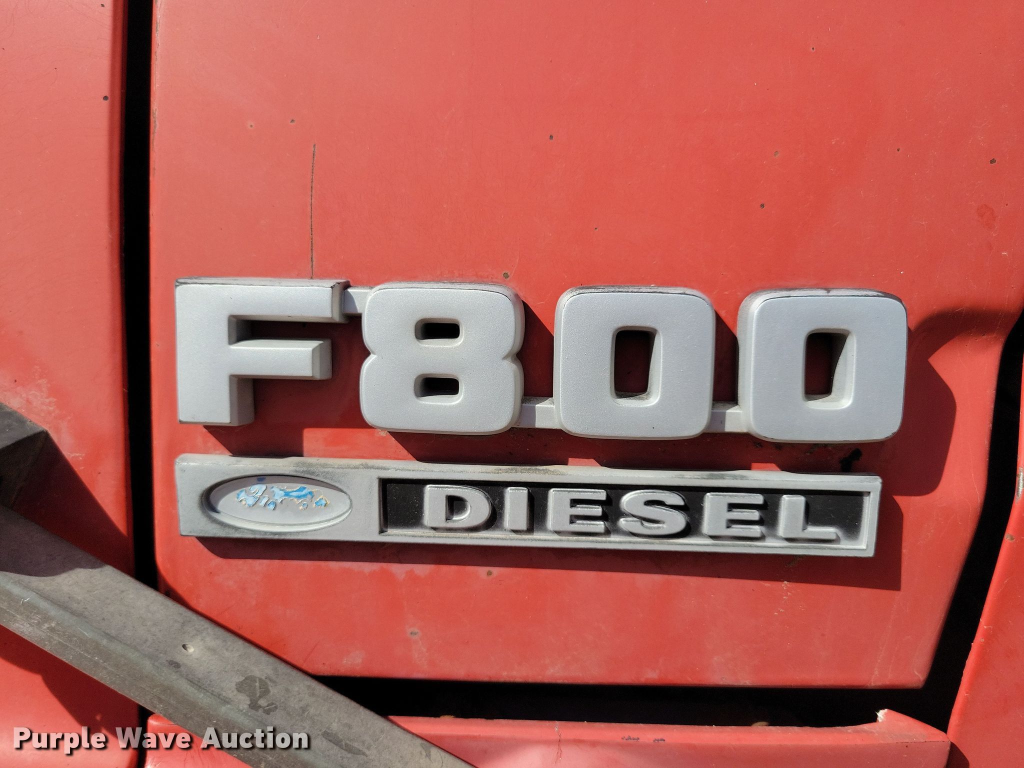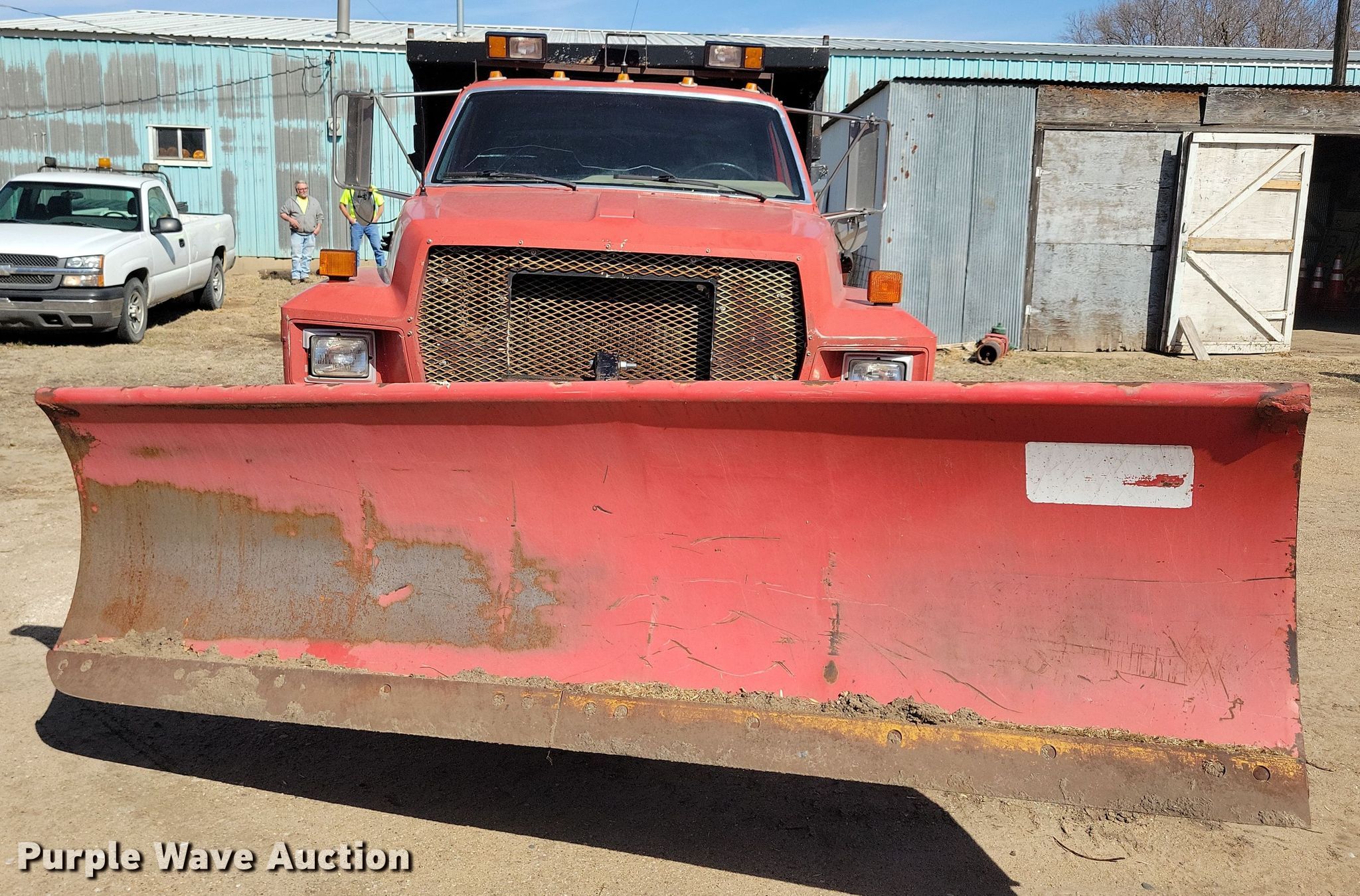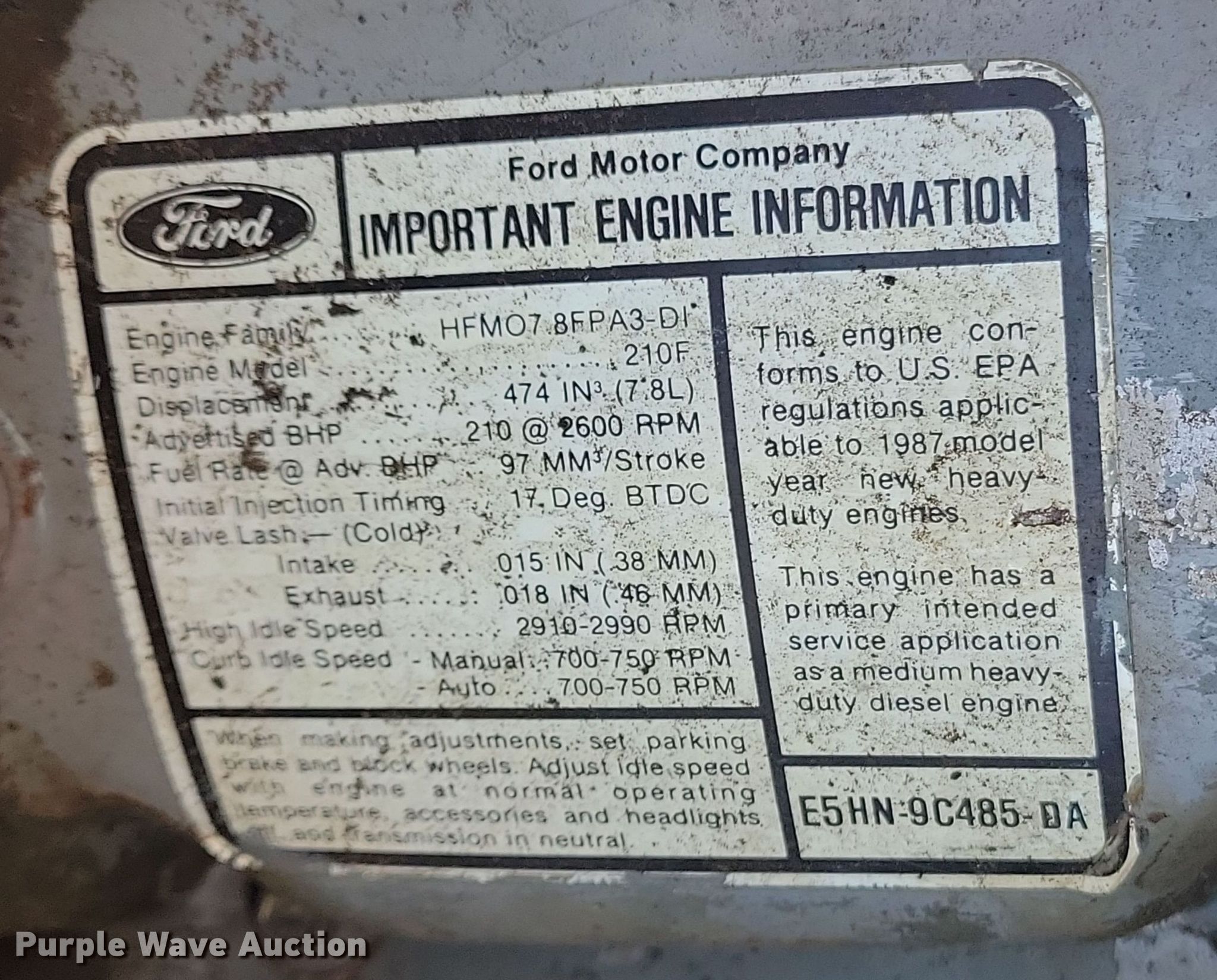 1987 Ford F800 dump truck. Miles: 195,564 on odometer, VIN: 1FDPT84A3HVA65989. Engine Displacement: 7.8L, Cylinders: 6, Fuel type: Diesel. Transmission Manual, Speed: 5, plus 2. Chassis Axles: Single, Suspension: Spring, Brakes: Hydraulic, PTO, GVWR: 28,000 lbs, Wheelbase: 158". Interior Heat. Features Dump bed 10' L x 96" W, Side height: 30", Side board height: 10", Bed type: Steel, Ram: Single, End gate: Manual, Plow Western, Width: 120". Tires Front: 10.00R20, Rear: 10.00-20. Notes Rust damage, Fuel leak, Windshield chipped or cracked, Non-operational plow. Nebraska title. Seller is a government entity who will be assigning and distributing the title. Please contact the seller for distribution questions. City of Pierce, NE. Pierce, NE 68767