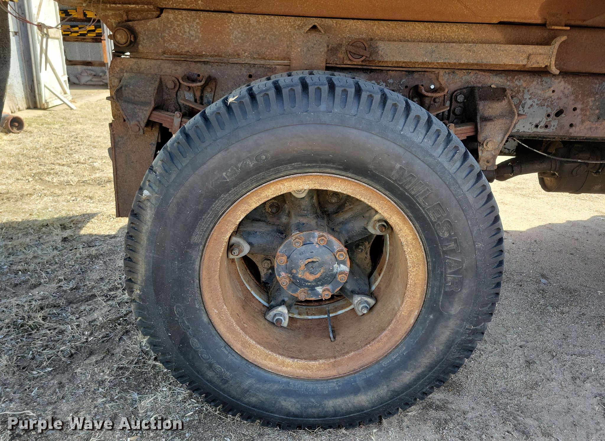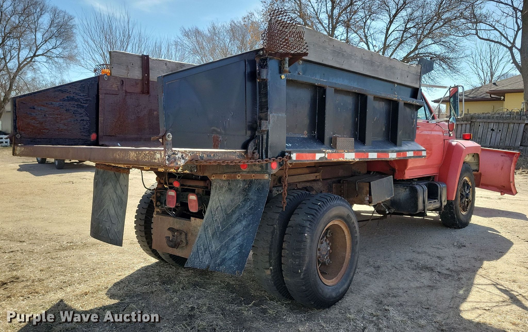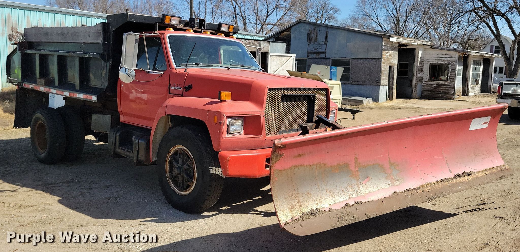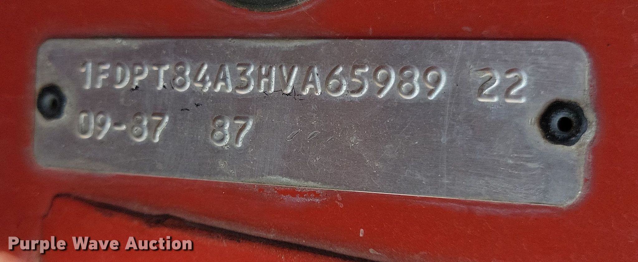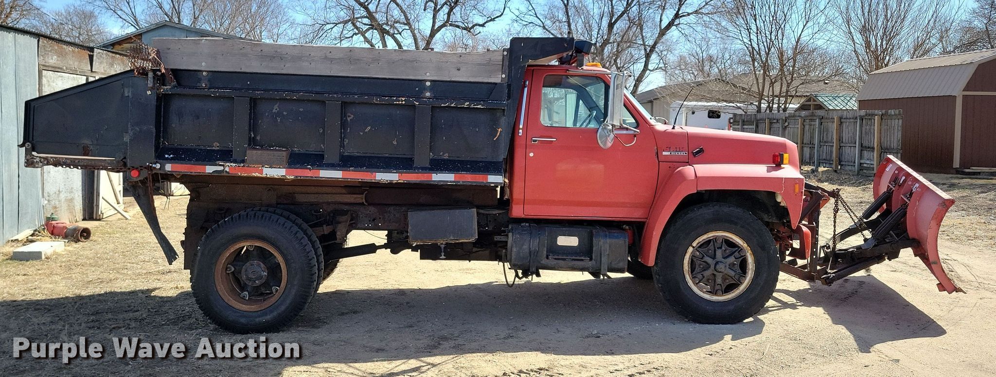 1987 Ford F800 dump truck. Miles: 195,564 on odometer, VIN: 1FDPT84A3HVA65989. Engine Displacement: 7.8L, Cylinders: 6, Fuel type: Diesel. Transmission Manual, Speed: 5, plus 2. Chassis Axles: Single, Suspension: Spring, Brakes: Hydraulic, PTO, GVWR: 28,000 lbs, Wheelbase: 158". Interior Heat. Features Dump bed 10' L x 96" W, Side height: 30", Side board height: 10", Bed type: Steel, Ram: Single, End gate: Manual, Plow Western, Width: 120". Tires Front: 10.00R20, Rear: 10.00-20. Notes Rust damage, Fuel leak, Windshield chipped or cracked, Non-operational plow. Nebraska title. Seller is a government entity who will be assigning and distributing the title. Please contact the seller for distribution questions. City of Pierce, NE. Pierce, NE 68767