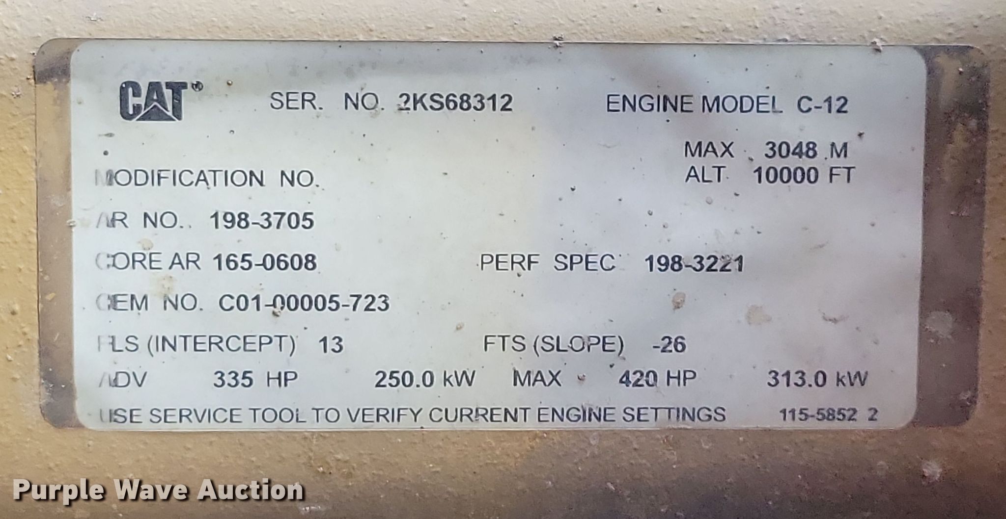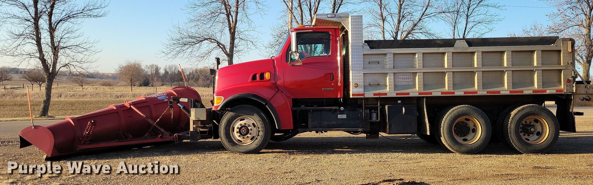 2002 Sterling LT9500 dump truck. Miles: 258,953 on odometer, Hours: 10,329 on meter, VIN: 2FZHAZAS02AJ50169. Engine Caterpillar C12, Serial: 2KS68312, Displacement: 11.9L, Cylinders: 6, Fuel type: Diesel, HP: 505, kW: 339. Transmission Eaton Fuller 8LL, Manual, Speed: 10. Chassis Double frame, Axles: Tandem, Differential lock: Full, Suspension: Spring over walking beam, Brakes: Air, Front mount PTO, GVWR: 56,000 lbs FAWR: 16,000 lbs, IAWR: 20,000 lbs, RAWR: 20,000 lbs. Interior AC, Heat, Heated mirrors, Power windows, Cruise control. Features Dump bed Drake, 15' L x 96" W, Side height: 36", Side board height: 7", Bed type: Aluminum, Bed vibrator, Liner, Ram: Single, End gate: Air operated, Spreader Swenson, Plow Falls 312-ST, Width: 144", Wing plow Henderson, Width: 108". Tires Front: 315/80R22.5, Rear: 11R22.5. Notes Windshield chipped or cracked. Iowa title. Seller is a government entity who will be assigning and distributing the title. Please contact the seller for distribution questions. Title distribution may be delayed up to 14 days from verification of funds. Sioux County Engineers. Hawarden, IA 51023