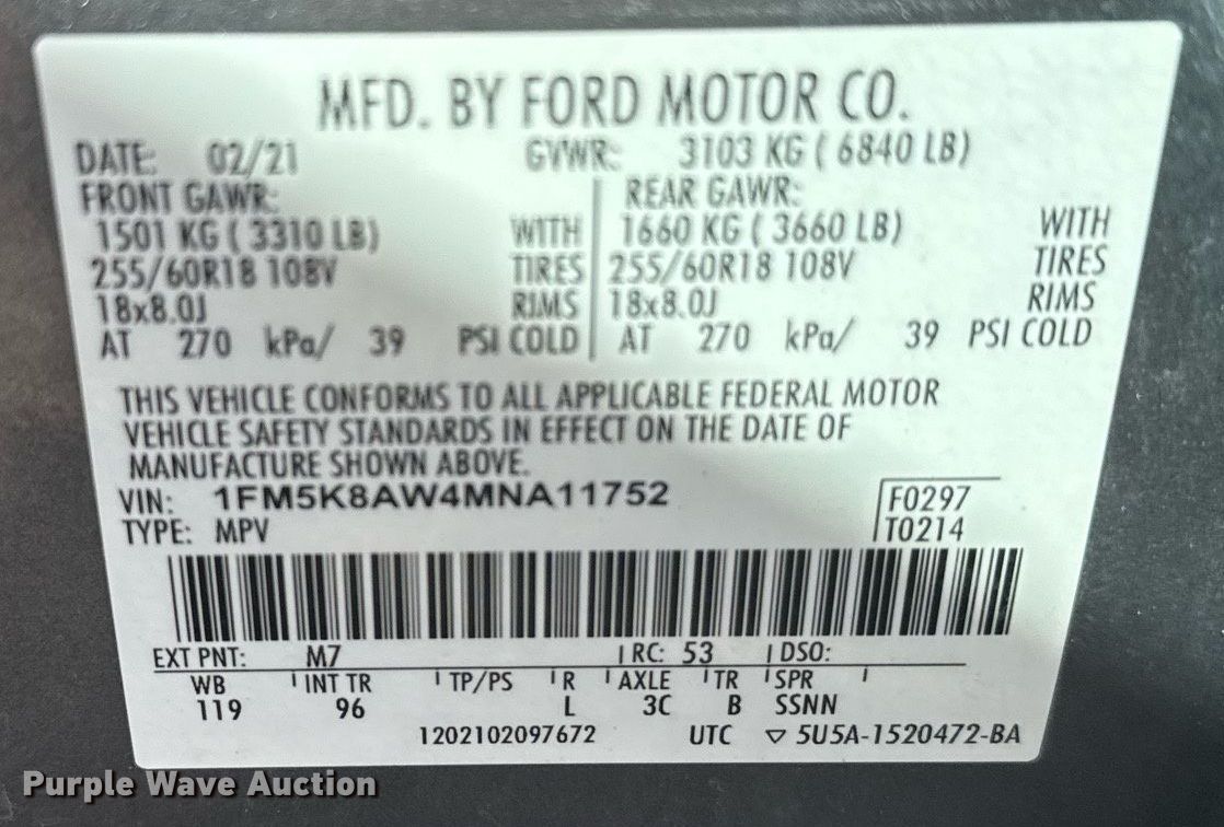 - VIN: 1FM5K8AW4MNA11752