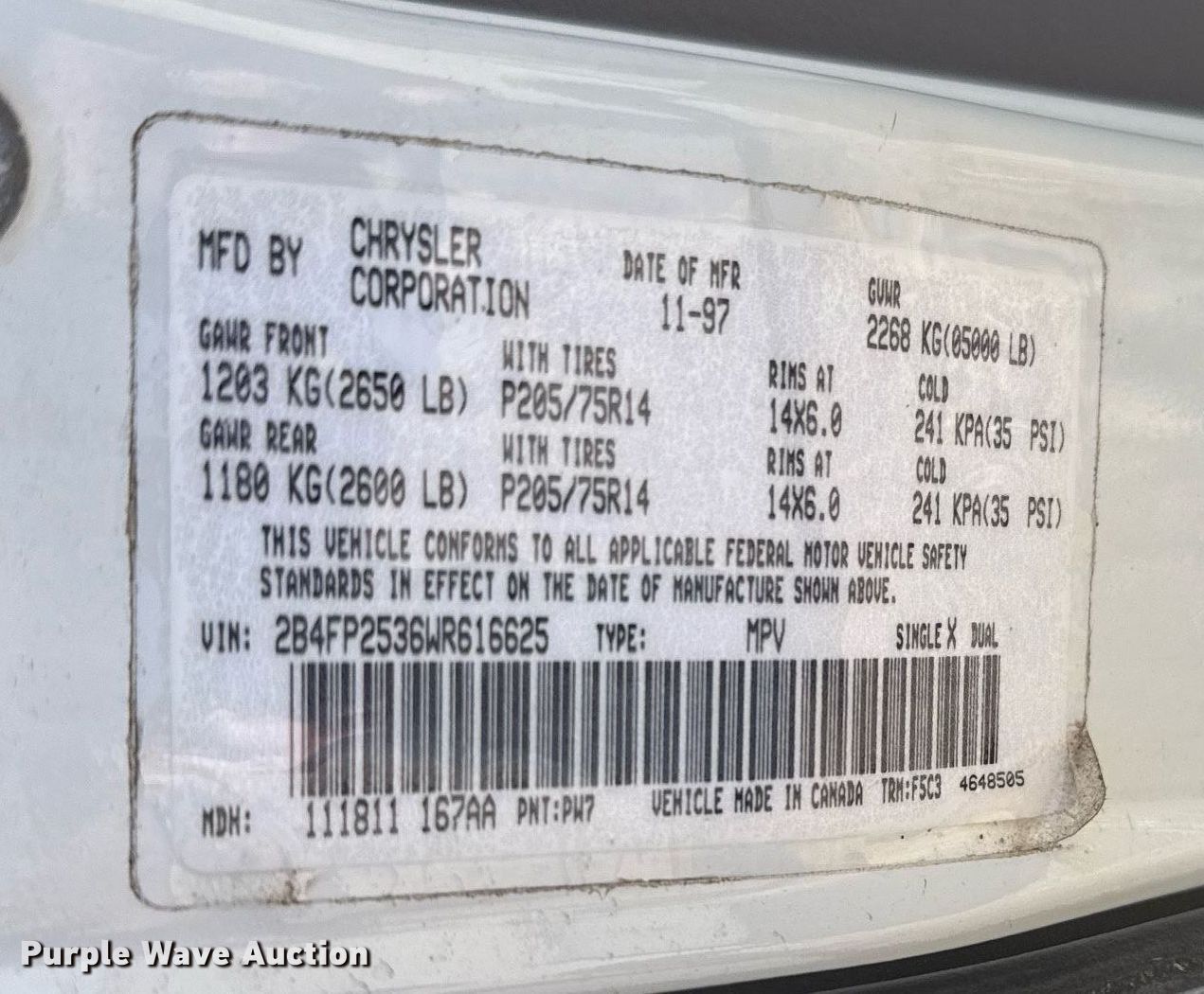 Purple Wave is selling a used Passenger Vehicle in Kansas. This item is a 1998 Dodge Caravan van with the following: Miles: 71,910 on odometer, VIN: 2B4FP2536WR616625