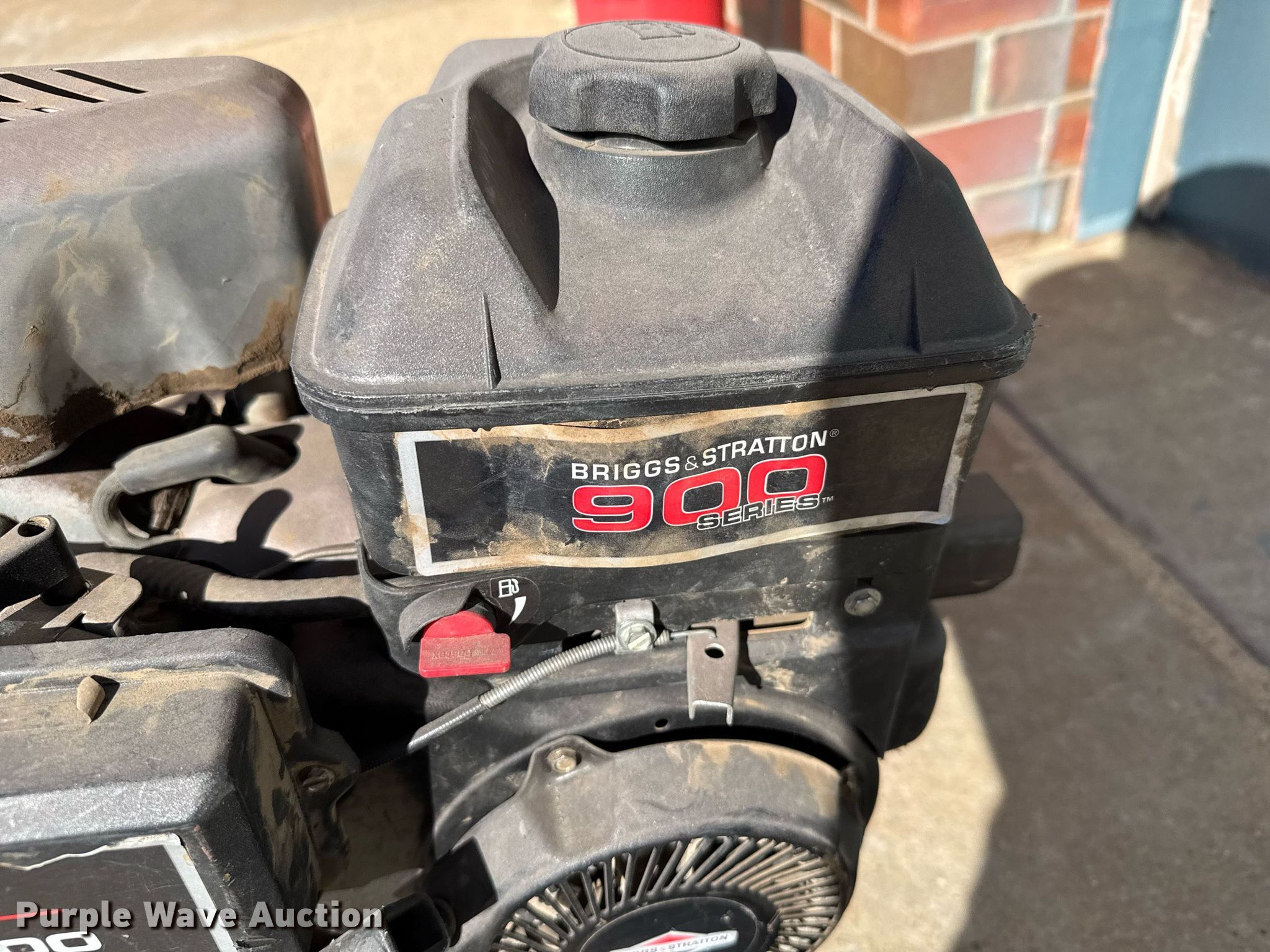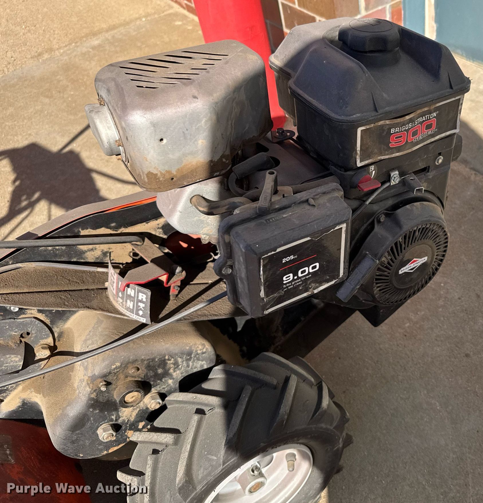 Husqvarna DRT900E rear-tine tiller. Serial: 041210T002917. Engine Briggs & Stratton 900 Series, Displacement: 205 cc, Cylinders: 1, Fuel type: Gas, HP: 9, Electric start. Transmission Automatic. Features Tilling width: 18", Tilling depth: 6.5". Tires Size: 12x5.00-6. Notes Non-operational engine, Non-operational unit. Ellsworth Correctional Facility. Ellsworth, KS 67439