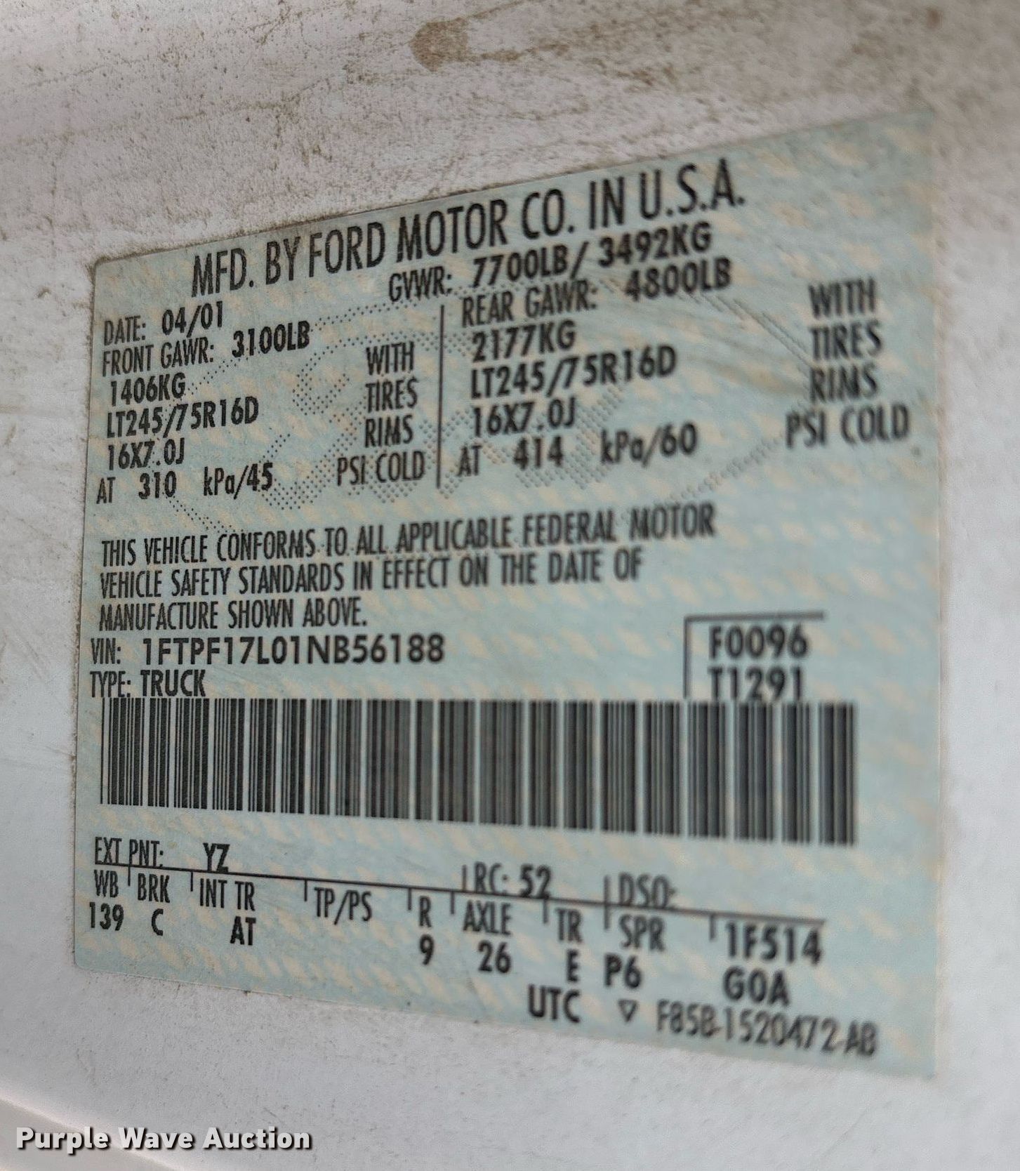 Purple Wave is selling a used 1/2 Ton Pickup or Van in Oklahoma. This item is a 2001 Ford F150 pickup truck with the following: Miles: Unknown, VIN: 1FTPF17L01NB56188, Unit #: 202