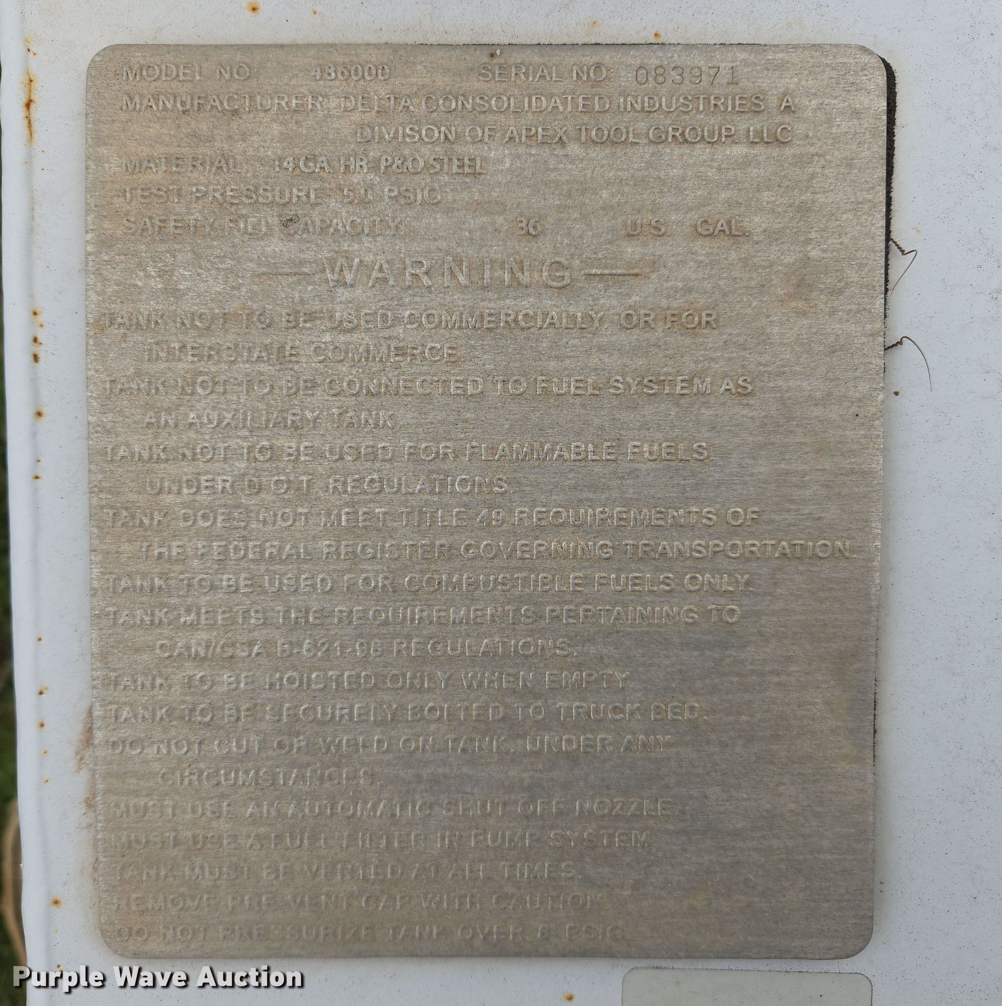 Purple Wave is selling a used Automotive Parts or Acces. in Texas. This item is a Delta 486000 auxiliary fuel Tank with the following: Serial: 083971, Capacity: 36 gallons