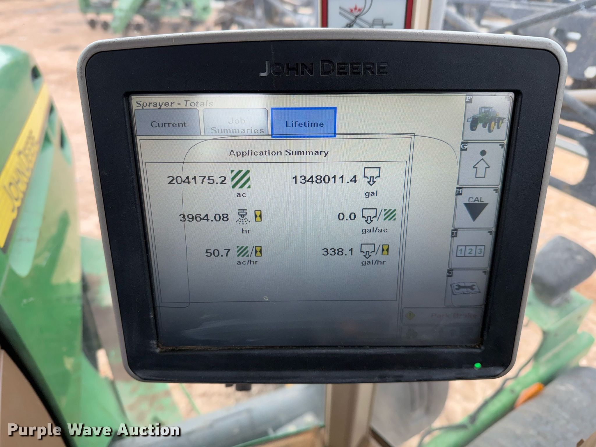 2011 John Deere 4730 sprayer. Engine hours: 3,489 on meter, Spray hours: 3,964 on meter, Serial: 1N04730XVA0013479. Engine John Deere, Cylinders: 6, Fuel type: Diesel. Transmission Hydrostatic, Four wheel drive. Chassis Hydraulic axle width adjust. Operators station AC, Heat. Features Hydraulic ladder, Solution tank Capacity: 800 gallons, Type: Stainless Steel, Chemical eductor Capacity: 15 gallons, Type: Stainless Steel, Rinse tank Capacity: 120 gallons, Clean water tank, Boom Width: 100', Sections: 5, Boom breakaway, Hydraulic boom fold, Hydraulic height control, Automatic height control, Nozzle Spacing: 15", Nozzle bodies: 5-way, Electronics GPS monitor GreenStar GS3, Auto steer. Tires Size: 380/90R46, Row crop tires. High Plains Hay Producers. Groom, TX 79039