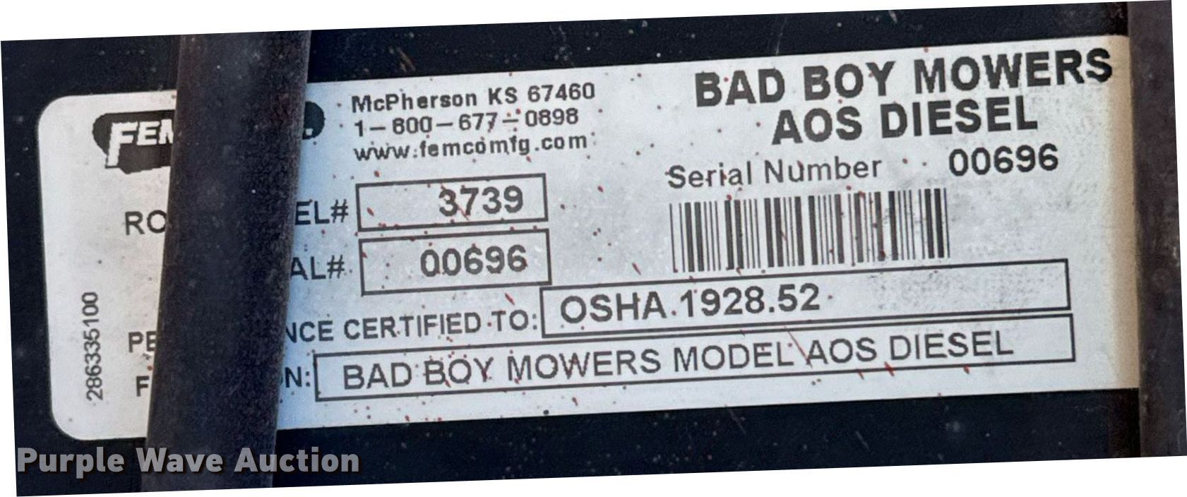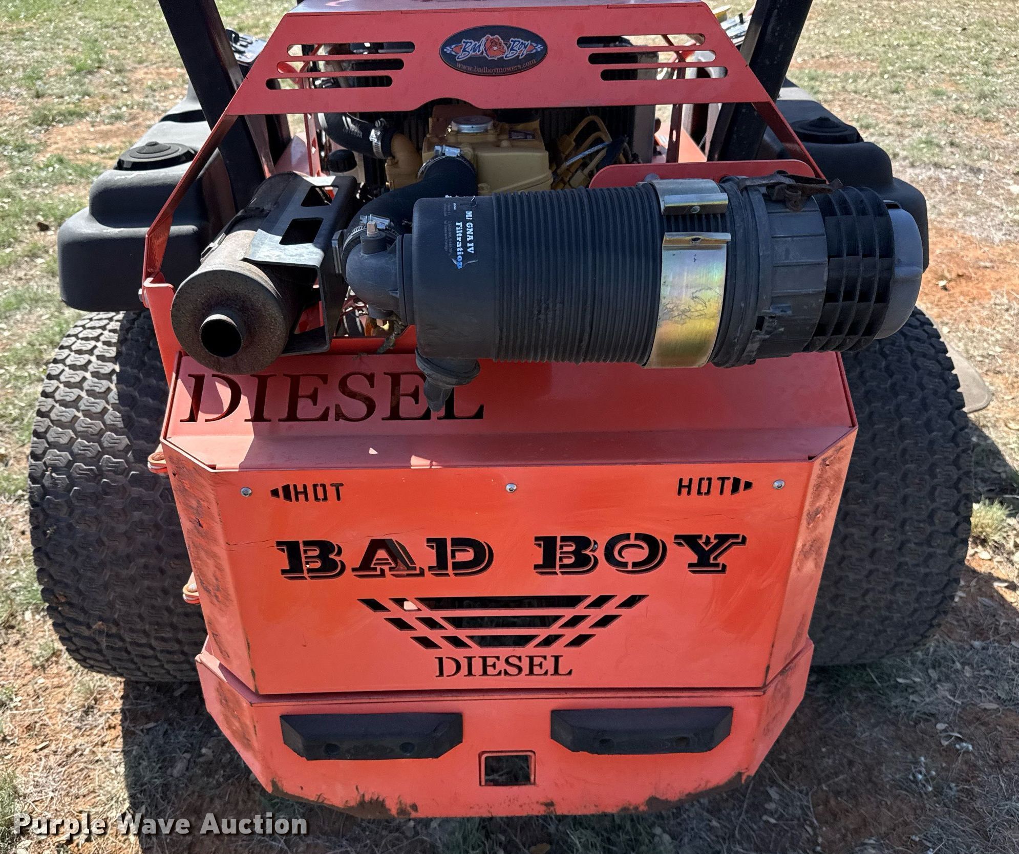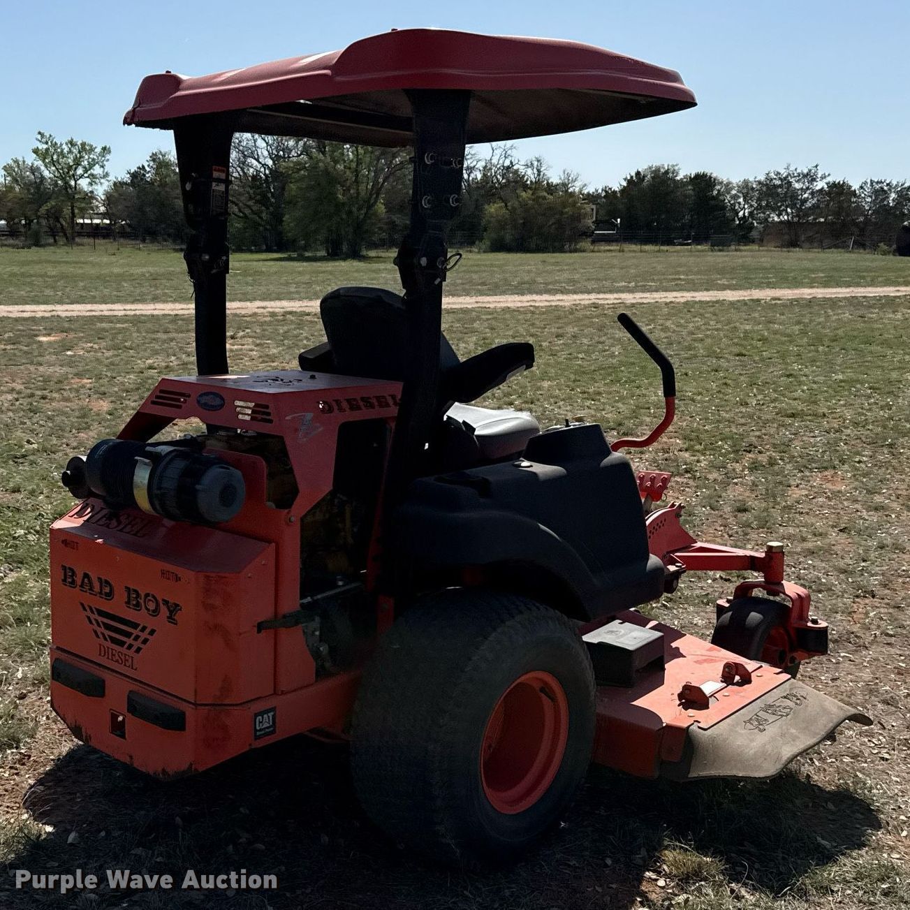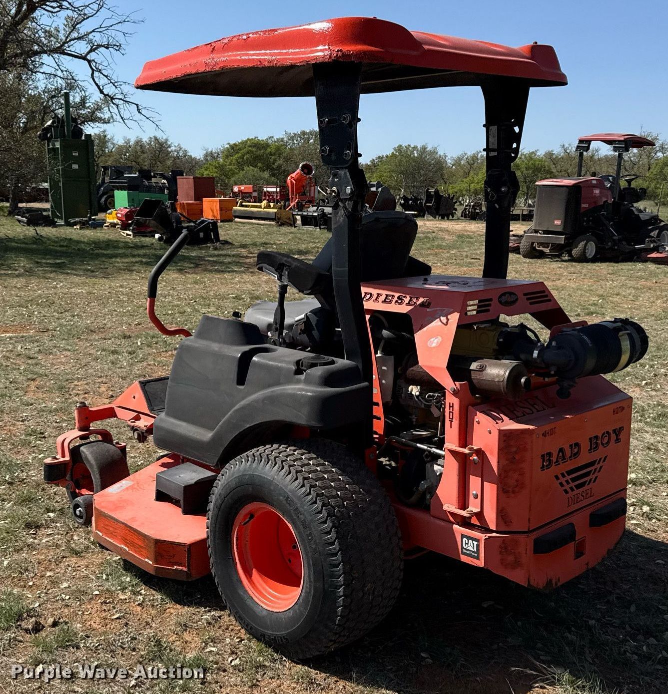 2012 Bad Boy Z Pro ZTR lawn mower. Hours: 487 on meter, Cutting width: 61", Serial: BBD6128CA05121010. Engine Caterpillar C1.1, Displacement: 1.131L, Cylinders: 3, Fuel type: Diesel. Transmission Hydrostatic. Operators station OROPS. Tires Front: 13x6.50-6, Rear: 26x12.00-12. Mike Carpenter. Lampasas, TX 76550