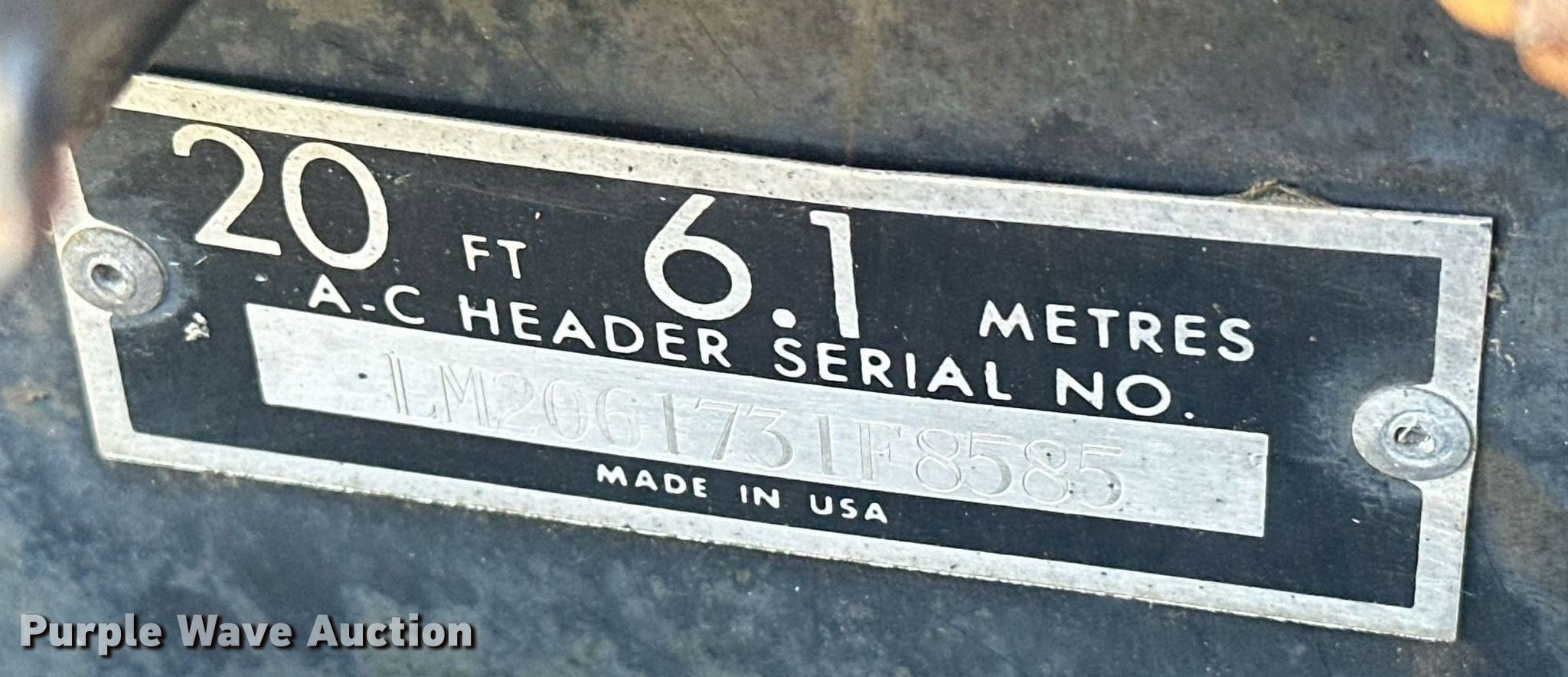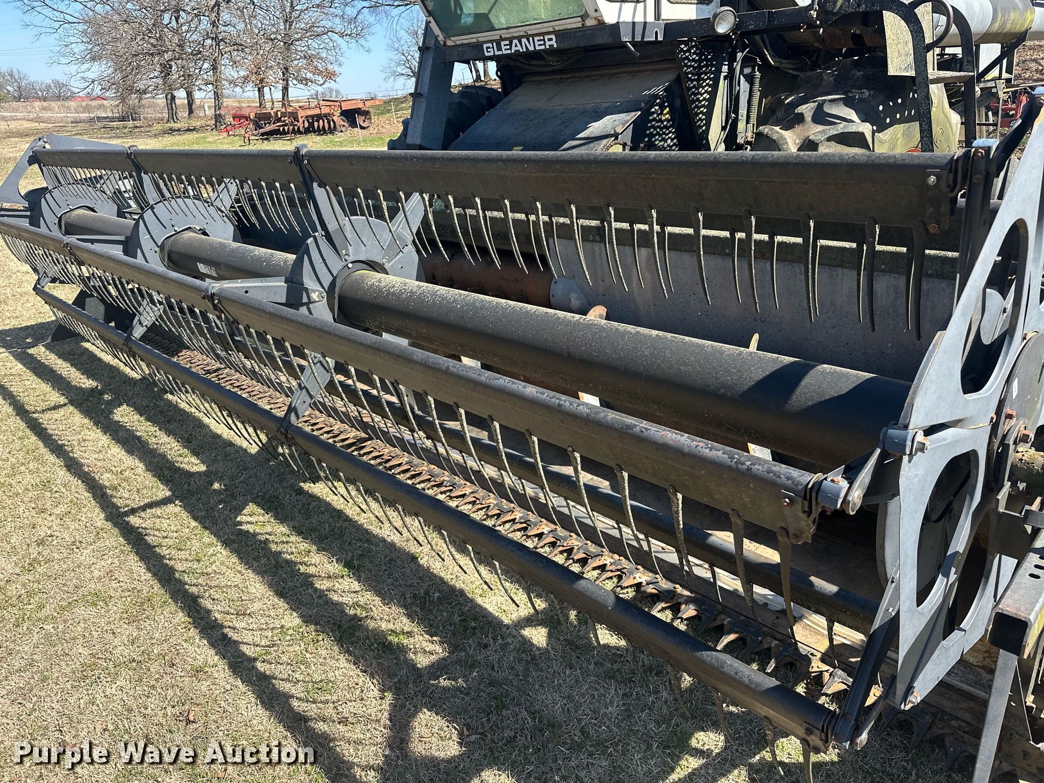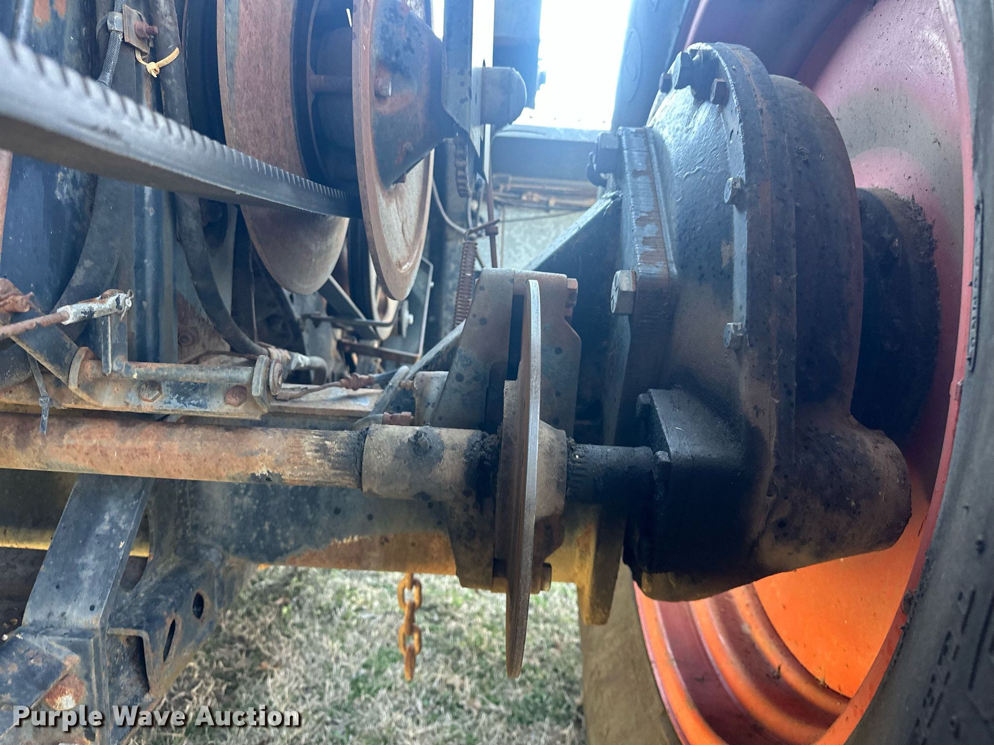 1982 Gleaner L2 combine. Engine hours: 1,885 on meter, Separator hours: 1,836 on meter, Serial: L-K24604H. Engine Cylinders: 6, Fuel type: Diesel. Transmission Hydrostatic, 4F - 4R. Operators station AC, Heat. Features Operator manual, Feederhouse: Lateral tilt, Variable speed, Concaves: Small wire, Chaff spreader, Bin: Extensions, Unloading auger length: 14', Header Deutz-Allis 320, Serial: LM2061731F8585, Platform head Rigid, Width: 20', Reel: Finger Hydraulic reel height control, Skid plates: Steel, Drivelines: Single. Tires Front: 23.1-34, Rear: 14L-16.1. Notes Unknown operating condition of AC. Stratford, OK 74872