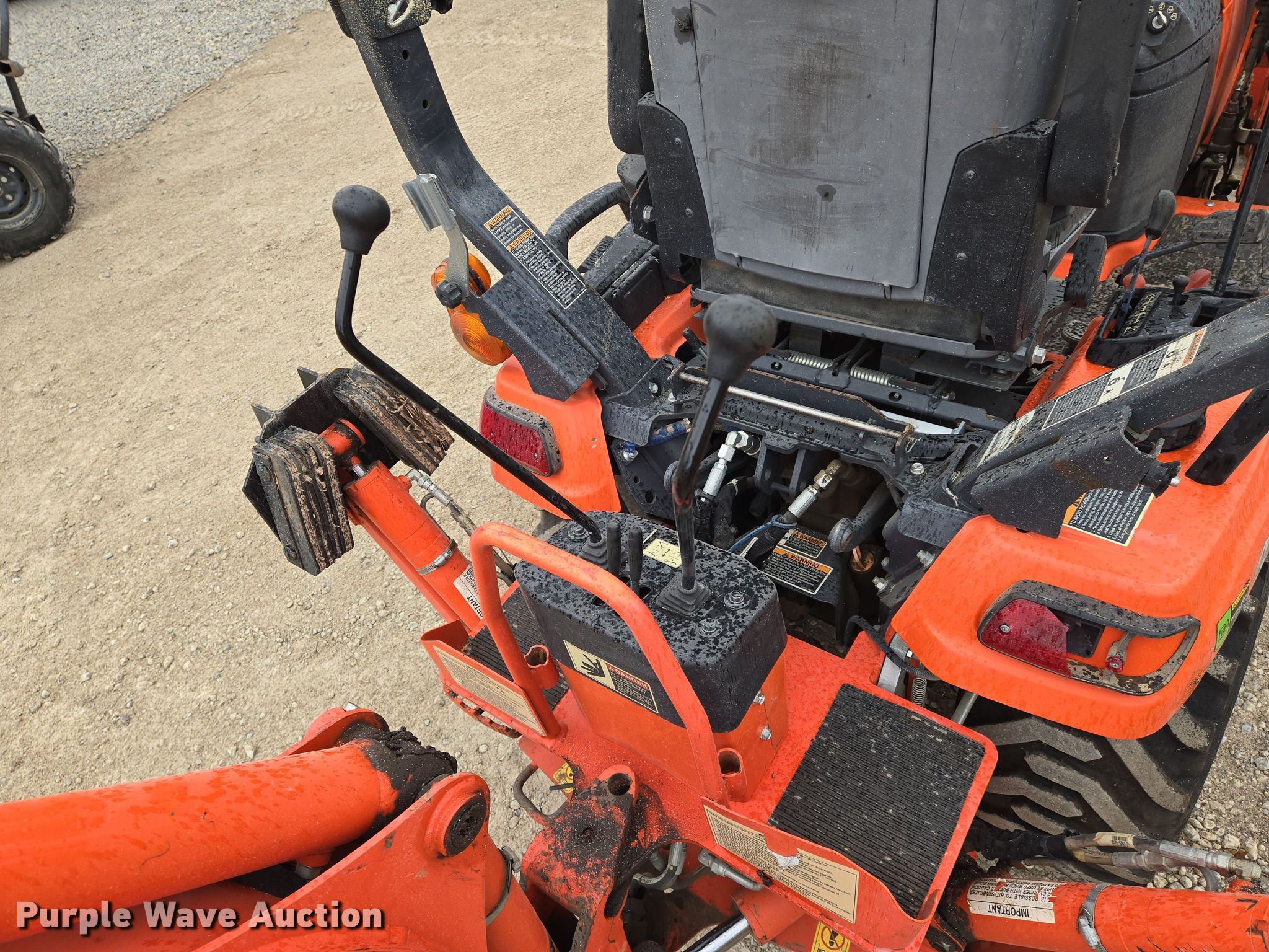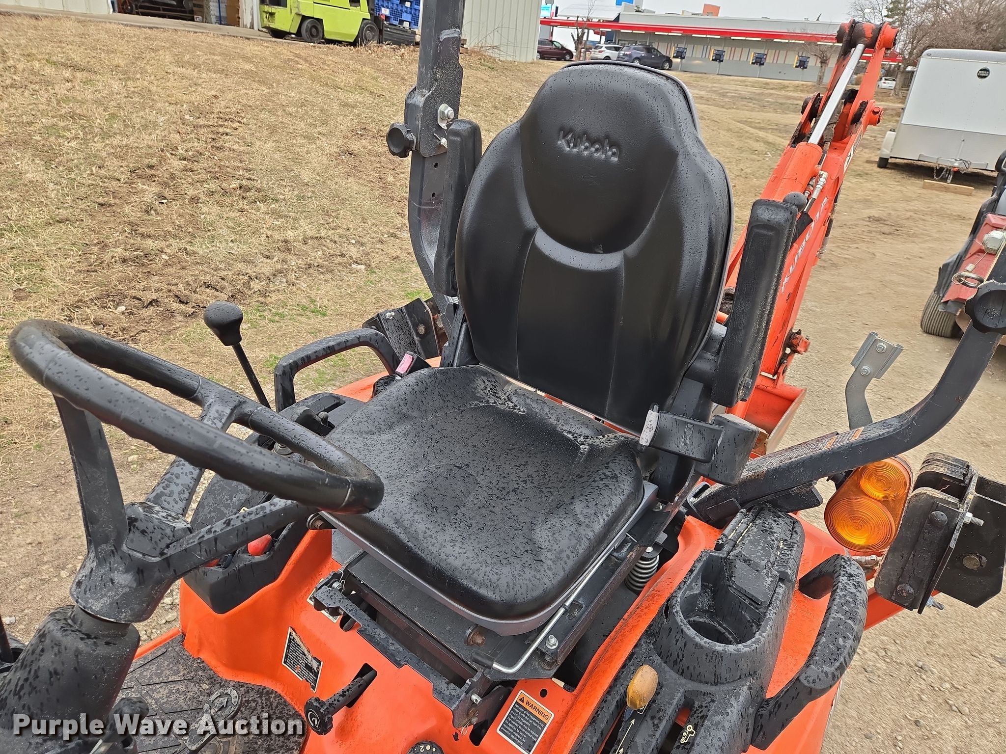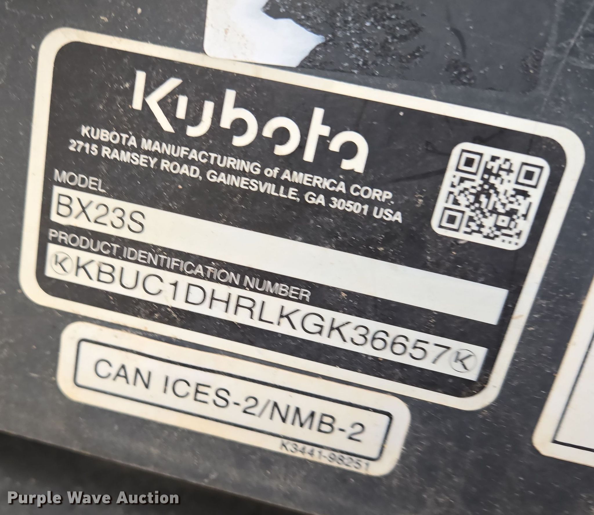 2020 Kubota BX23S MFWD tractor. Hours: 691 on meter, Serial: KBUC1DHRLKGK36657. Engine Kubota D902, Displacement: 0.898L, Cylinders: 3, Fuel type: Diesel. Transmission Hydrostatic, Differential lock. Features PTO: 540, Hydraulic remote sets Front: 2, Rear: 1, Loader Kubota LA340, Controls: Joystick, Bucket Width: 48", Backhoe Kubota BT603, Stick: 32", Bucket controls: Two lever, Bucket Width: 12", Teeth: 3.. Tires Front: 13x8.50-10, Rear: 26x12-12. QP Distribution. Mulvane, KS 67110