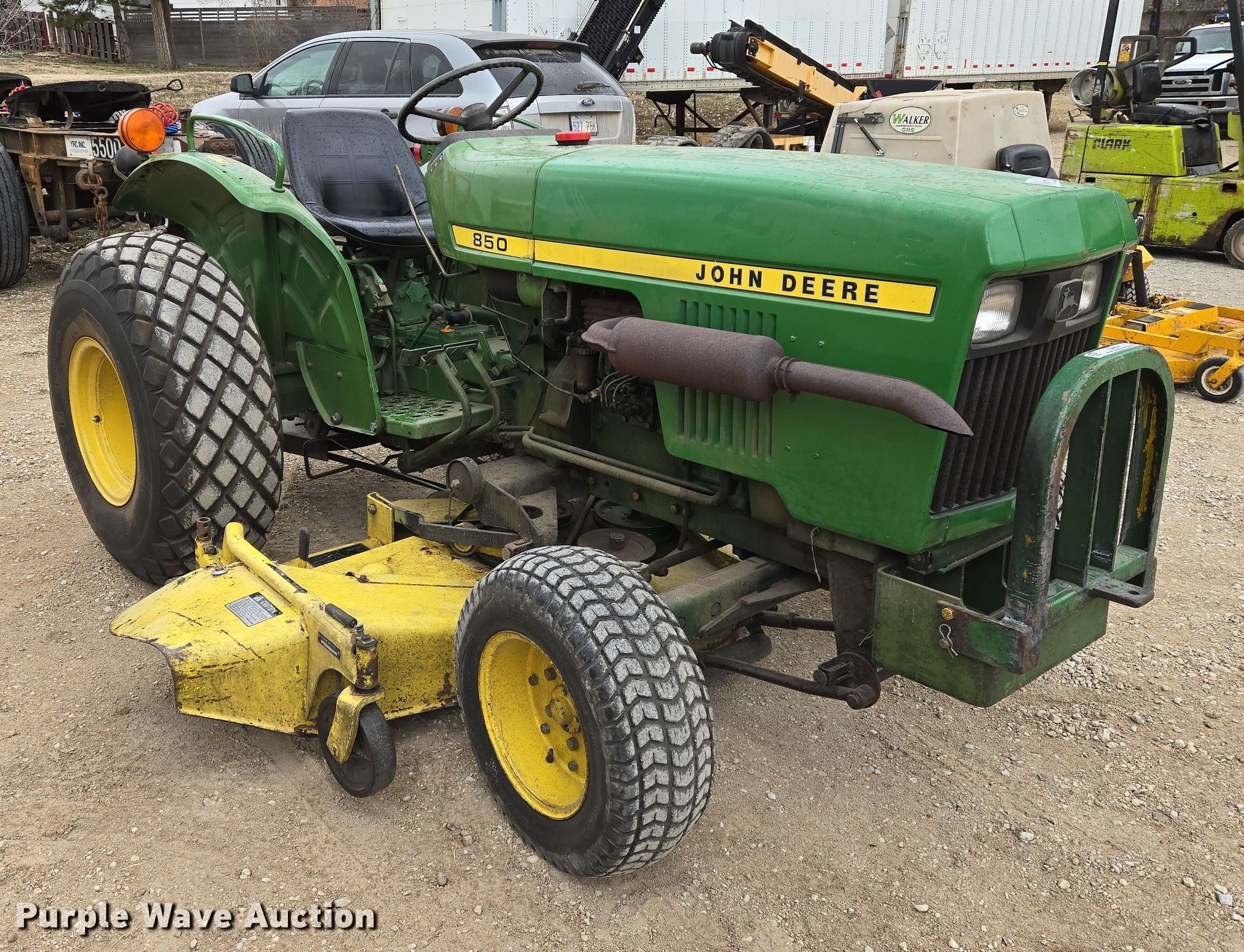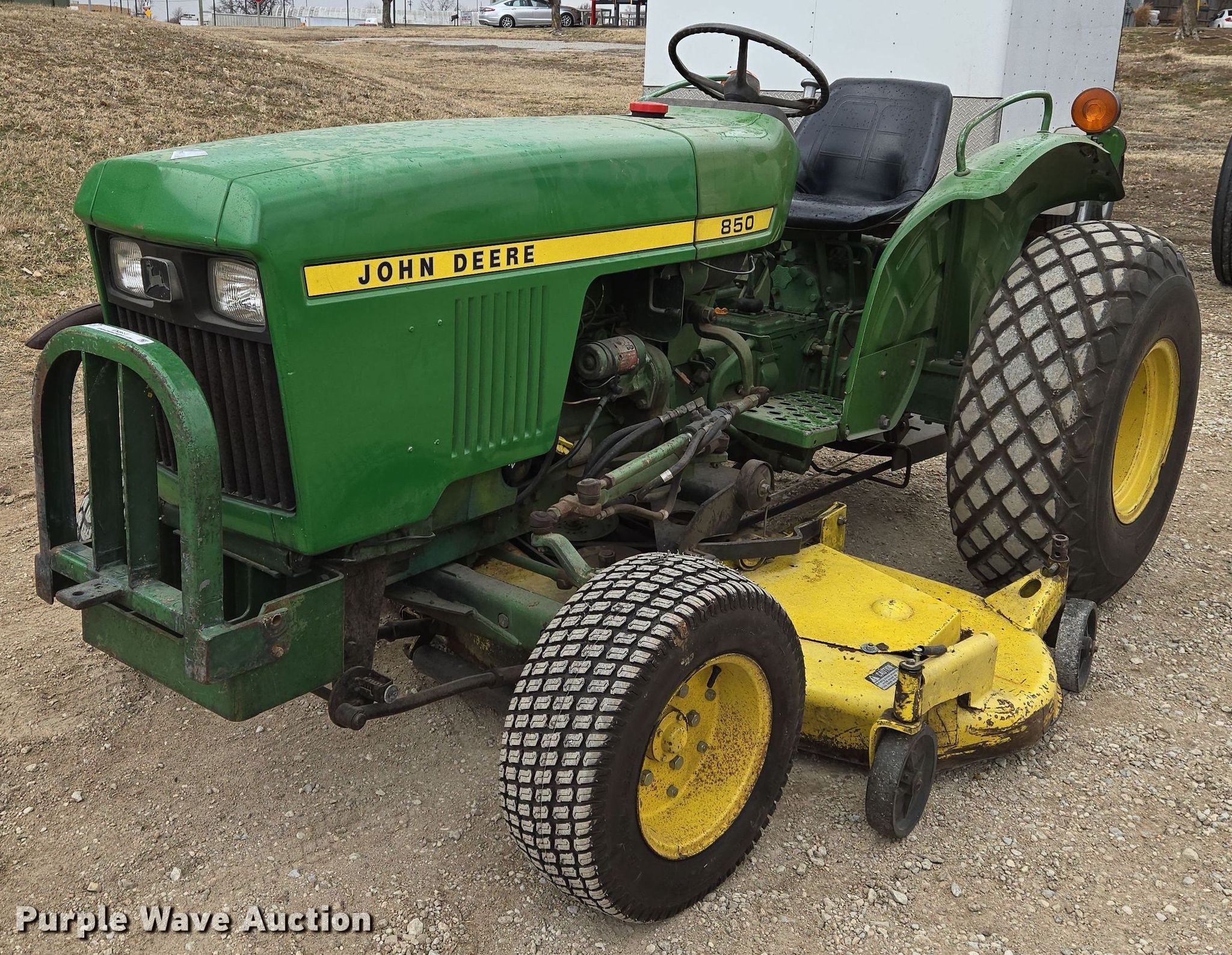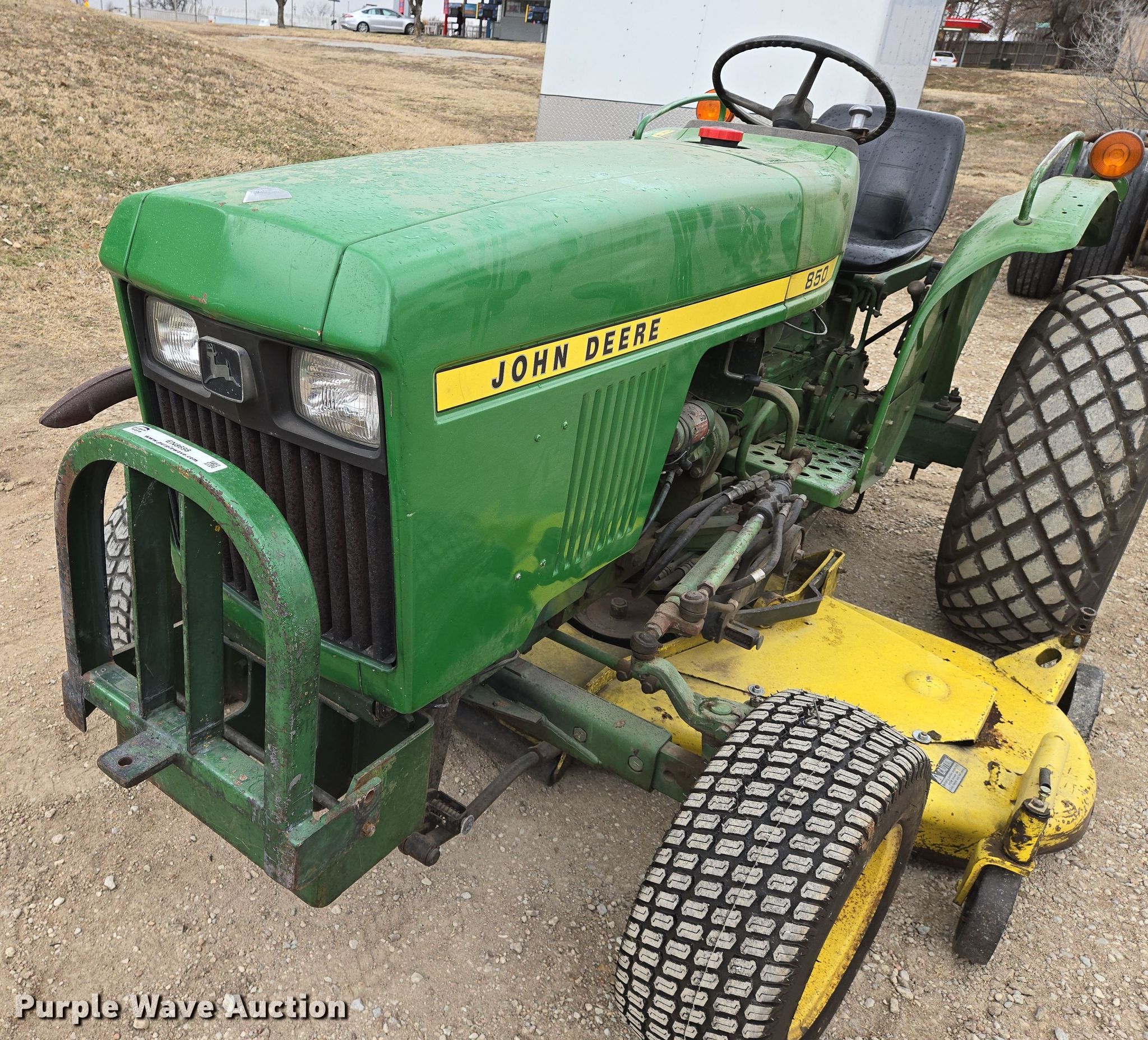 John Deere 850 tractor. Hours: 2,163 on meter. Engine Yanmar, Cylinders: 3, Fuel type: Diesel. Transmission Manual, 8F - 2R. Features PTO: 540, Rotary mower John Deere H072G, Serial: 381005M, Cutting width: 72". Tires Front: 23x8.50-12, Rear: 13.6-16. QP Distribution. Mulvane, KS 67110