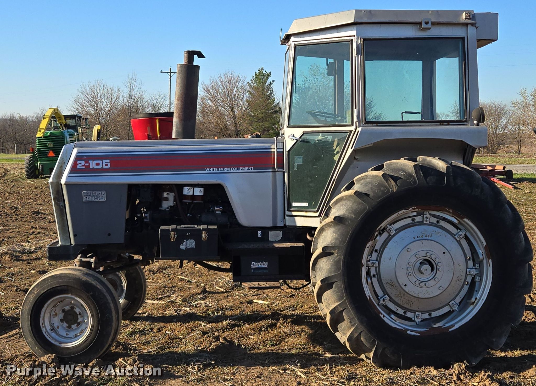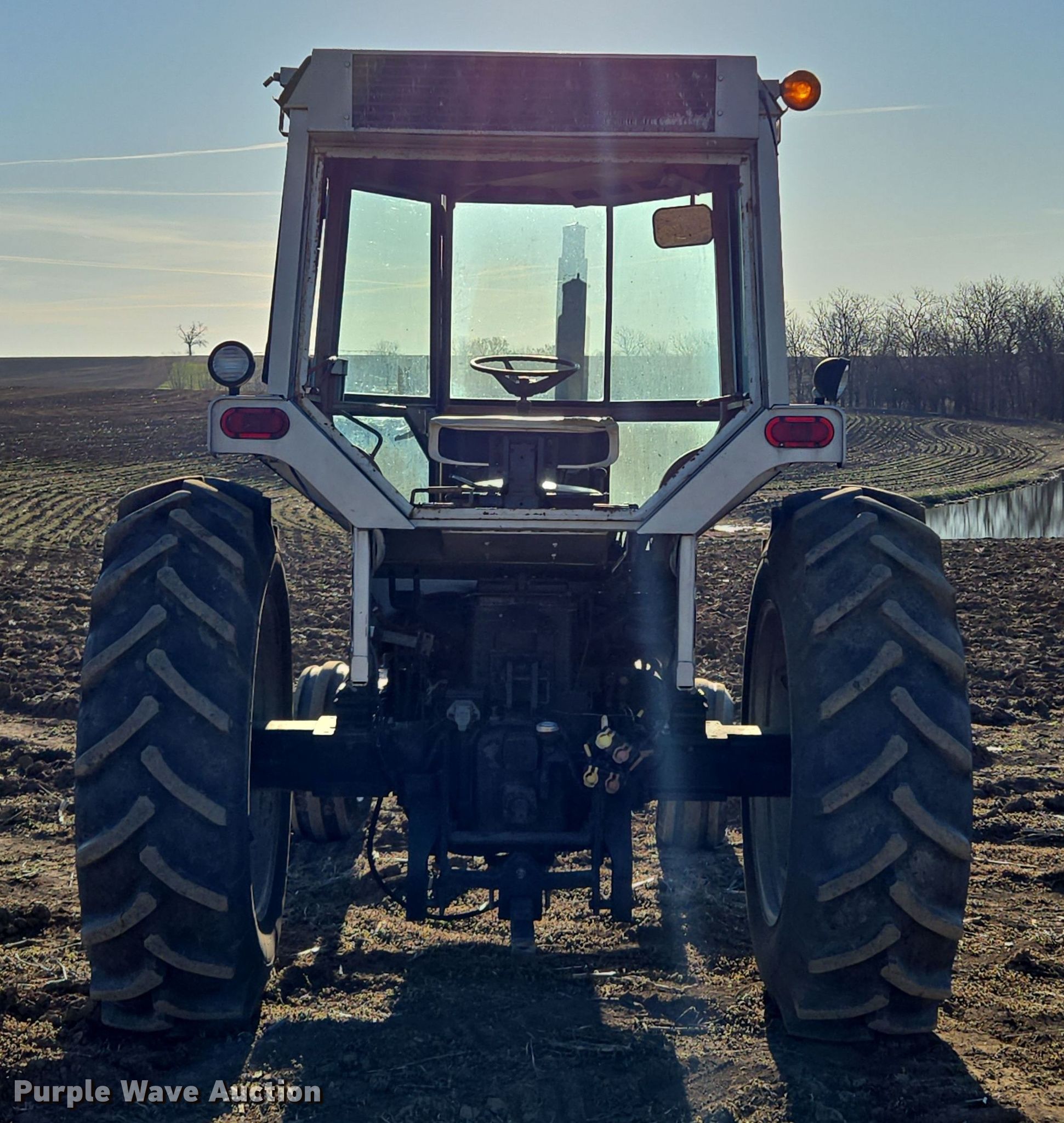 1976 White 2-105 tractor. Hours: 880 on meter, Serial: 269797. Engine Cylinders: 6, Fuel type: Diesel. Transmission Powershift, 18F - 6R. Operators station AC, Heat. Features PTO: 540, Three point, Hydraulic remote sets Rear: 2. Tires Front: 11L-15, Rear: 18.4-38. Notes Three point arms removed, but included, Additional parts included, Back glass missing, Unknown operating condition of AC. Heins Family Farms, LLC. Higginsville, MO 64037