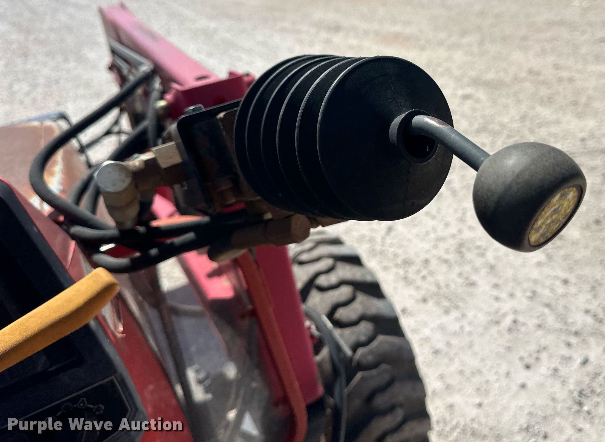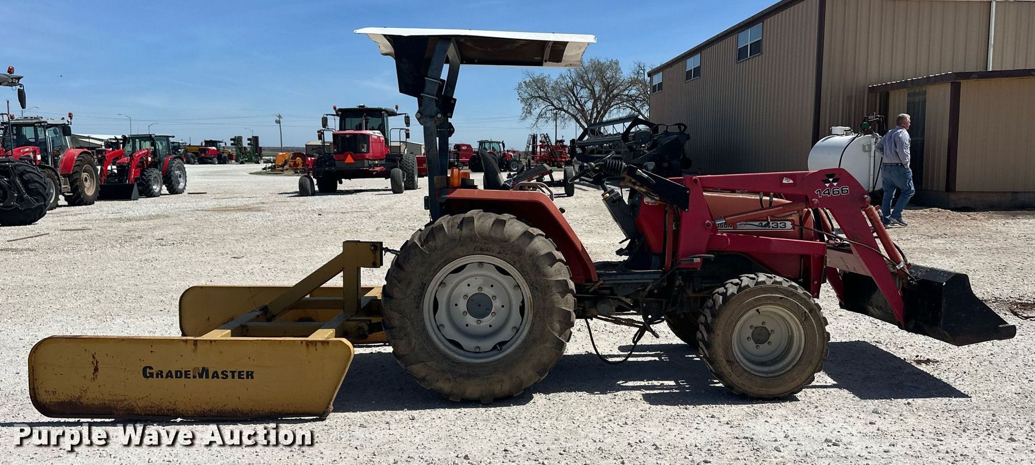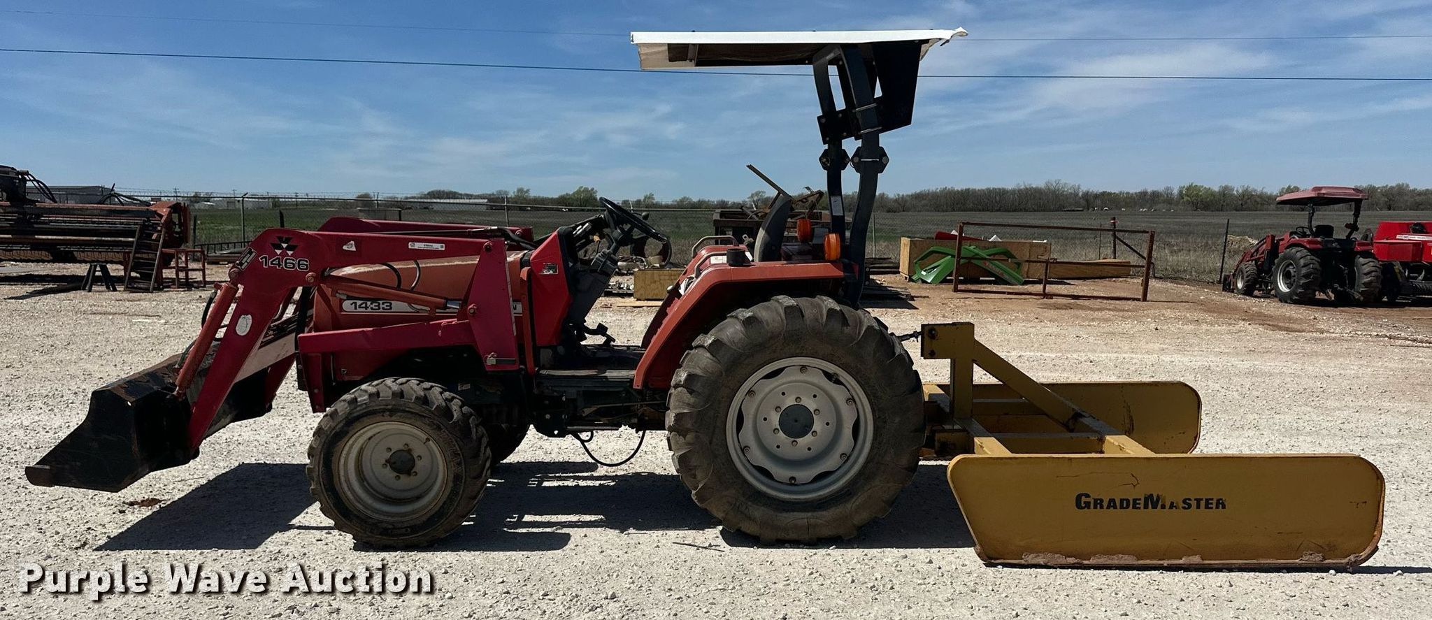 2004 Massey Ferguson 1433 MFWD tractor. Hours: 833 on meter, Serial: N-G2206. Engine Cylinders: 3, Fuel type: Diesel. Transmission Synchro, 16F - 16R, Left-hand reverser, Differential lock. Features PTO: 540, Three point Top link, Loader Massey Ferguson 1466, Quick attach, Controls: Joystick, Bucket Width: 60", Grade Master land leveler Hitch: Three point, Width: 6'. Tires Front: 10-16.5, Rear: 14.9-24. Parallel Ag. 2005 North Main Street. Fairview, OK 73737