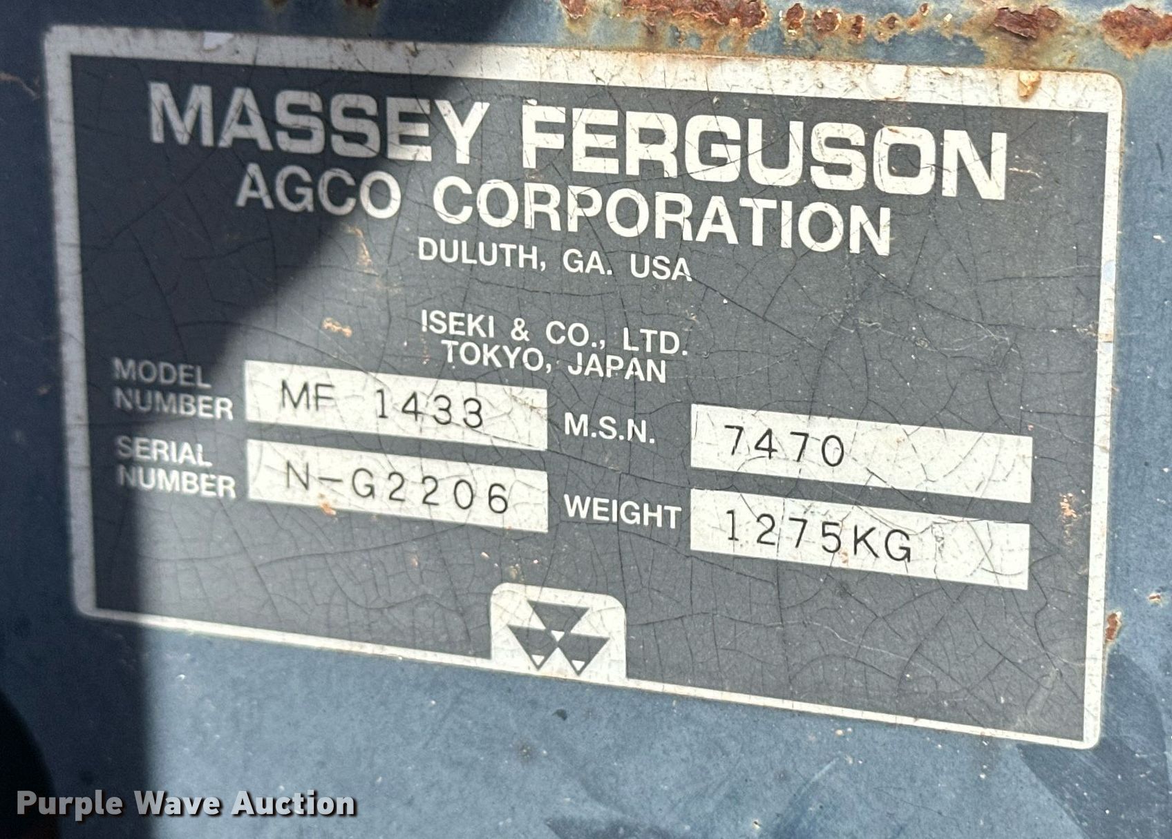 Purple Wave is selling a used Tractor in Oklahoma. This item is a 2004 Massey Ferguson 1433 MFWD tractor with the following: Hours: 833 on meter, Serial: N-G2206