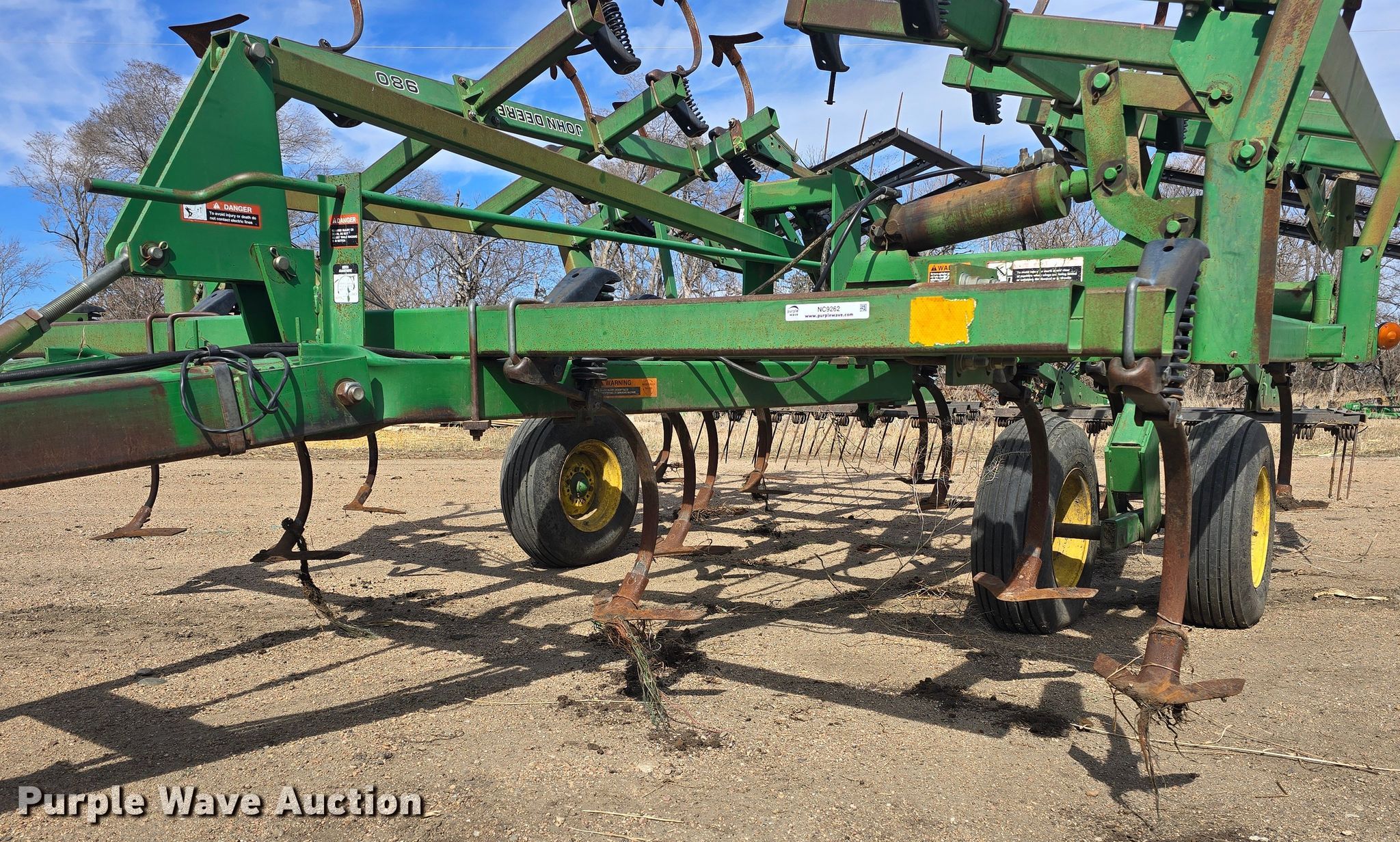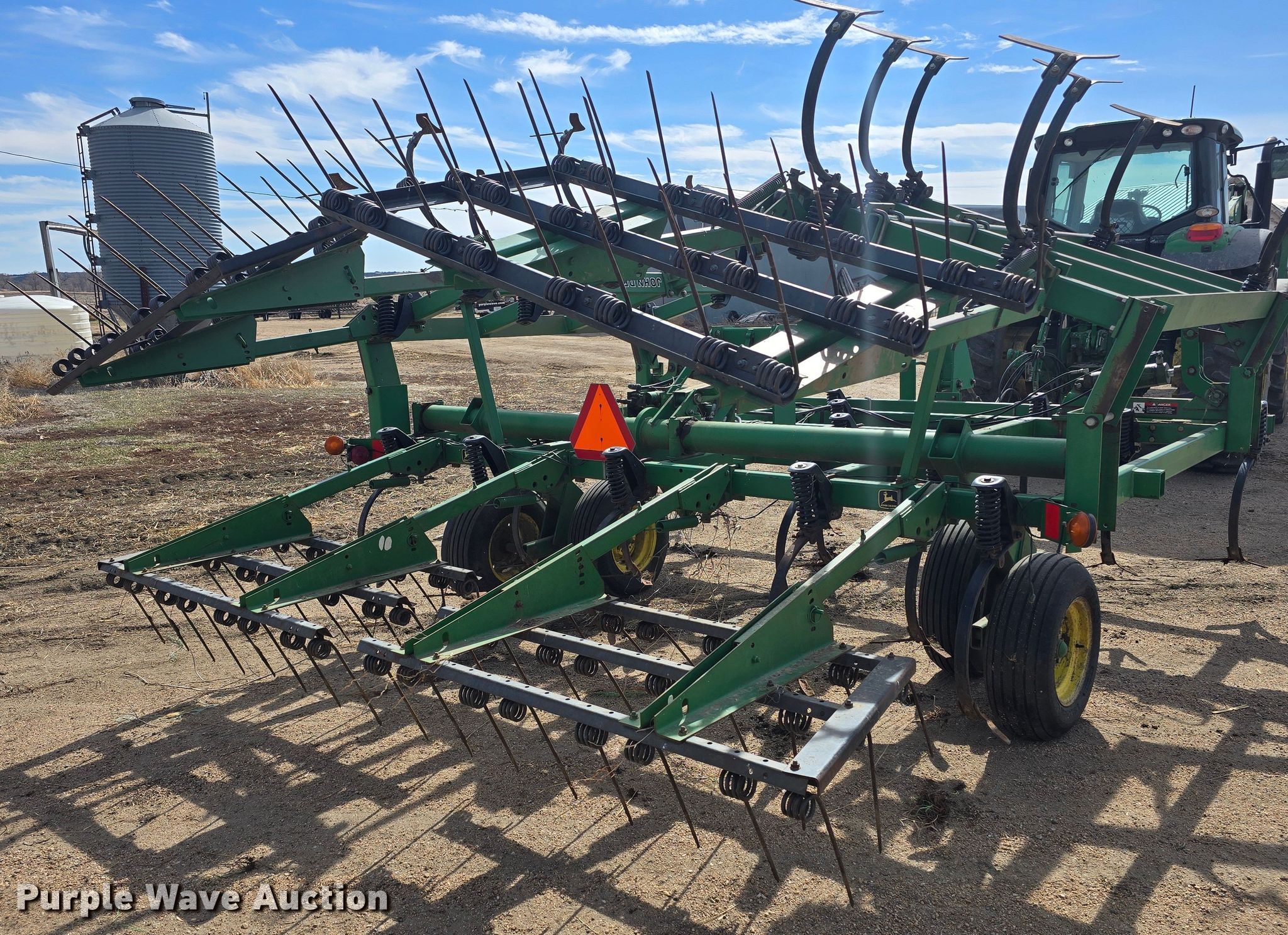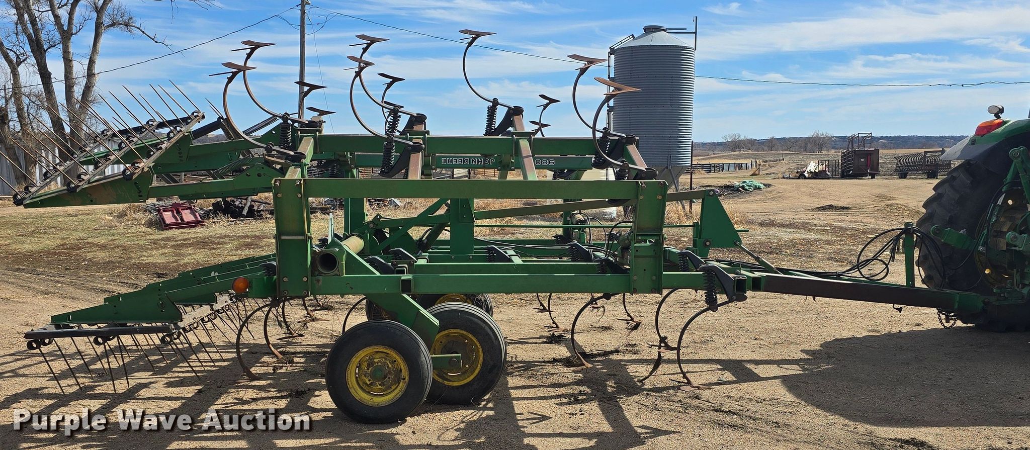 John Deere 980 field cultivator. Overall width: 22' 6", Serial: N00980X009960. Features Shanks: 32, Sweep width: 12", Operation Hydraulic lift, Hydraulic fold, Leveler: Manual, Walking tandem axle, Attachments Tine harrow Harrow bars: 3, Transport lights. Tires Tire size: 9.5L-15. Notes Tractor not included. Niobrara, NE 68760