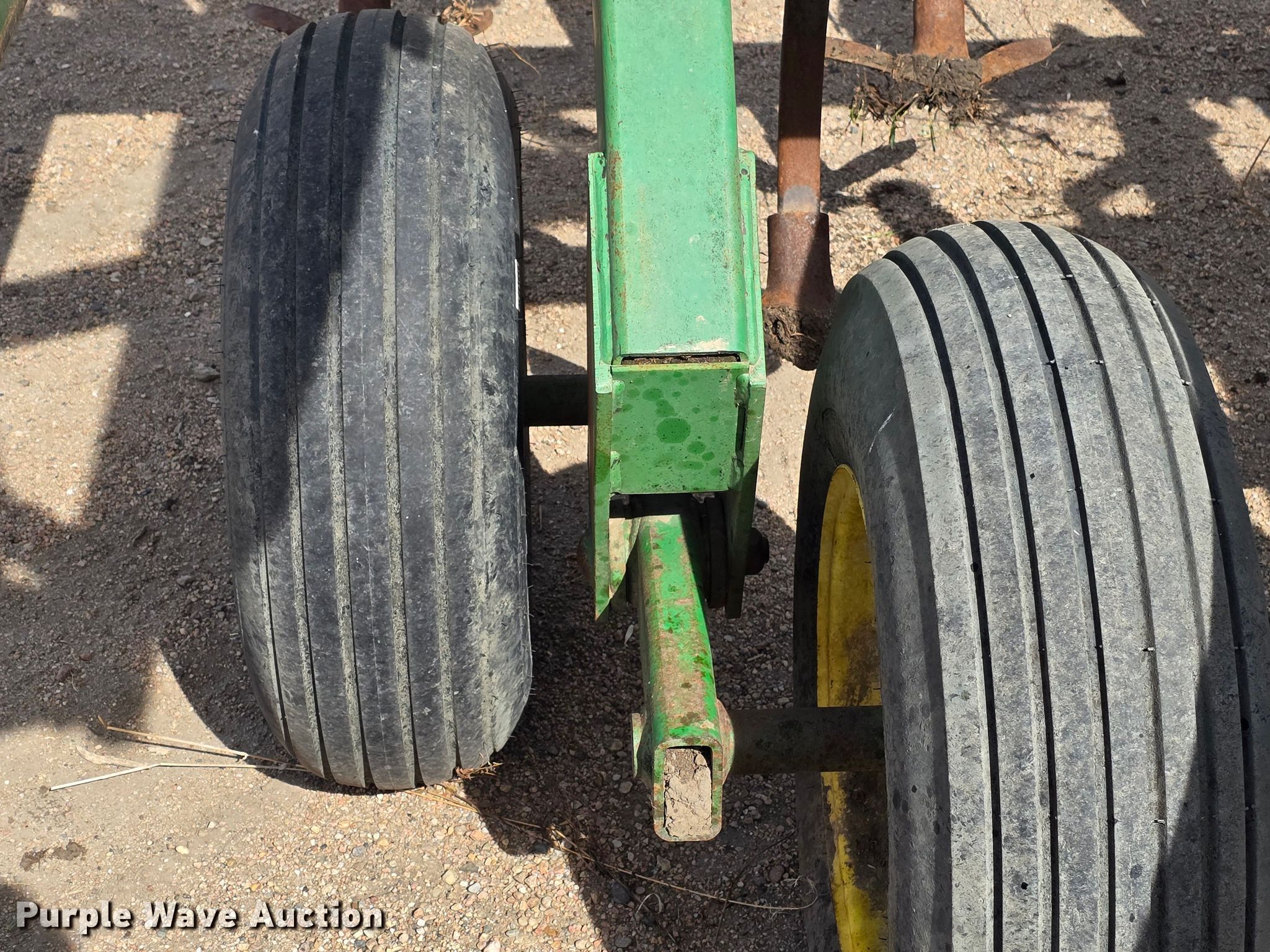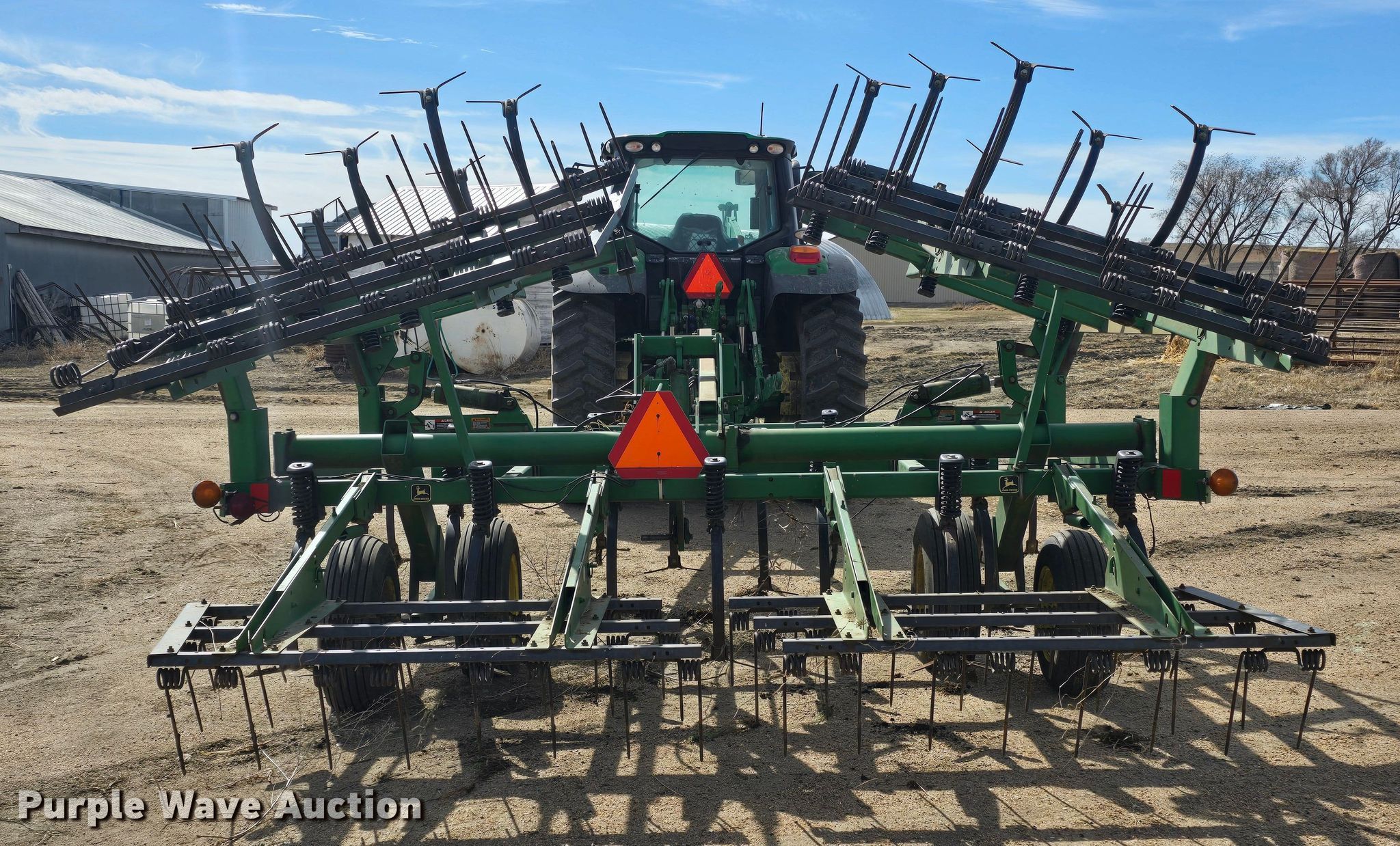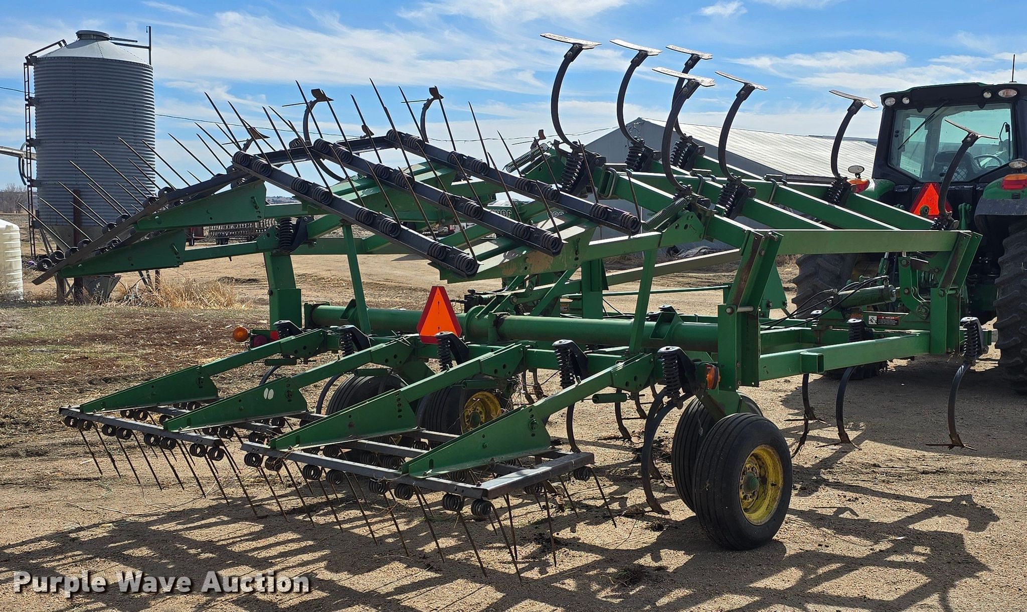 John Deere 980 field cultivator. Overall width: 22' 6", Serial: N00980X009960. Features Shanks: 32, Sweep width: 12", Operation Hydraulic lift, Hydraulic fold, Leveler: Manual, Walking tandem axle, Attachments Tine harrow Harrow bars: 3, Transport lights. Tires Tire size: 9.5L-15. Notes Tractor not included. Niobrara, NE 68760