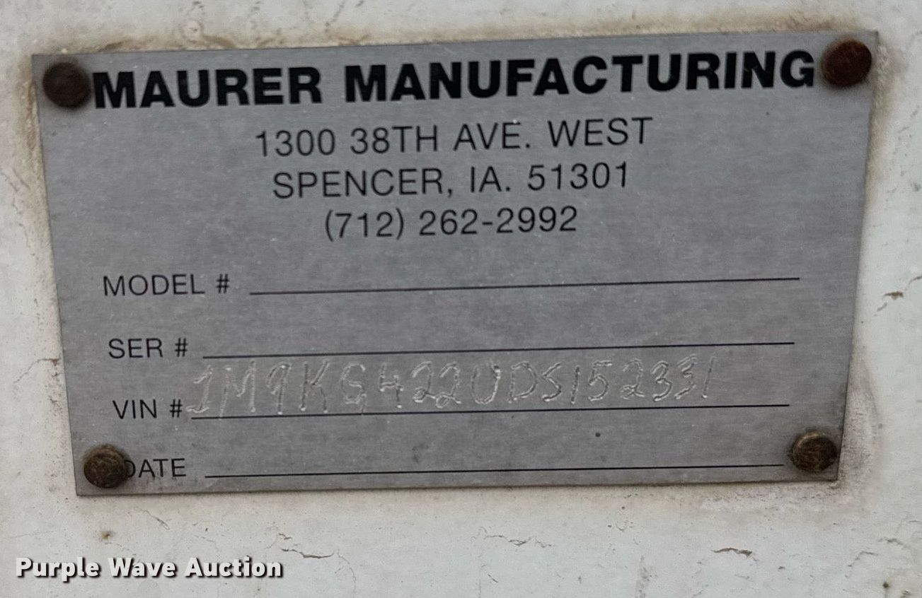 2013 Maurer grain trailer. VIN: 1M9KG4220DS152331. Dimensions Overall: 42' L x 98" W, Side height: 60". Features Body type: Steel, Hoppers: Double Trap gates: Manual, Roll tarp, Rear Sight windows. Chassis Landing gear: Dual, Suspension: Spring, Brakes: Air, Axles: Tandem, GVWR: 68,000 lbs, GAWR: 22,500 lbs. Tires Steel wheels, Size: 285/75R24.5. Pursuant to Kansas law, Purple Wave will not be collecting sales taxes on any of the purchases made in this business liquidation auction.. Kansas title. Title distribution may be delayed up to 14 days from verification of funds. Hock Farms Inc. Retirement - Open Inspection April 15. 2815 U.S. 83. Oakley, KS 67748