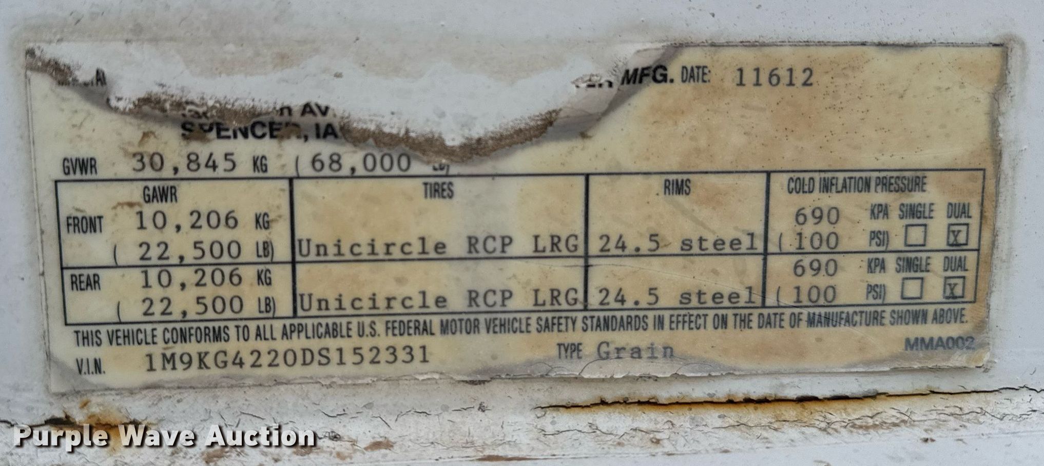 Purple Wave is selling a used Grain or Commodity Trailer in Kansas. This item is a 2013 Maurer grain trailer with the following: VIN: 1M9KG4220DS152331