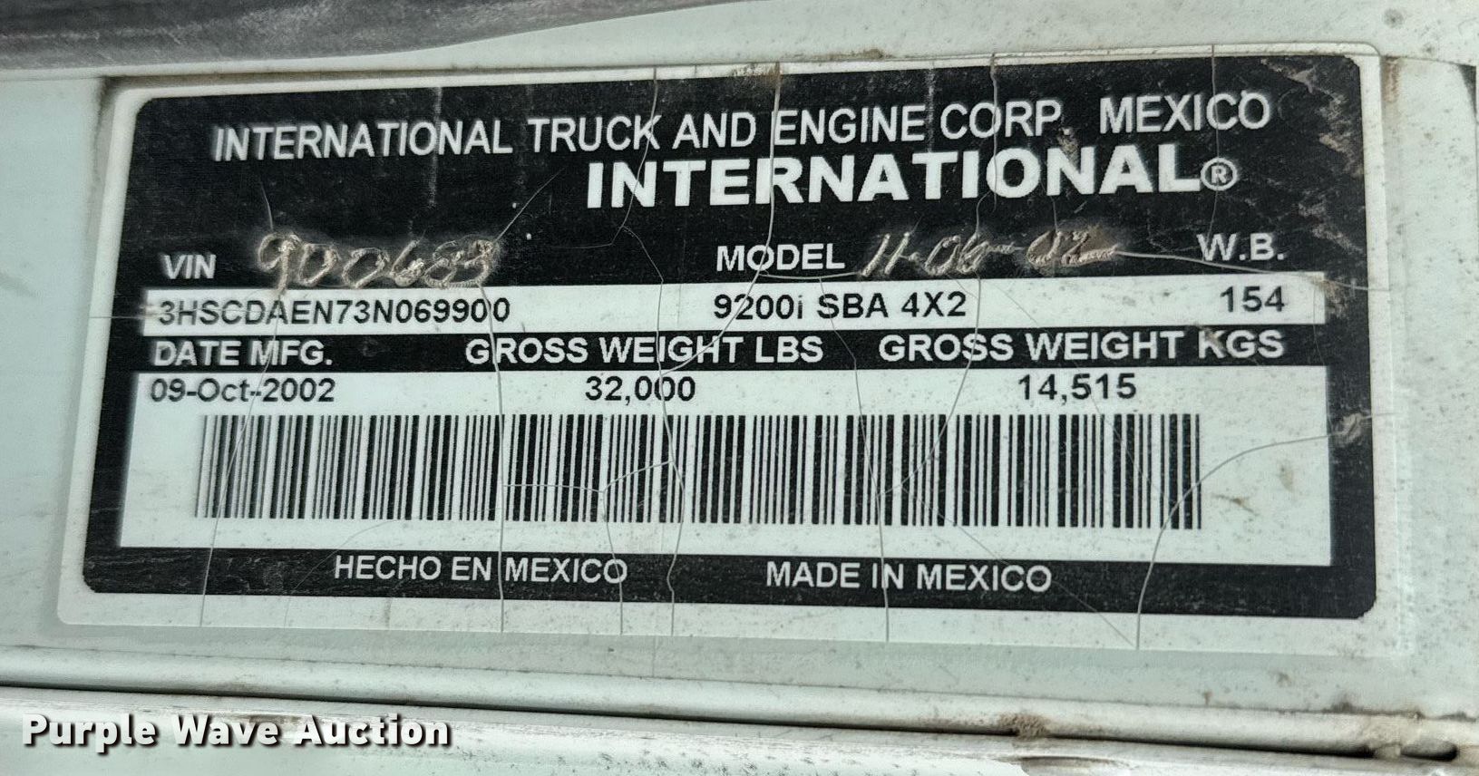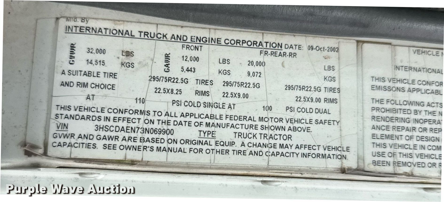 2003 International 9200i semi truck. Miles: Unknown, VIN: 3HSCDAEN73N069900. Engine Cummins N14 Plus, Displacement: 14L, Cylinders: 6, Fuel type: Diesel, Engine brake. Transmission Meritor, Manual, Speed: 10. Chassis Axles: Single, Suspension: Air, Brakes: Air, GVWR: 32,000 lbs FAWR: 12,000 lbs, RAWR: 20,000 lbs, Wheelbase: 154". Interior AC, Heat, Heated mirrors, Power windows, Power locks, Cruise control. Features Deck plate: Aluminum, Fifth wheel type: Air operated, Sliding, Fuel tank: Dual. Tires Front: 275/80R22.5, Rear: 11R22.5. Notes Dash warning indicator: ABS, Windshield chipped or cracked. Pursuant to Kansas law, Purple Wave will not be collecting sales taxes on any of the purchases made in this business liquidation auction.. Kansas title. Mileage has not been verified. Exempt will be written in the odometer disclosure on the title. Title distribution may be delayed up to 14 days from verification of funds. Hock Farms Inc. Retirement - Open Inspection April 15. 2815 U.S. 83. Oakley, KS 67748