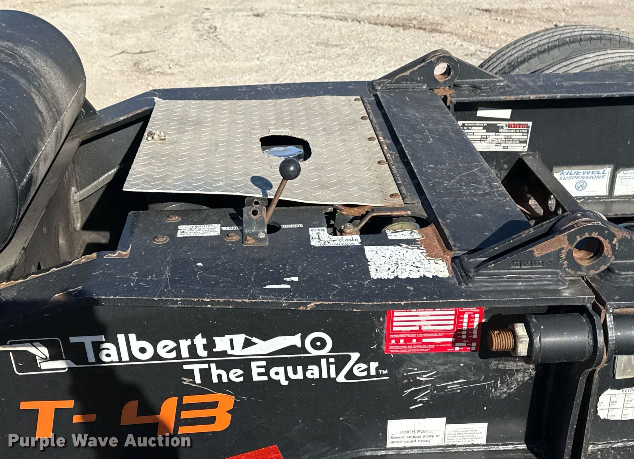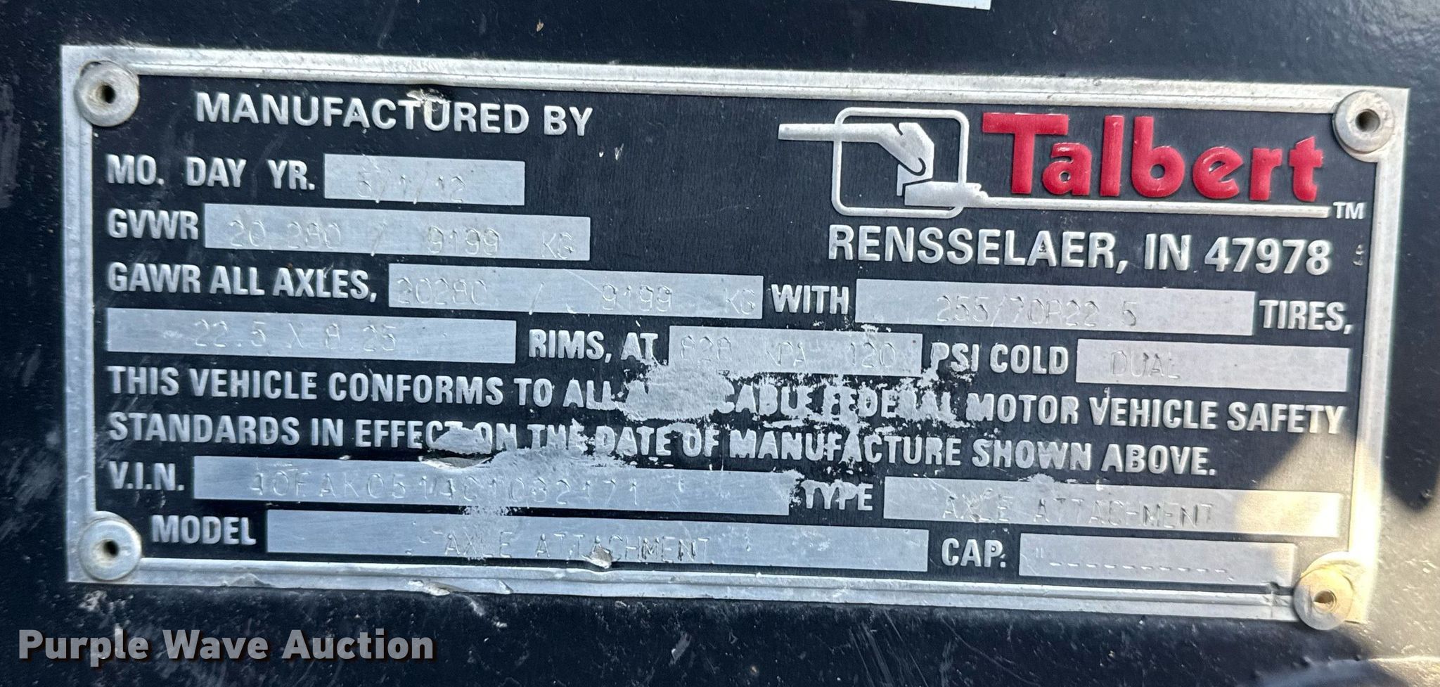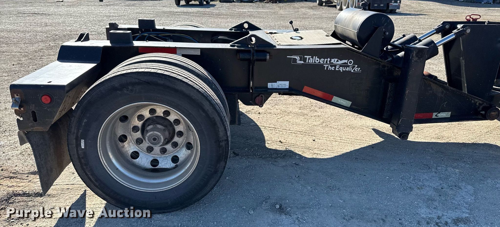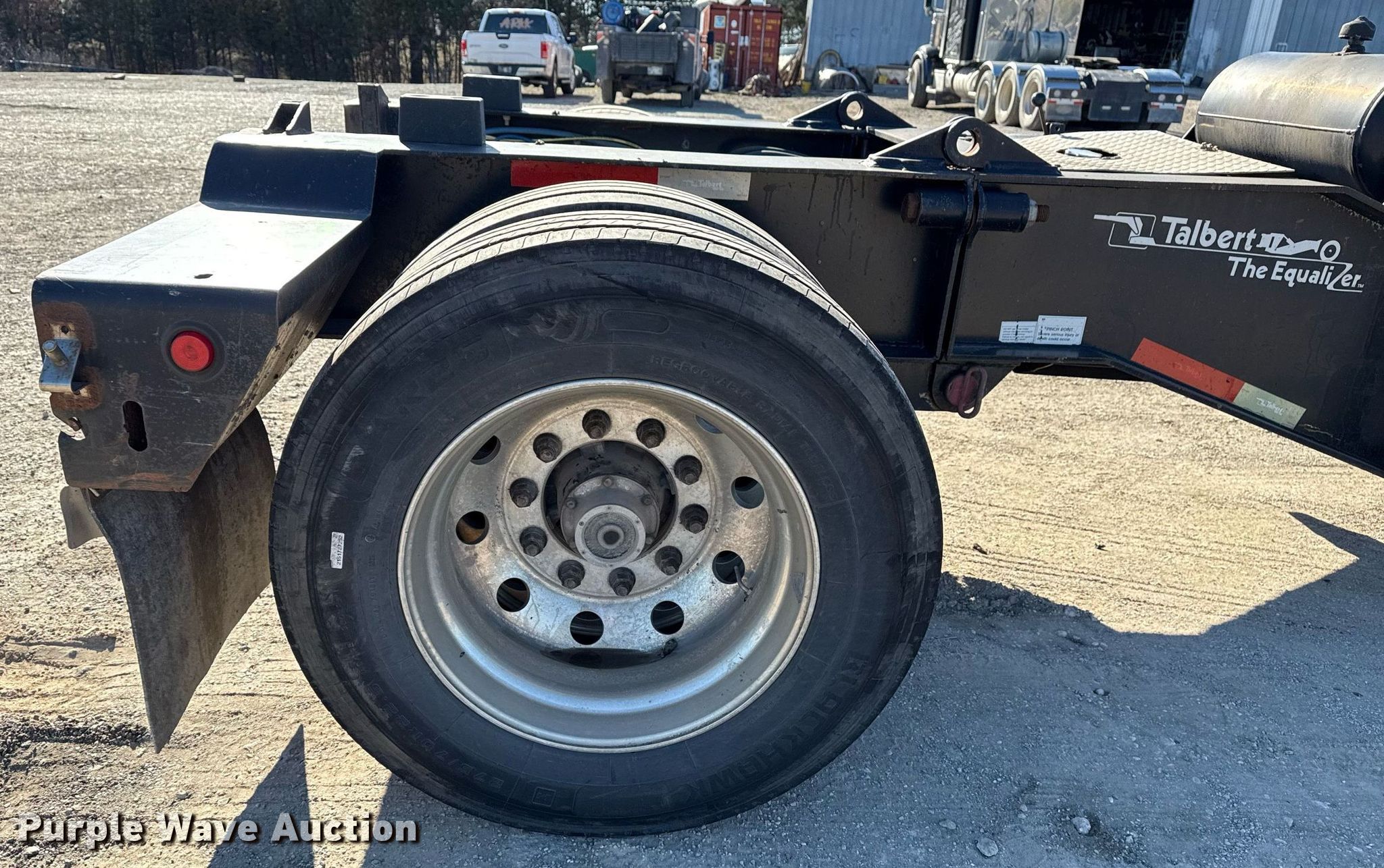 1996 Talbert 60T lowboy beam trailer. VIN: 40FWK7855T1014078. Dimensions Overall: 83' L x 102" W, Deck: 30' L x 48" W, Rear deck length: 14'. Features Deck type: Steel, Neck type: Detachable, Self-contained hydraulics, Hydraulic controls: Manual. Chassis Suspension: Air, Brakes: Air, Axles: Triple, GVWR: 165,000 lbs, GAWR: 20,280 lbs. Tires Aluminum wheels, Size: 275/70R22.5. 2012 Talbert stinger axle VIN: 40FAK0514C1032171. Chassis GVWR: 20,280 lbs. 1996 Talbert detachable tag axle VIN: 40FAK0513T1014079. Trailer: Oklahoma title. Detachable tag: Oklahoma title. Stinger: Oklahoma title. Title distribution may be delayed up to 14 days from verification of funds.. ARKK Trucking Inc. Sand Springs, OK 74063