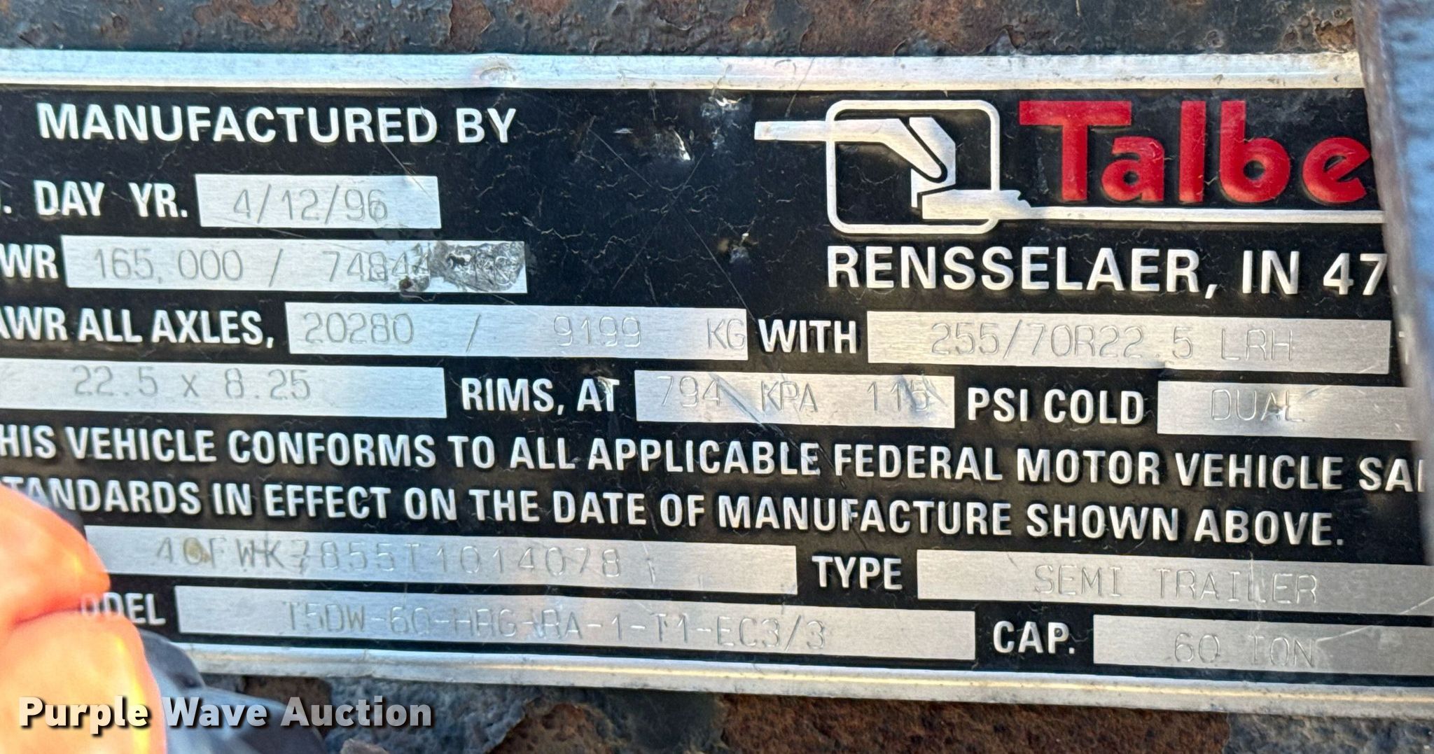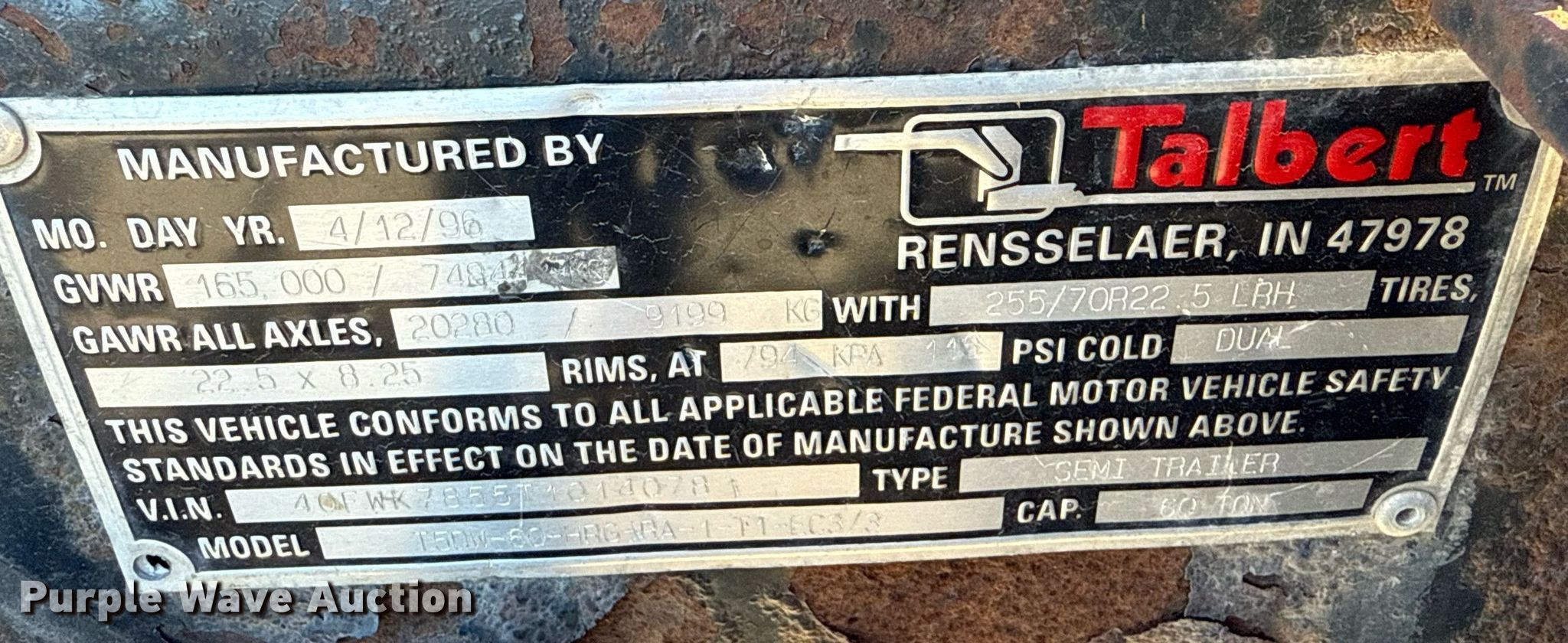Purple Wave is selling a used Equip. Trailer in Oklahoma. This item is a 1996 Talbert 60T lowboy beam trailer with the following: VIN: 40FWK7855T1014078