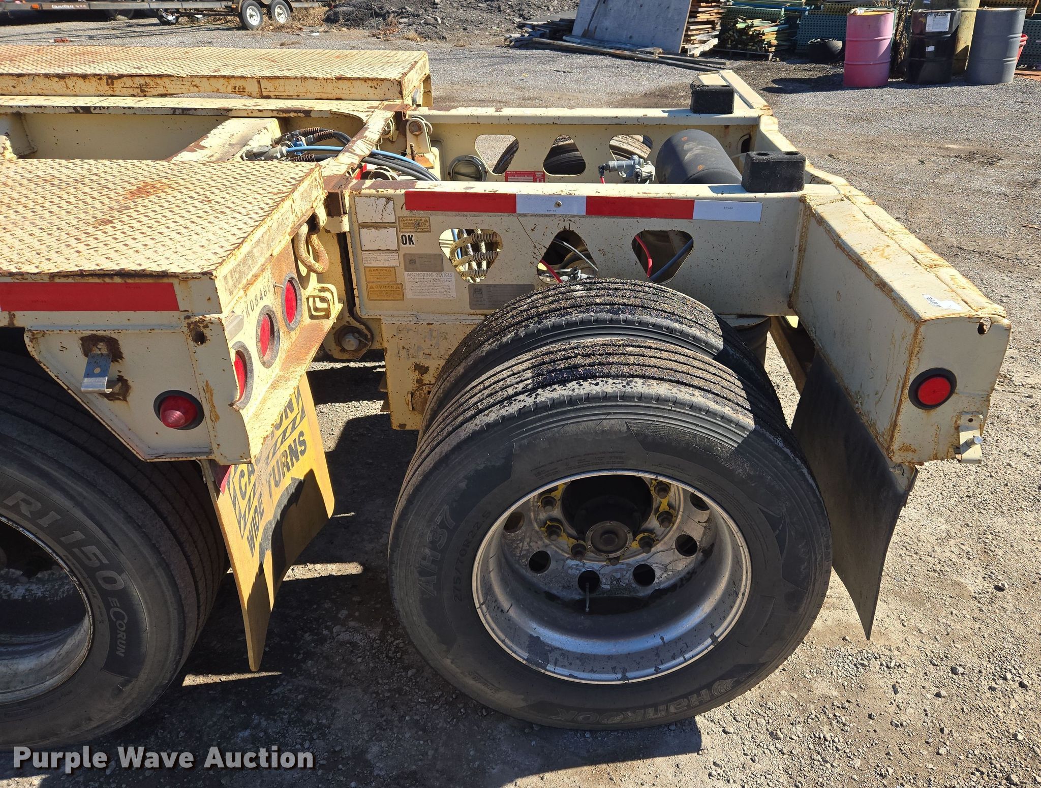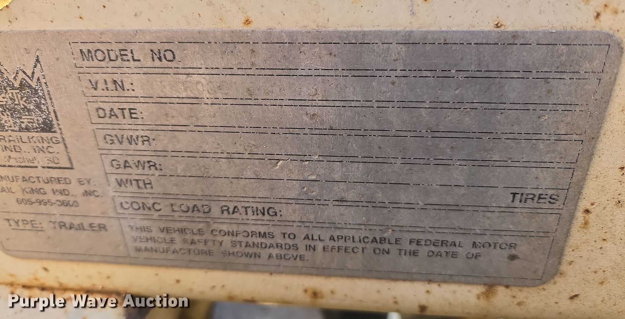 2009 Trail King TK110HDG-523 lowboy equipment trailer. VIN: 1TK1052369497969. Dimensions Overall: 52' 3" L x 8' 6" W, Deck: 24' L x 8' 6" W, Rear deck length: 11' 8". Features Deck type: Steel, Wood, Outriggers: Swing-out, Neck type: Detachable, Self-contained hydraulics, Hydraulic controls: Manual. Chassis Suspension: Air, Brakes: Air, Axles: Triple, GVWR: 100,000 lbs, GAWR: 20,280 lbs. Tires Aluminum wheels, Size: 275/70R22.5. 2011 Trail King TK22FA-051 flip axle VIN: 1TKR00511BM043291. Dimensions Overall: 4' 6" L x 102" W. Chassis Suspension: Air, Brakes: Air, GVWR: 20,280 lbs. Tires Size: 275/70R22.5. Trailer: Oklahoma title. Tag axle: Oklahoma title. Title has a lien that will be released following the close of the auction. Title distribution may be delayed up to 30 days from verification of funds. ARKK Trucking Inc. Sand Springs, OK 74063