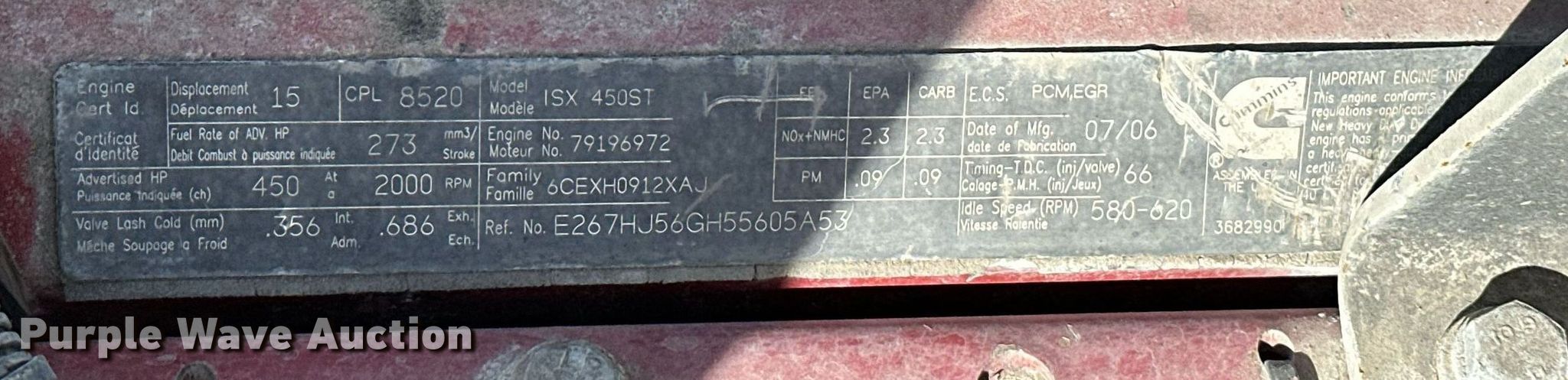 2007 Kenworth semi truck. Miles: Unknown, VIN: 2XKDD49X77M193729, Unit #: 204143. Engine Cummins ISX450ST, Serial: 79196972, Displacement: 15.0L, Cylinders: 6, Fuel type: Diesel, Engine brake. Transmission Eaton Fuller, Manual, Speed: 10. Chassis Axles: Tandem, Differential lock: Inter-axle, Suspension: Air Dump valves, Brakes: Air. Interior AC, Heat, Heated mirrors, Power locks, Cruise control, Air ride cab. Features Deck plate: Aluminum, Fifth wheel type: Air operated, Sliding, Fuel tank: Dual. Tires Front: 11R22.5, Rear: 11R24.5. Notes New images in FT, IMS updated. Oklahoma title. Mileage has not been verified. Odometer discrepancy will be marked on the title. Title distribution may be delayed up to 30 days from verification of funds. Dolese Bros Co. 5600 West Reno Avenue. Oklahoma City, OK 73127